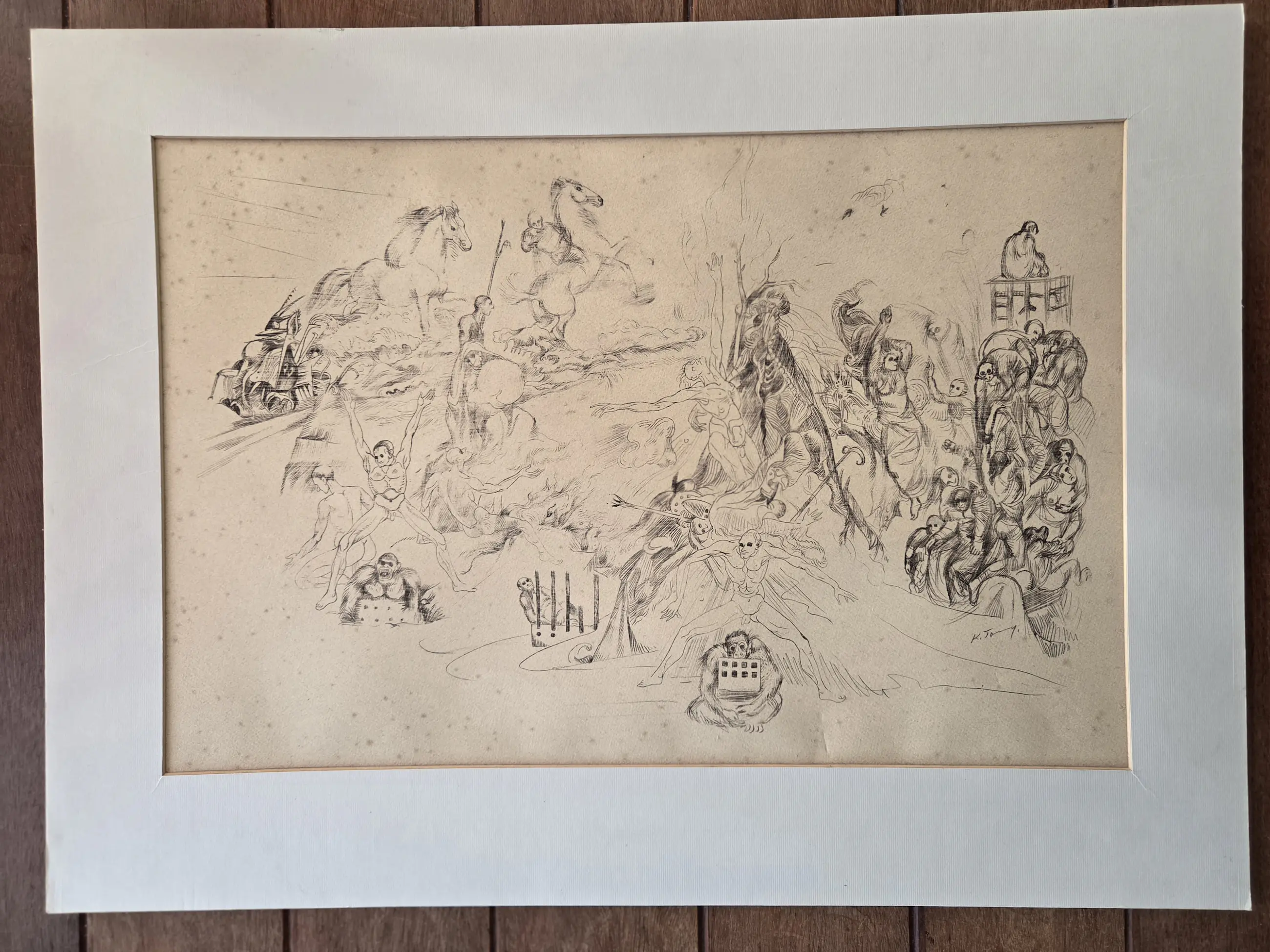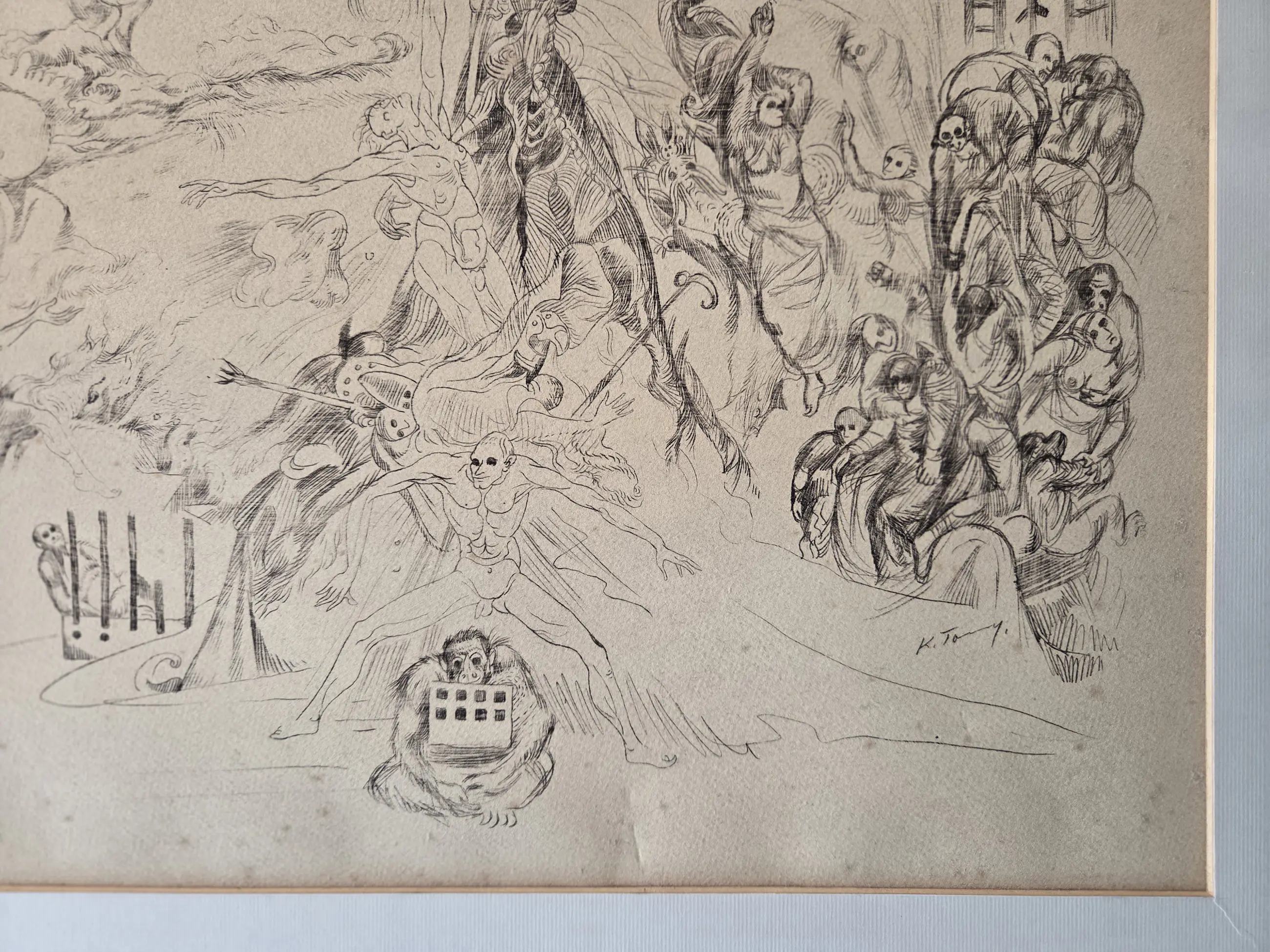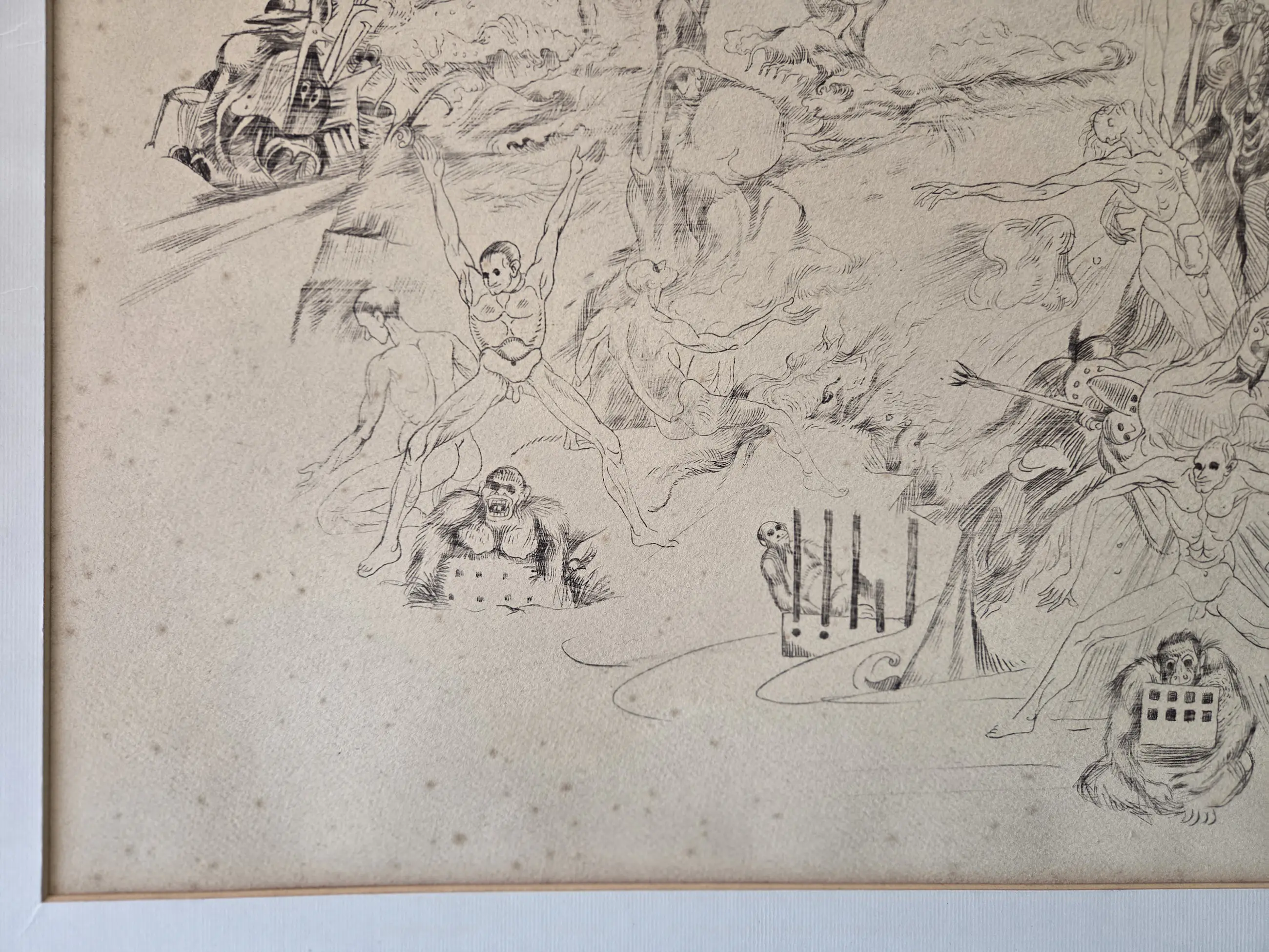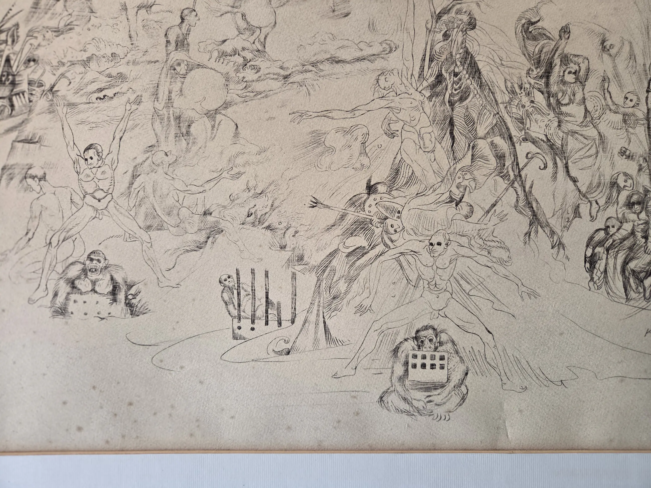 Fantastisch werk. Veel fantasiefiguren en details. In de sfeer van Jeroen Bosch en James Ensor. Gesigneerd en geannoteerd. Algemeen goede staat gezien ouderdom. Zie foto's voor eigen oordeel kwaliteit.