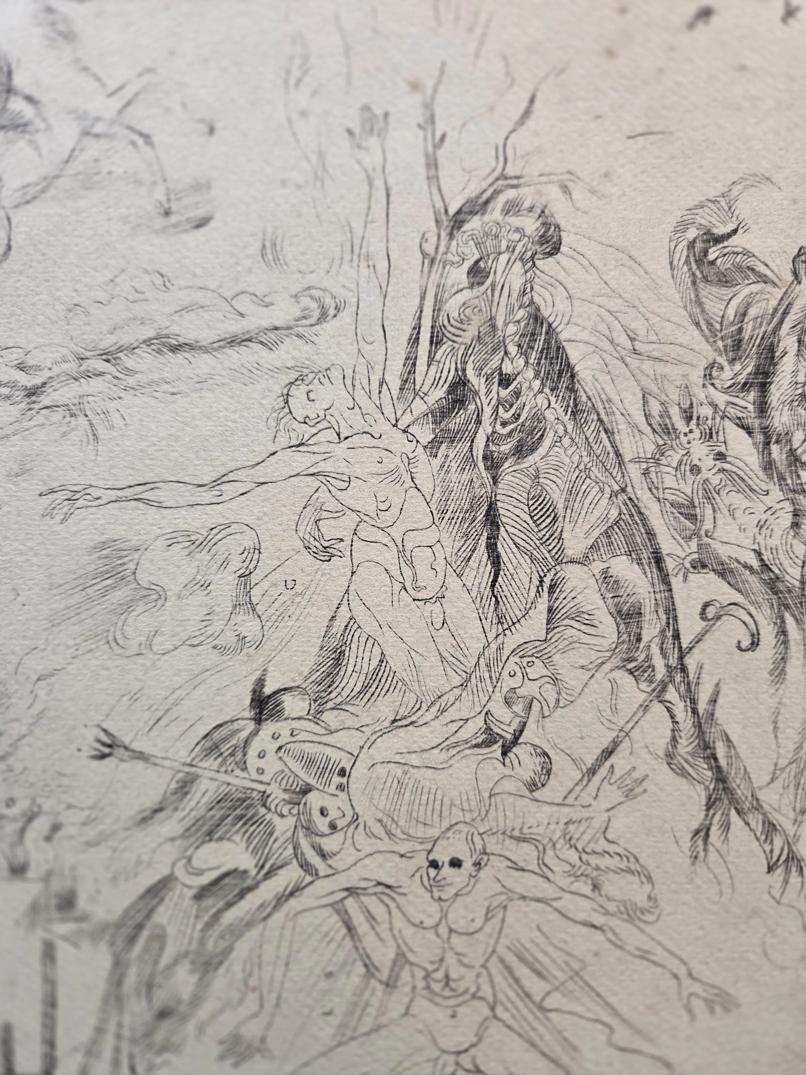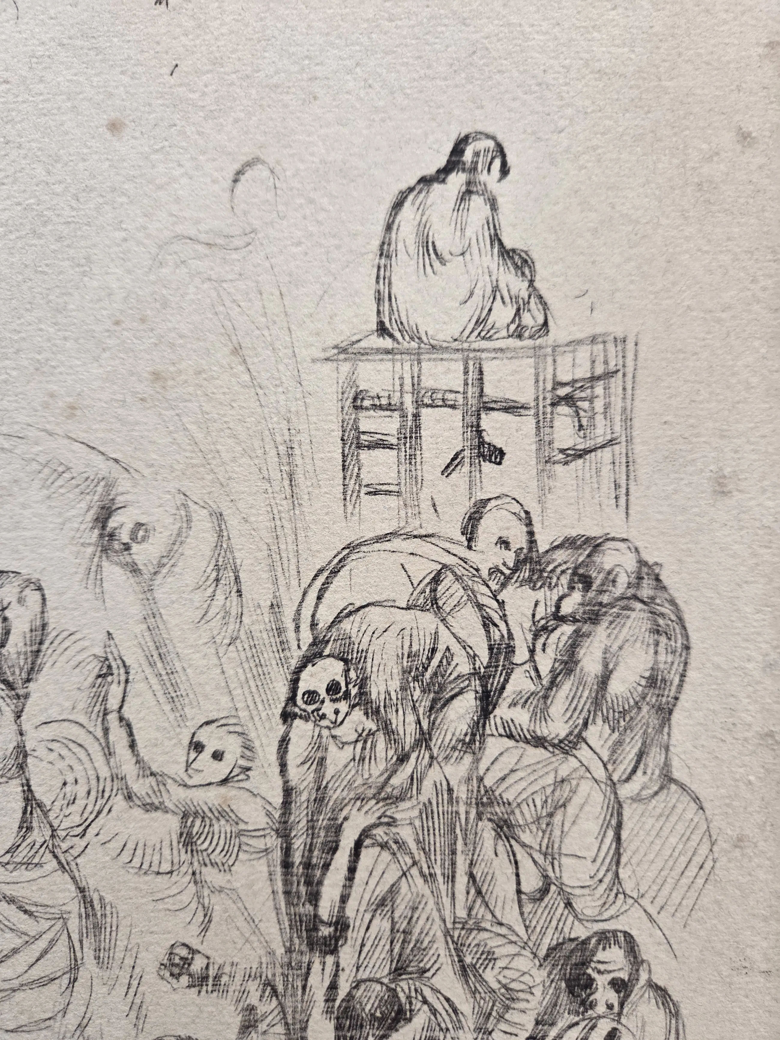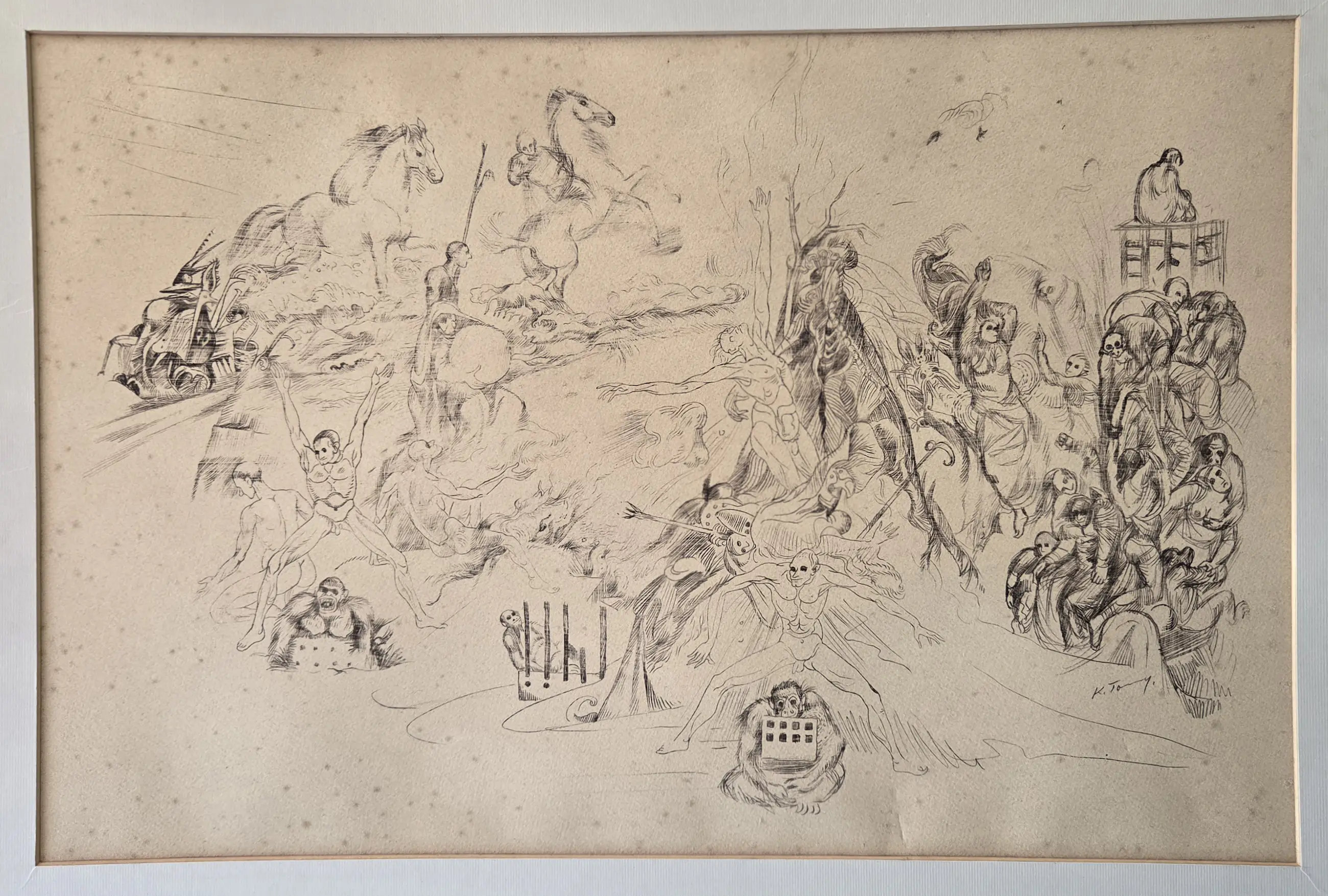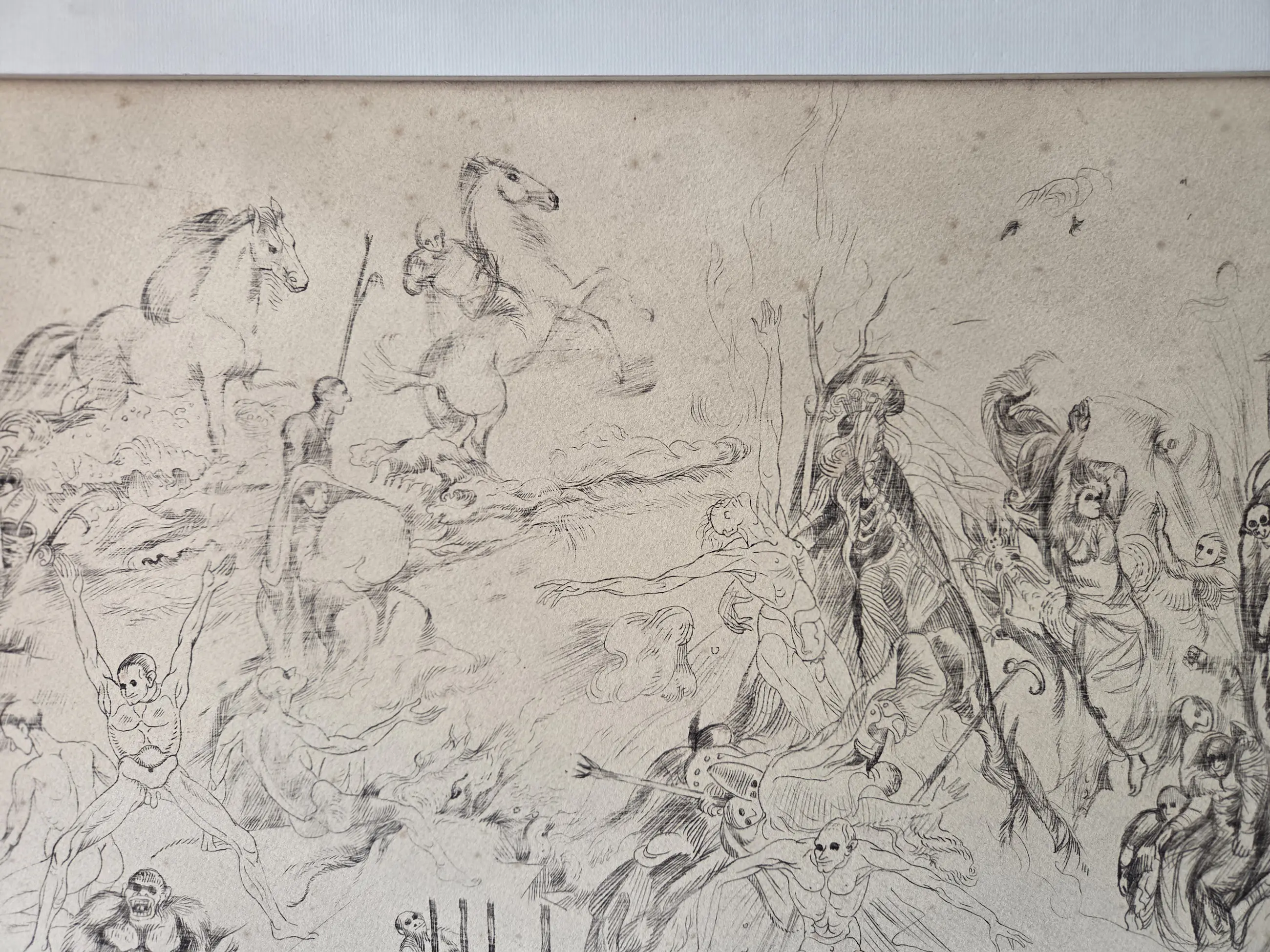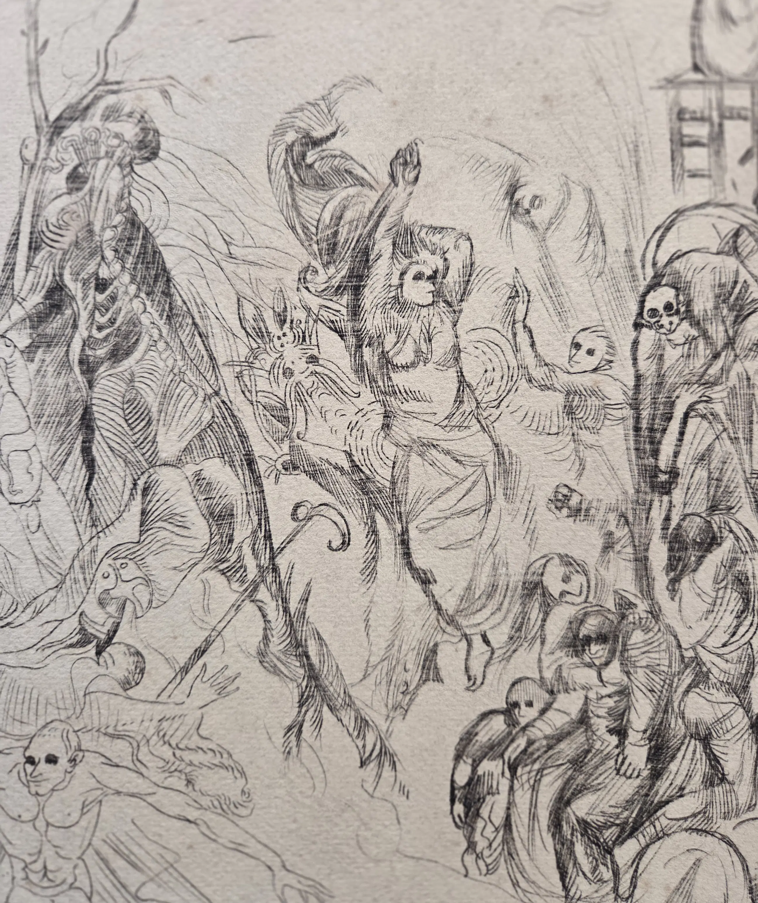 Fantastisch werk. Veel fantasiefiguren en details. In de sfeer van Jeroen Bosch en James Ensor. Gesigneerd en geannoteerd. Algemeen goede staat gezien ouderdom. Zie foto's voor eigen oordeel kwaliteit.