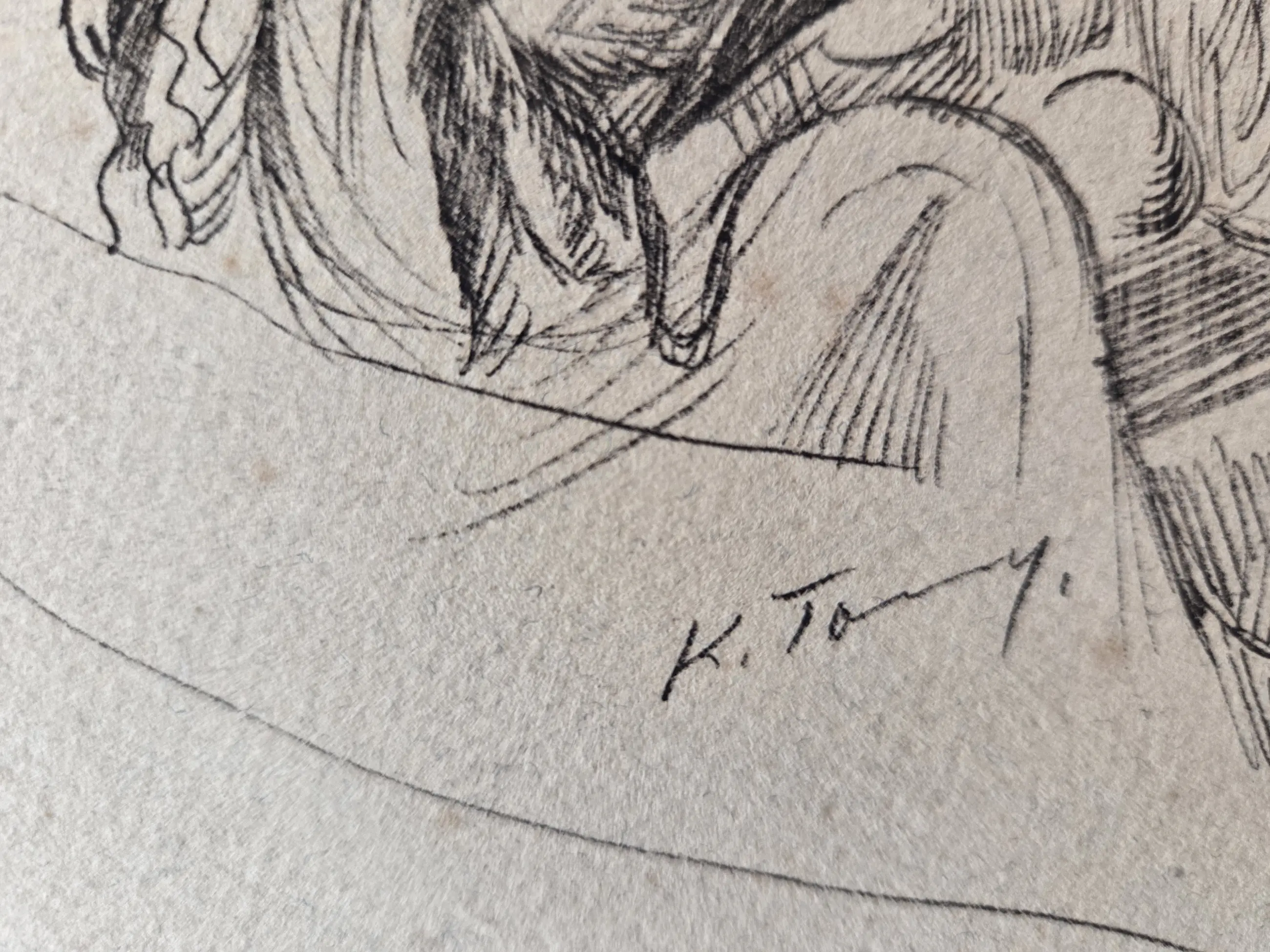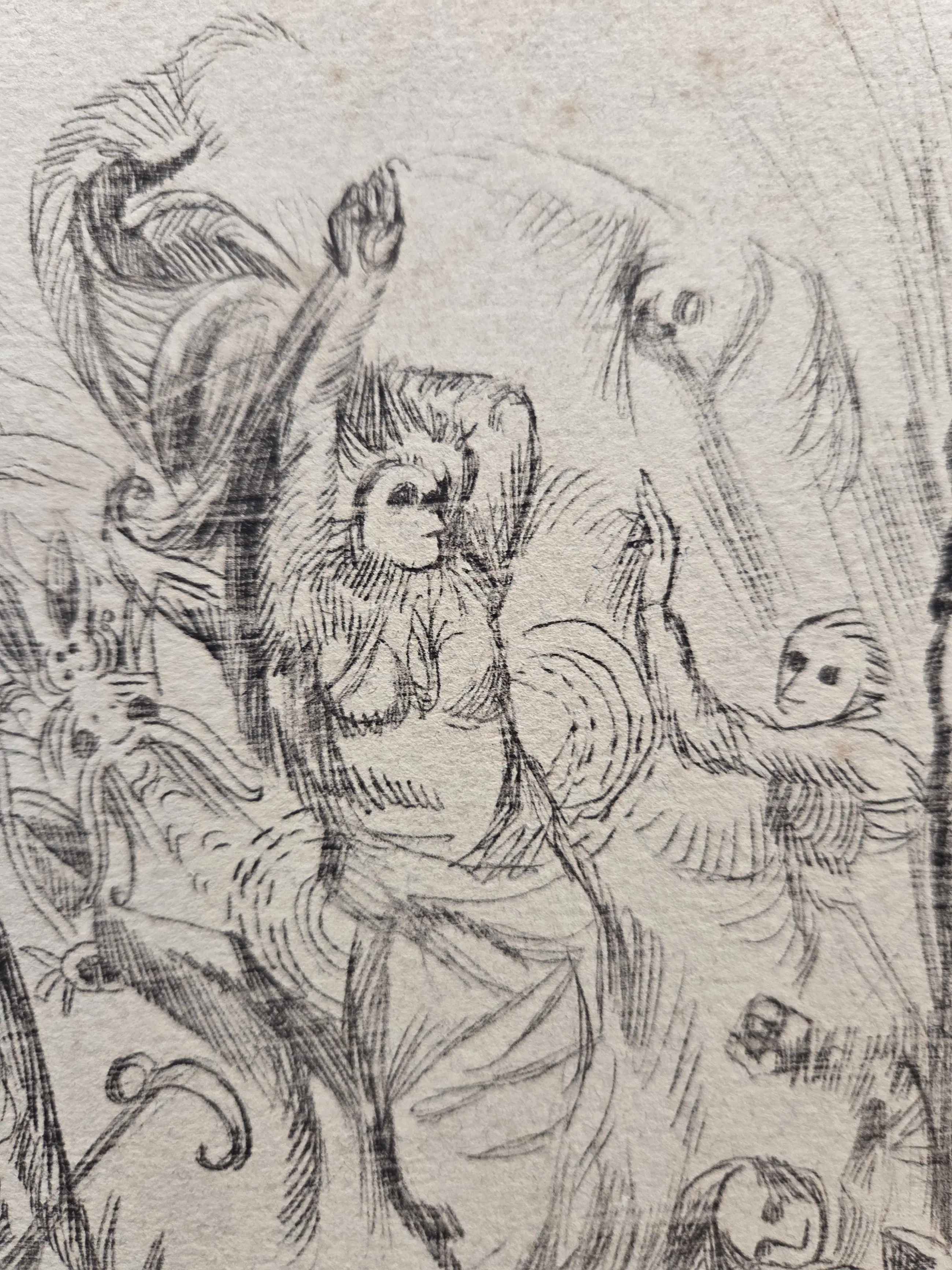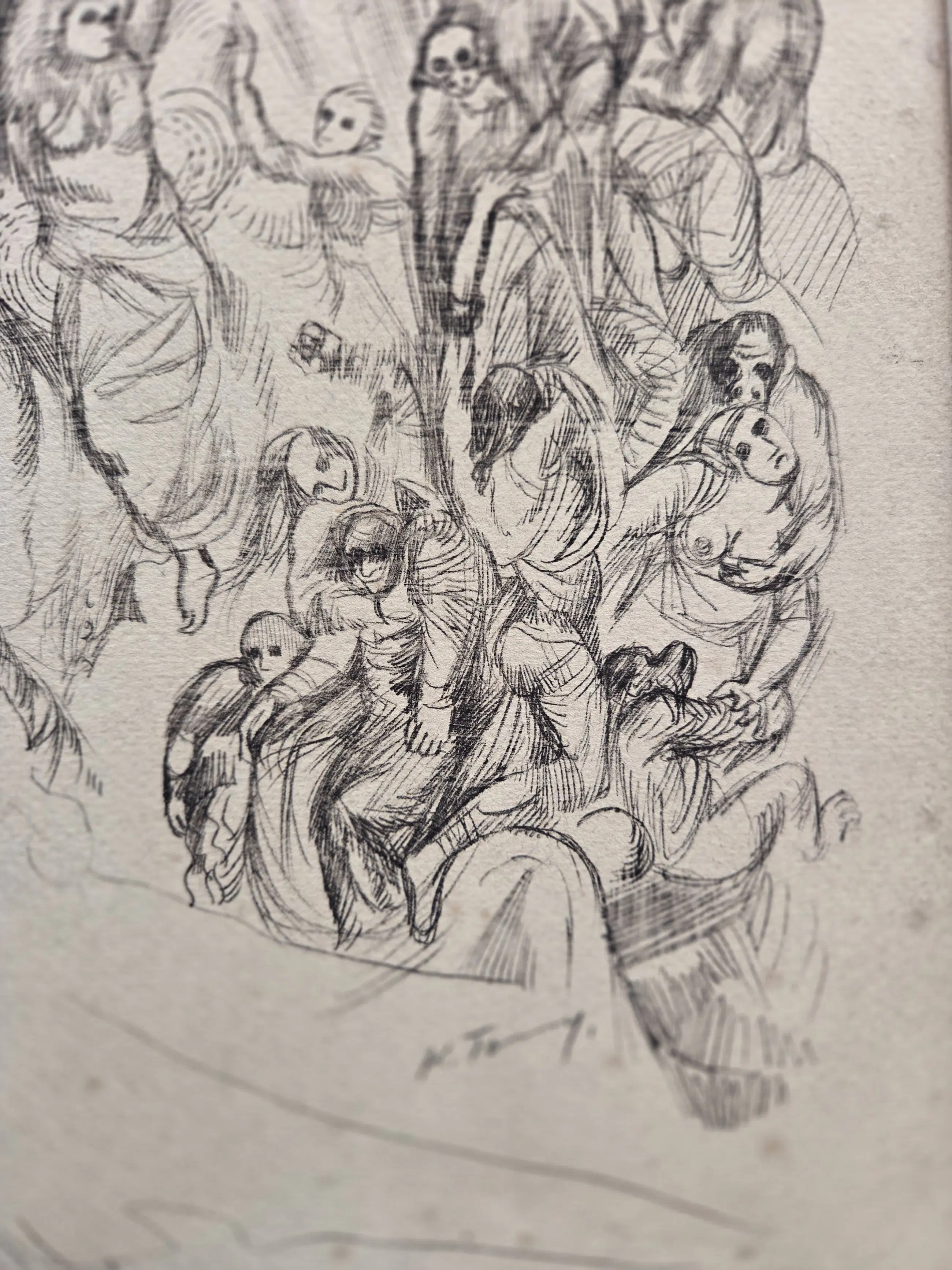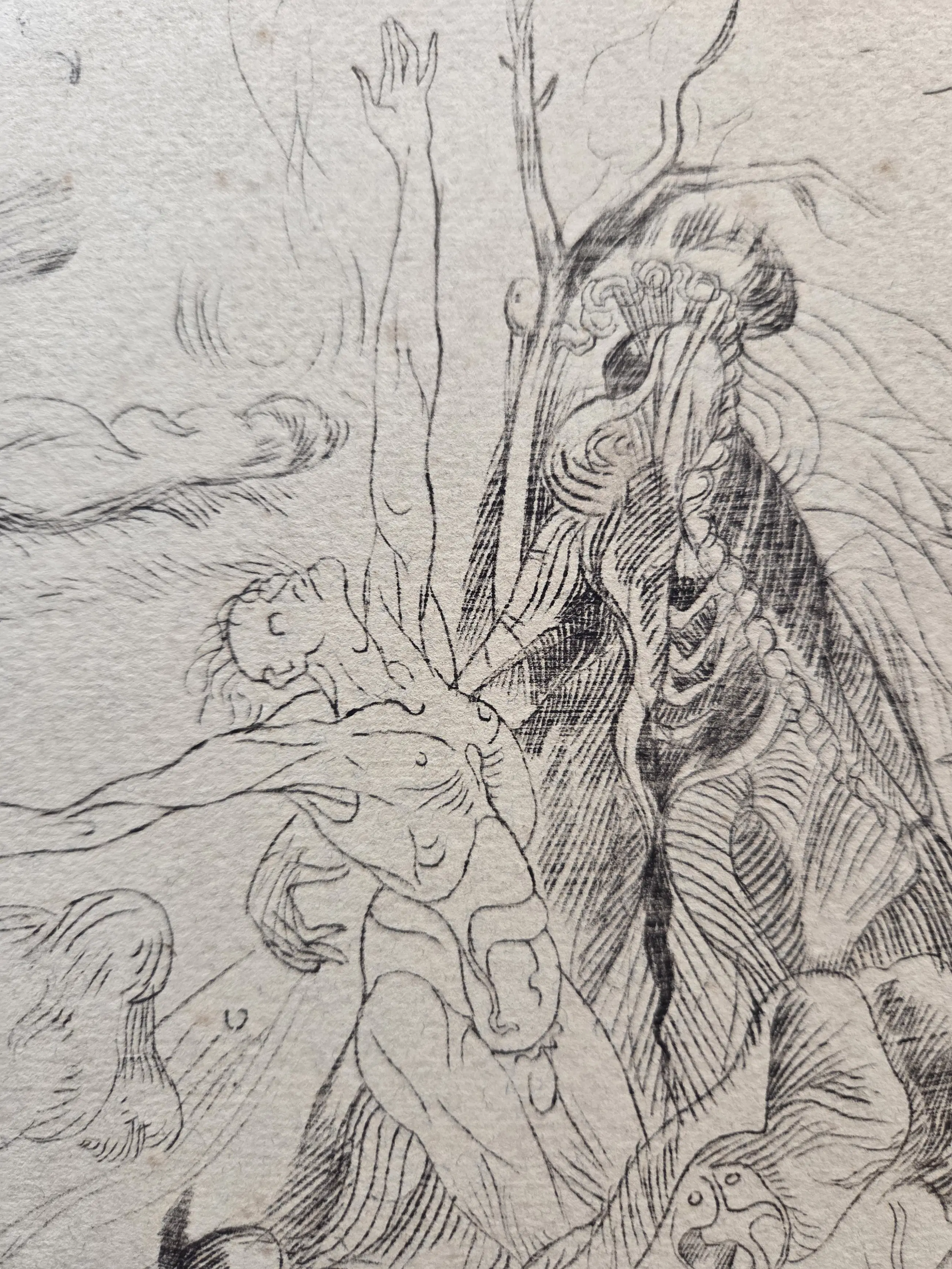 Fantastisch werk. Veel fantasiefiguren en details. In de sfeer van Jeroen Bosch en James Ensor. Gesigneerd en geannoteerd. Algemeen goede staat gezien ouderdom. Zie foto's voor eigen oordeel kwaliteit.