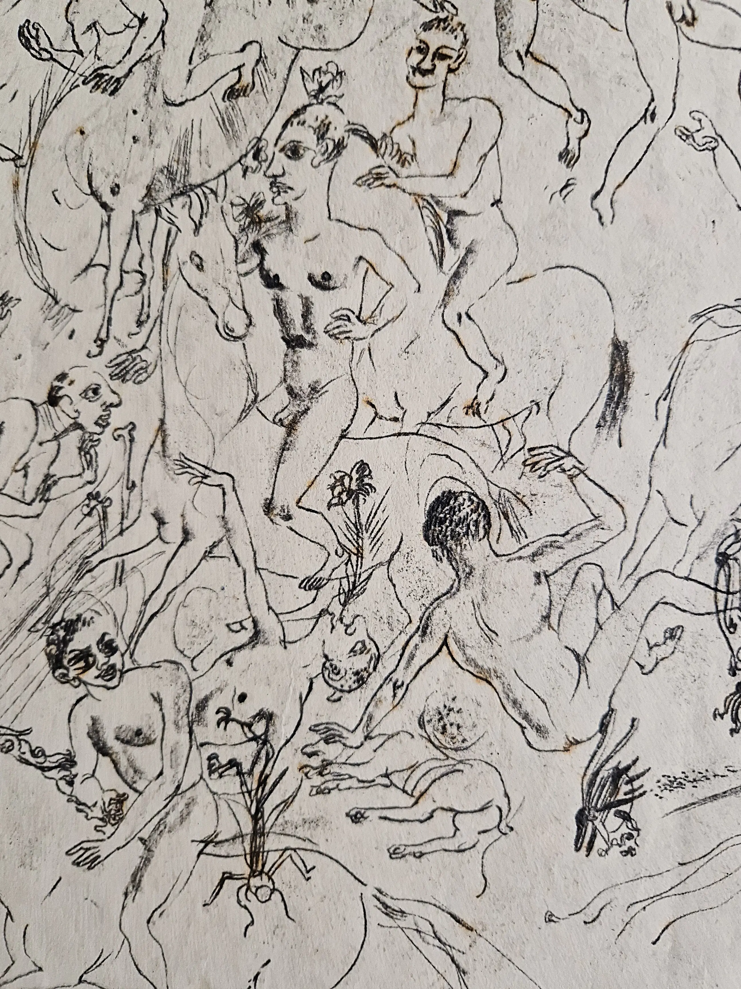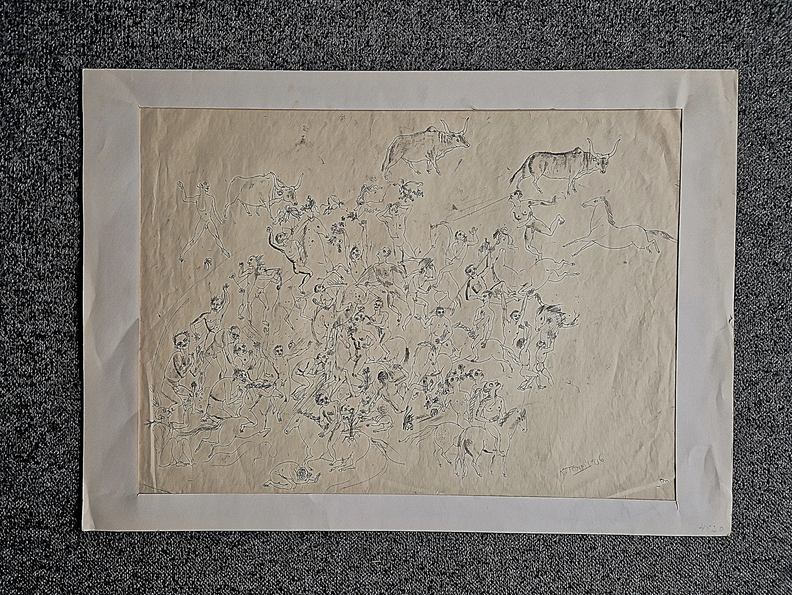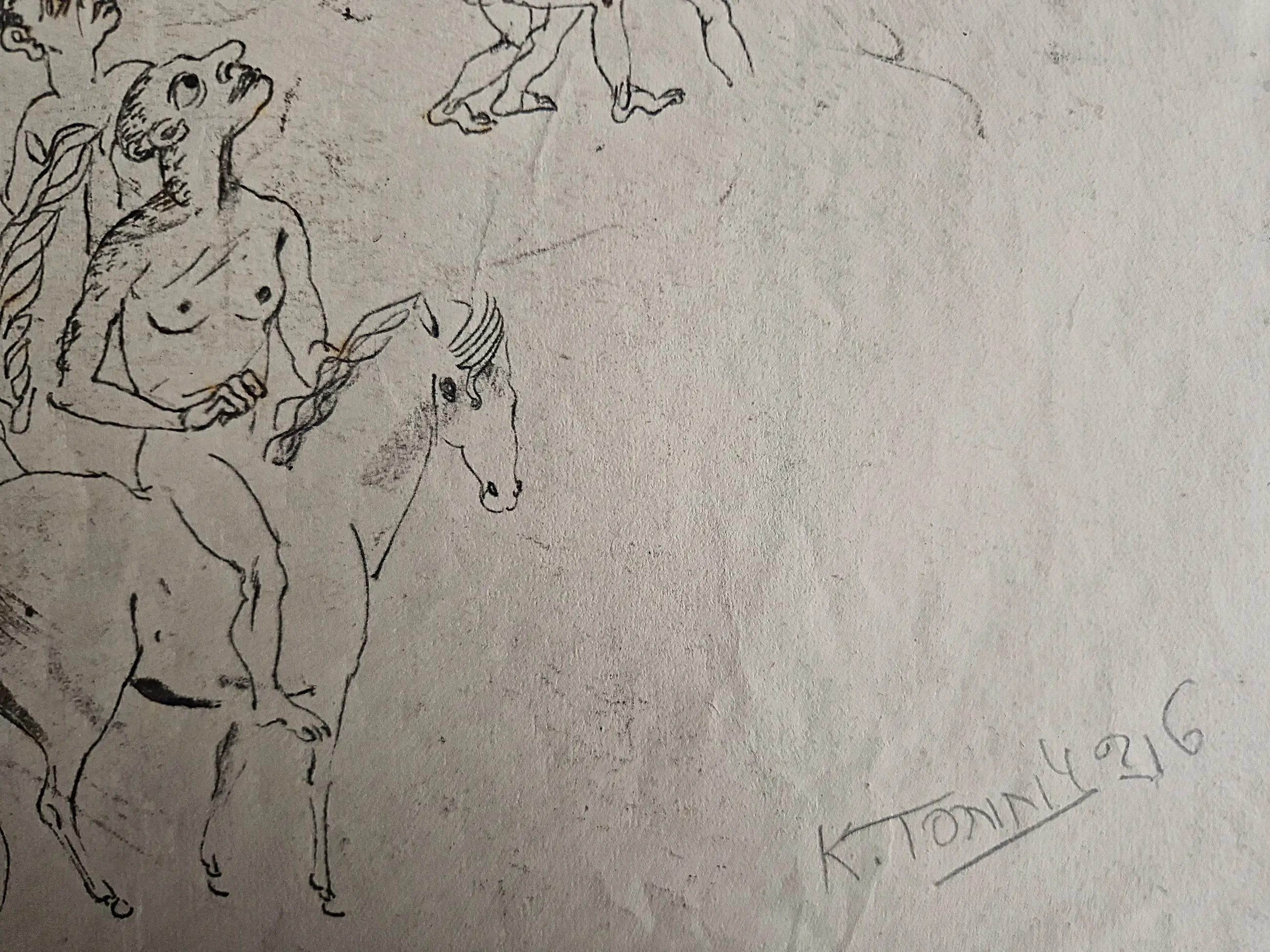 - Een erg zeldzame (want vroeg surrealistische tekening van Kristians Tonny / Parijse periode) Oostindische inkt op papier tekening "duivels en demonen". Het werk van Kristians Tonny stond in die periode onder invloed van james Ensor en jules Pascin. Groot formaat bladmaat 50x70cm. Rechtsonder gesigneerd met potlood. De tekening verkeert in goede, scherpe conditie, met wel wat vouwen, met name aan de zijden van het papier.