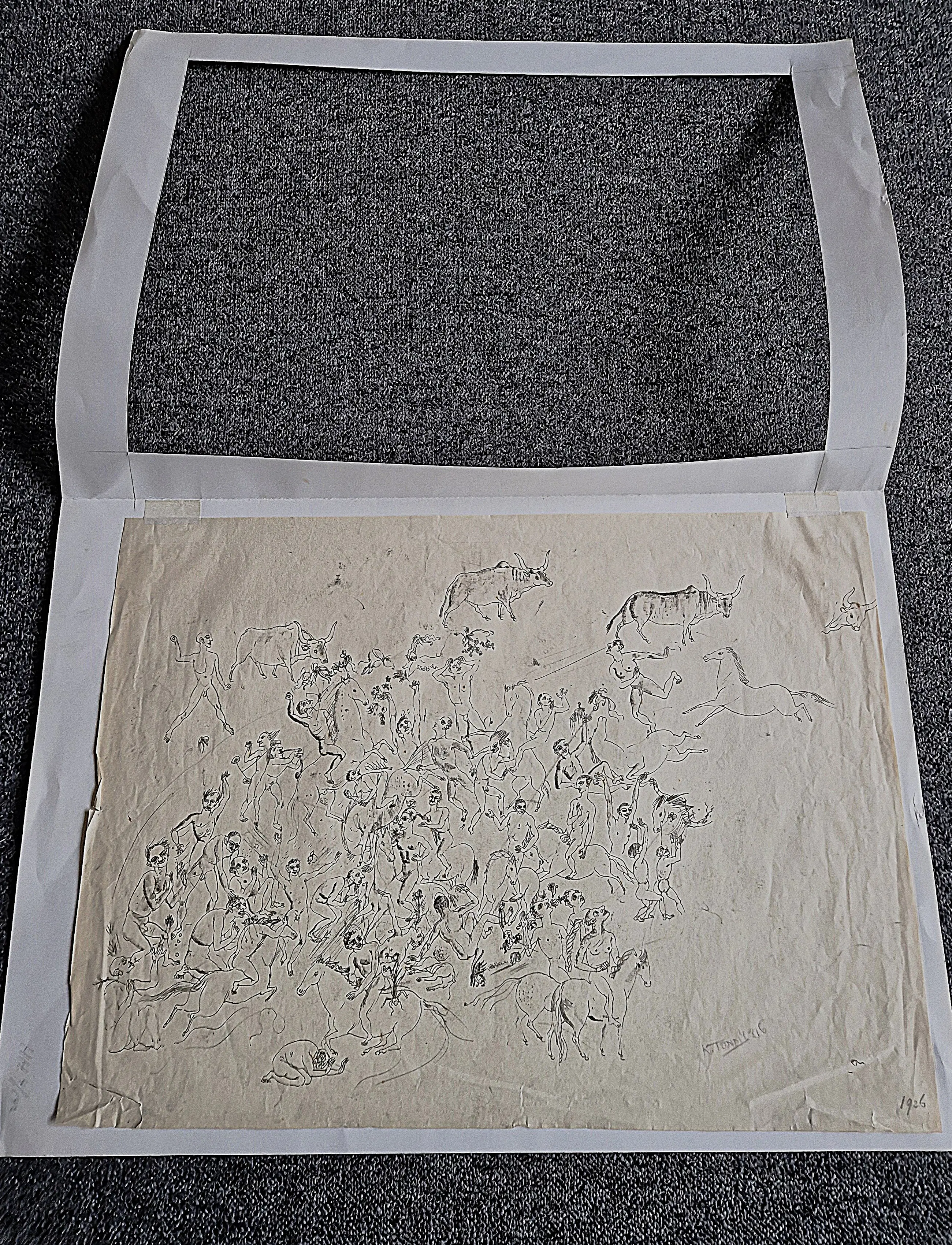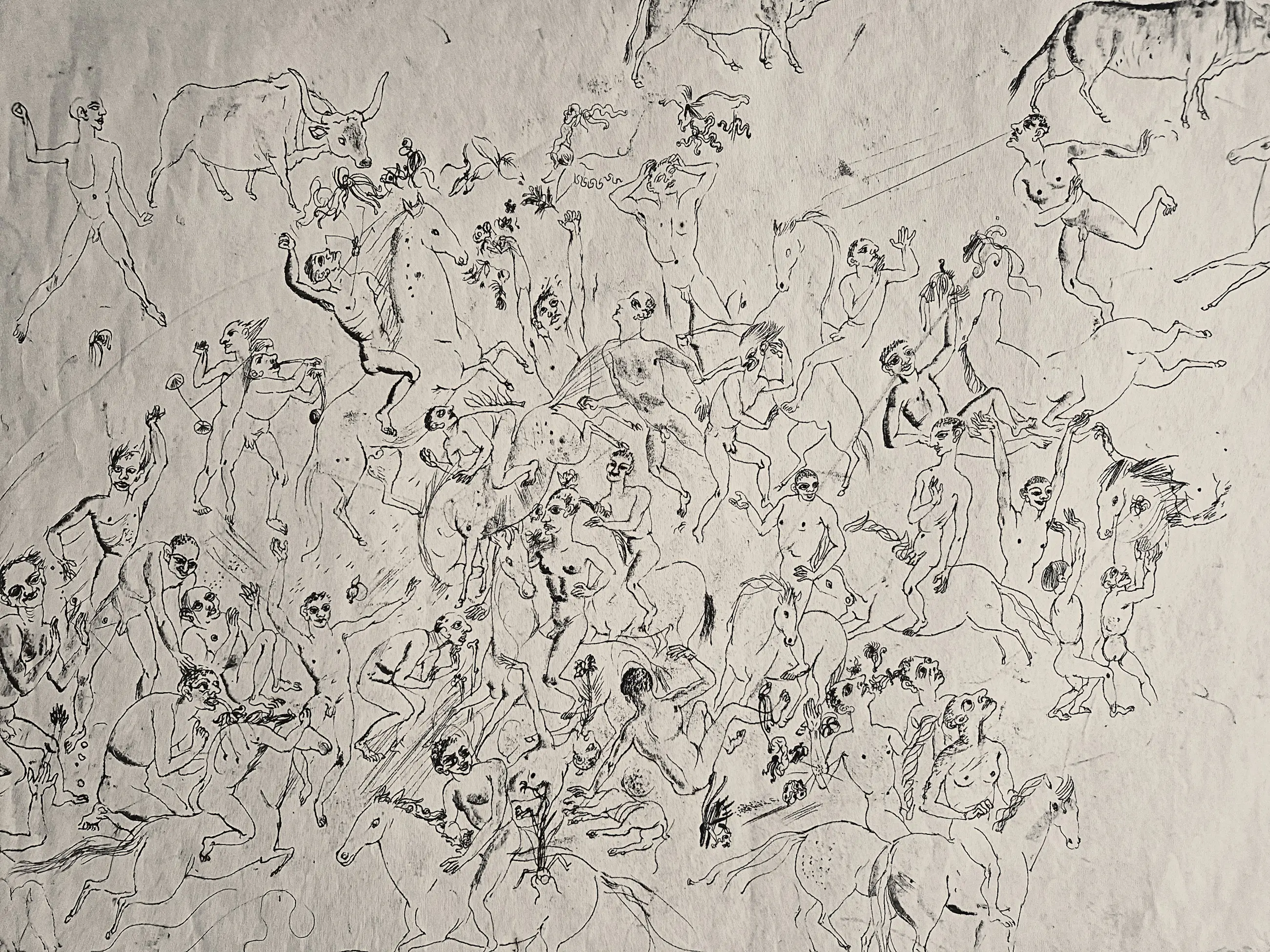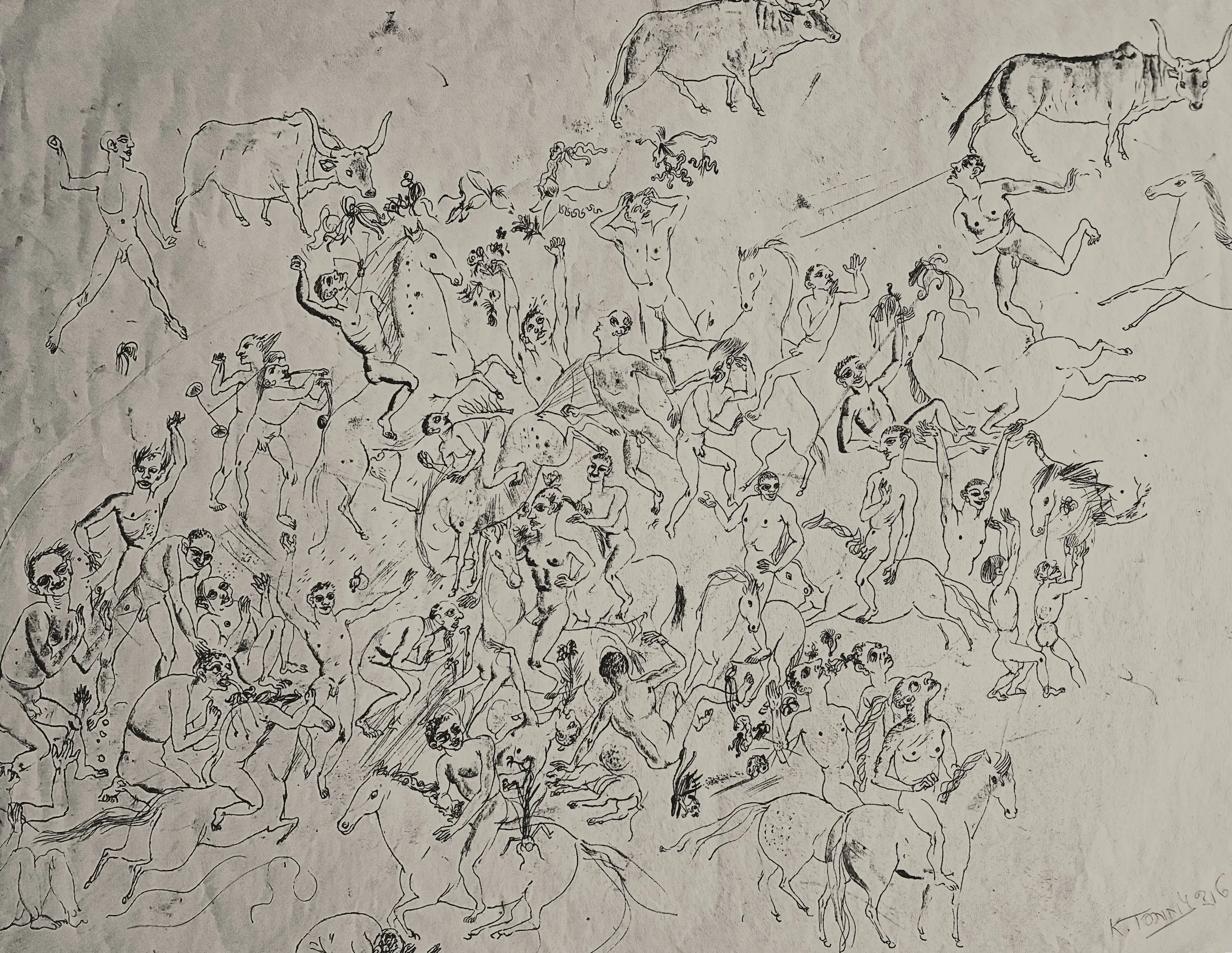 - Een erg zeldzame (want vroeg surrealistische tekening van Kristians Tonny / Parijse periode) Oostindische inkt op papier tekening "duivels en demonen". Het werk van Kristians Tonny stond in die periode onder invloed van james Ensor en jules Pascin. Groot formaat bladmaat 50x70cm. Rechtsonder gesigneerd met potlood. De tekening verkeert in goede, scherpe conditie, met wel wat vouwen, met name aan de zijden van het papier.
