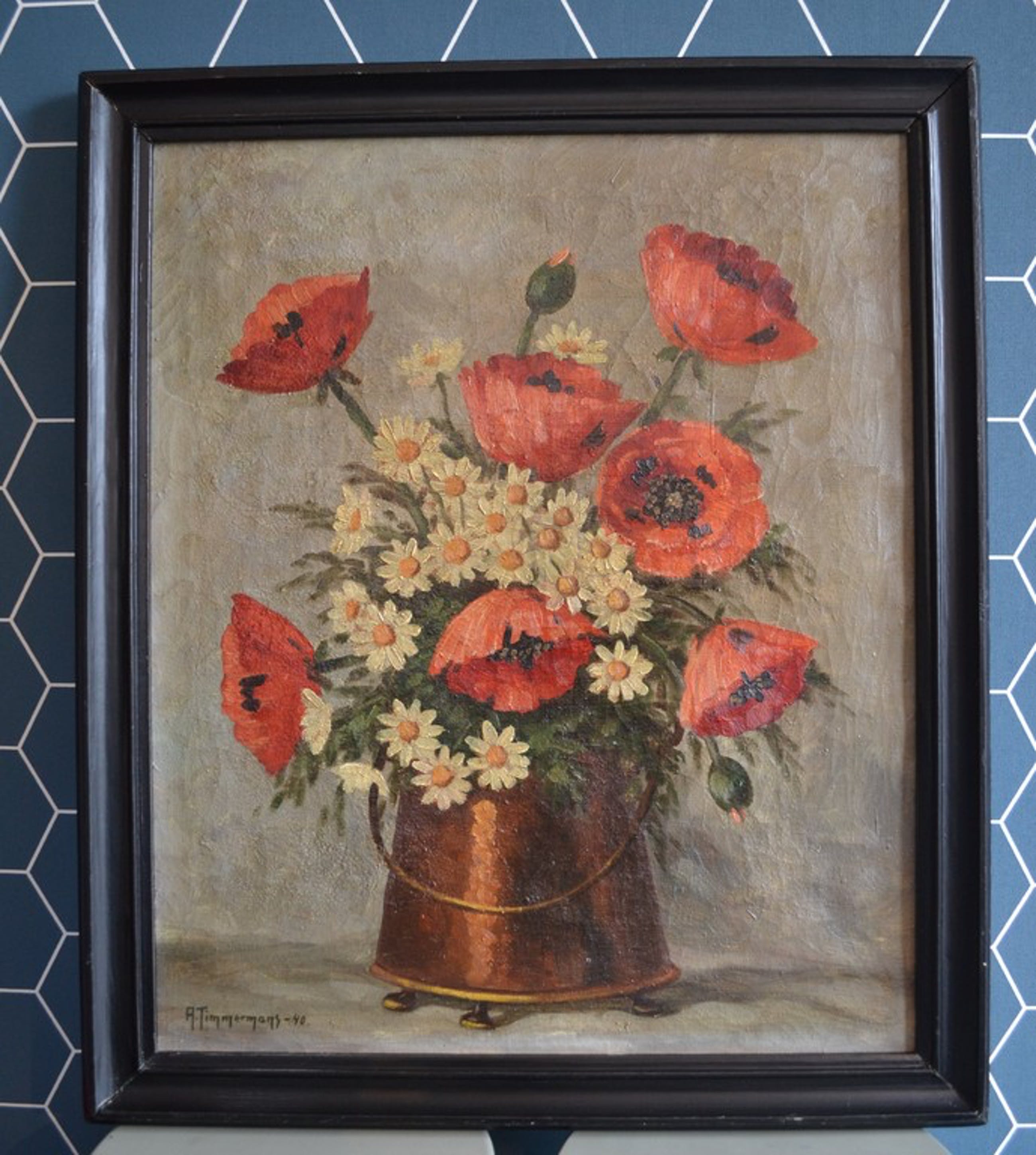 Bloemstilleven in koperen vaas, olieverf op doek. Het schilderij is l.o. gesigneerd met A. Timmermans en gedateerd 1940. Mooie felle kleuren, schilderij heeft wat craquelé. Voorzien van houten lijst (heeft wat lichte gebruikssporen). Op achterzijde doek staat nog vermeld "Berlicum N.Br.". Afmeting doek is 50x60 en van de lijst 57x67.