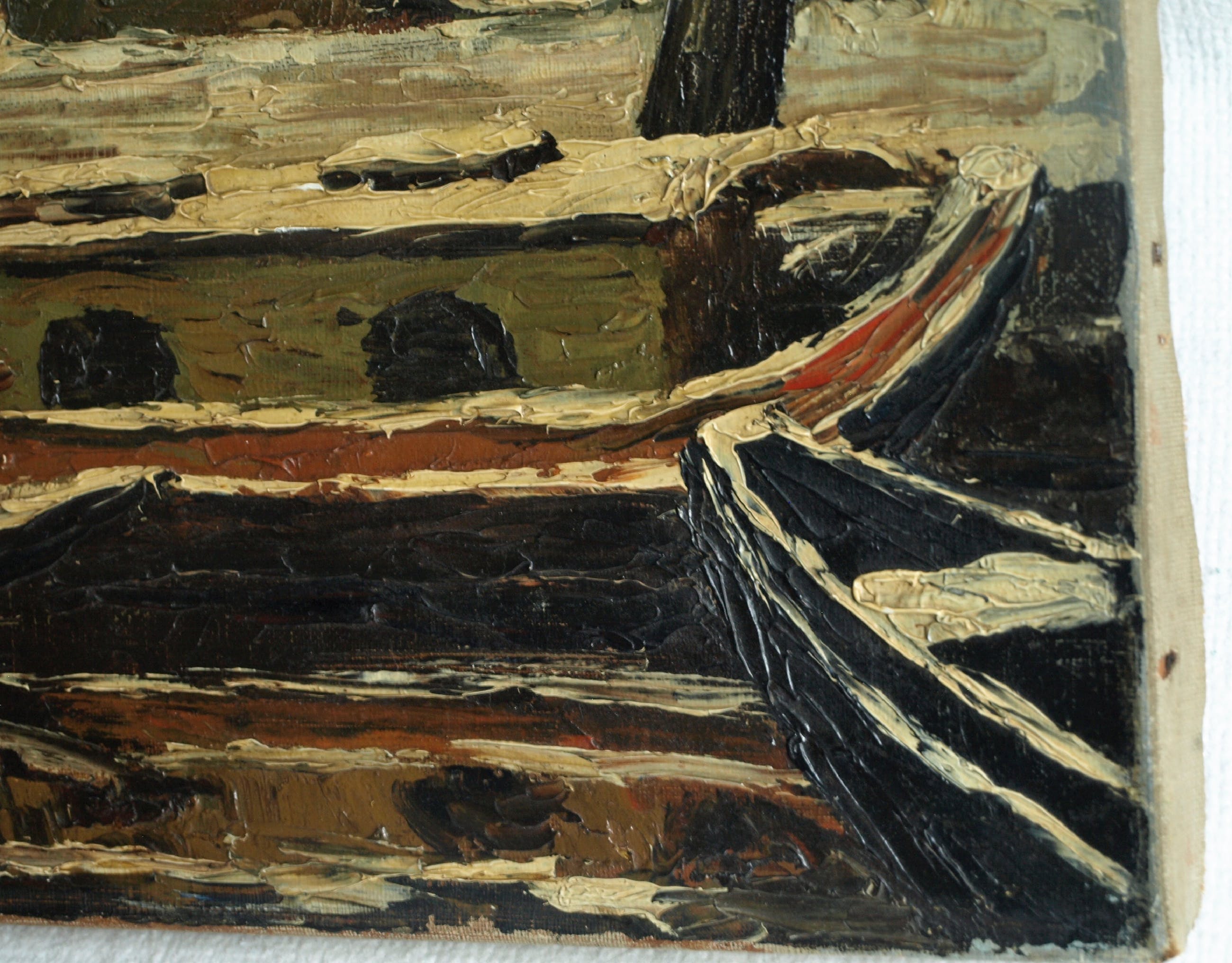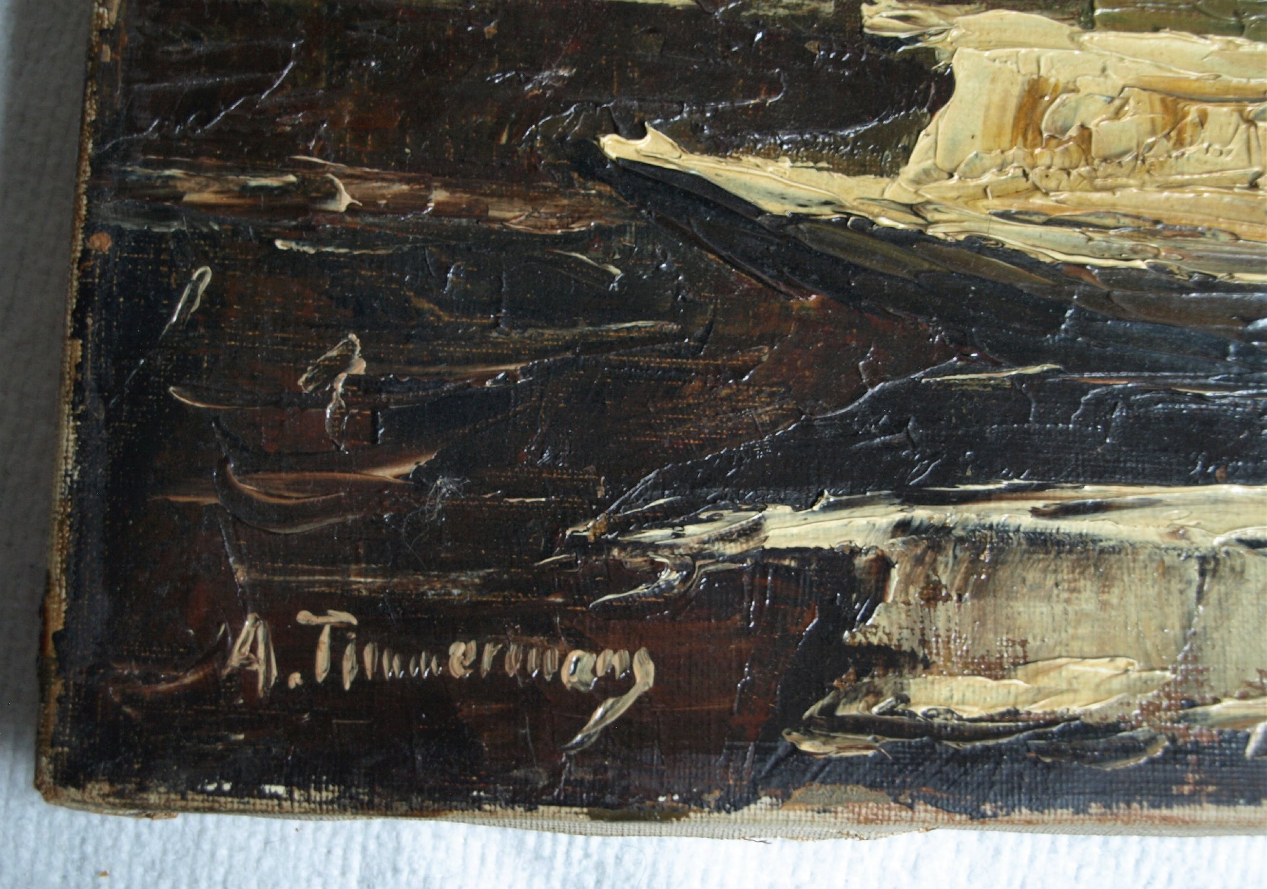 Een schilderij uit ca. 1960 van de Nederlandse kunstenaar Tonny Timmermans (1906-1989), met een voorstelling van de Keizersgracht in Amsterdam, bij de Brouwersgracht (dit staat met potlood geschreven op de achterkant van het spieraam….). -Techniek: Olieverf op doek, grotendeels gemaakt met een paletmes en opgespannen op een houten spieraam. -Gesigneerd linksonder. -Afmetingen: Spieraam, 35 x 45 x 2 cm. -Herkomst: Uit een inboedel. -Conditie: Het werk is in redelijk goede staat met 2 restauratie-plakkertjes op de achterkant van het doek. Zie ook de foto’s voor een eigen indruk.