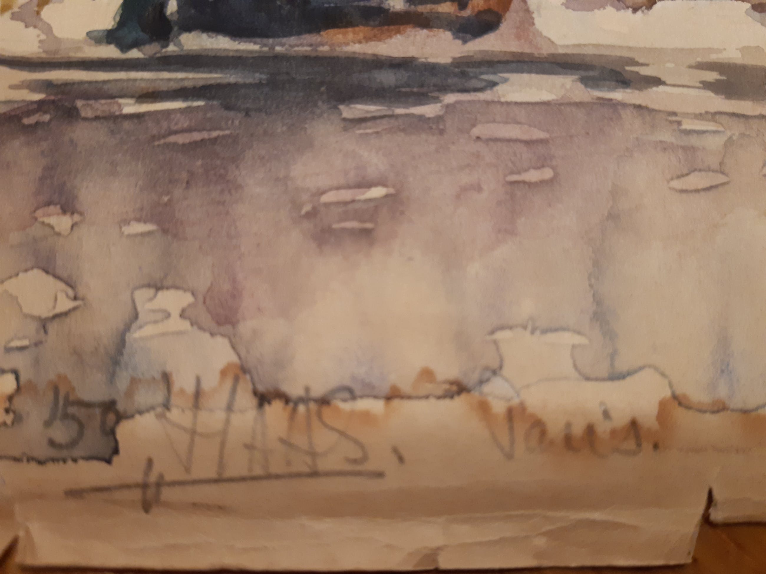 Tekening met waterverf op bruin papier.Aan de randen is het papier iets gekruld.Met potlood gesigneerd en getiteld.