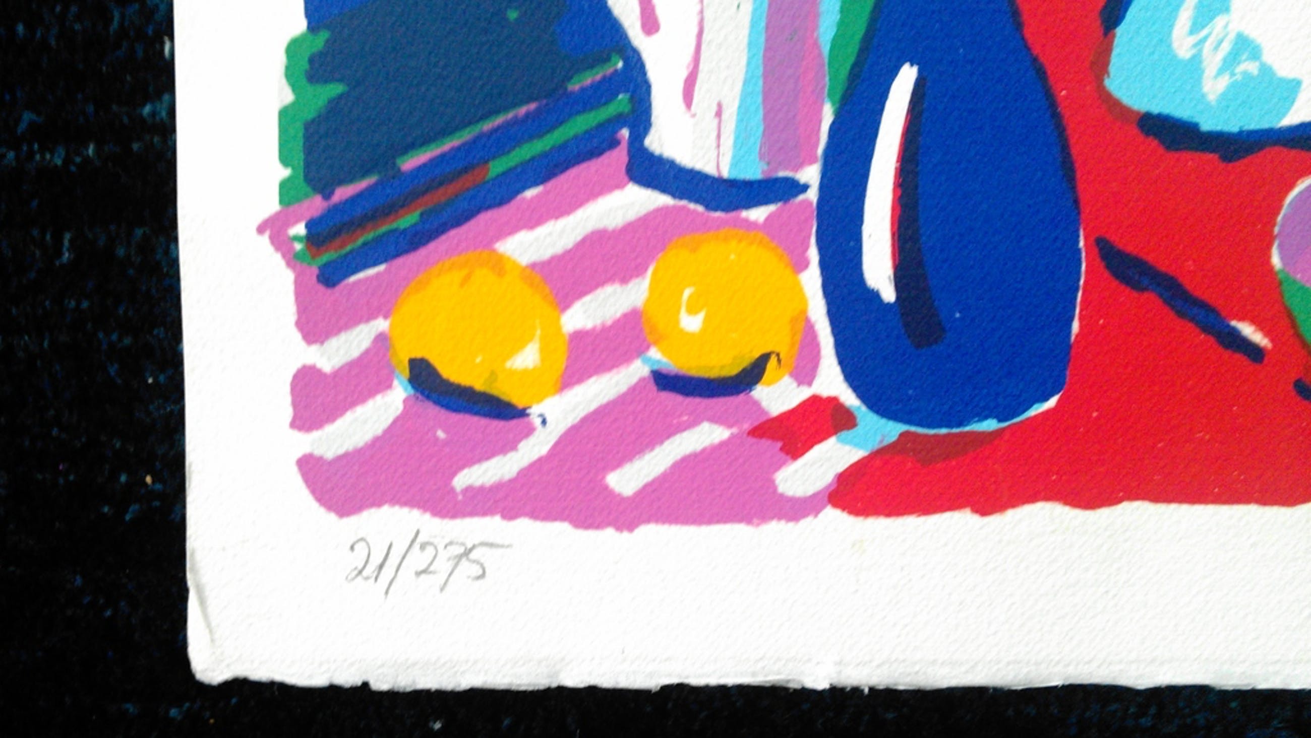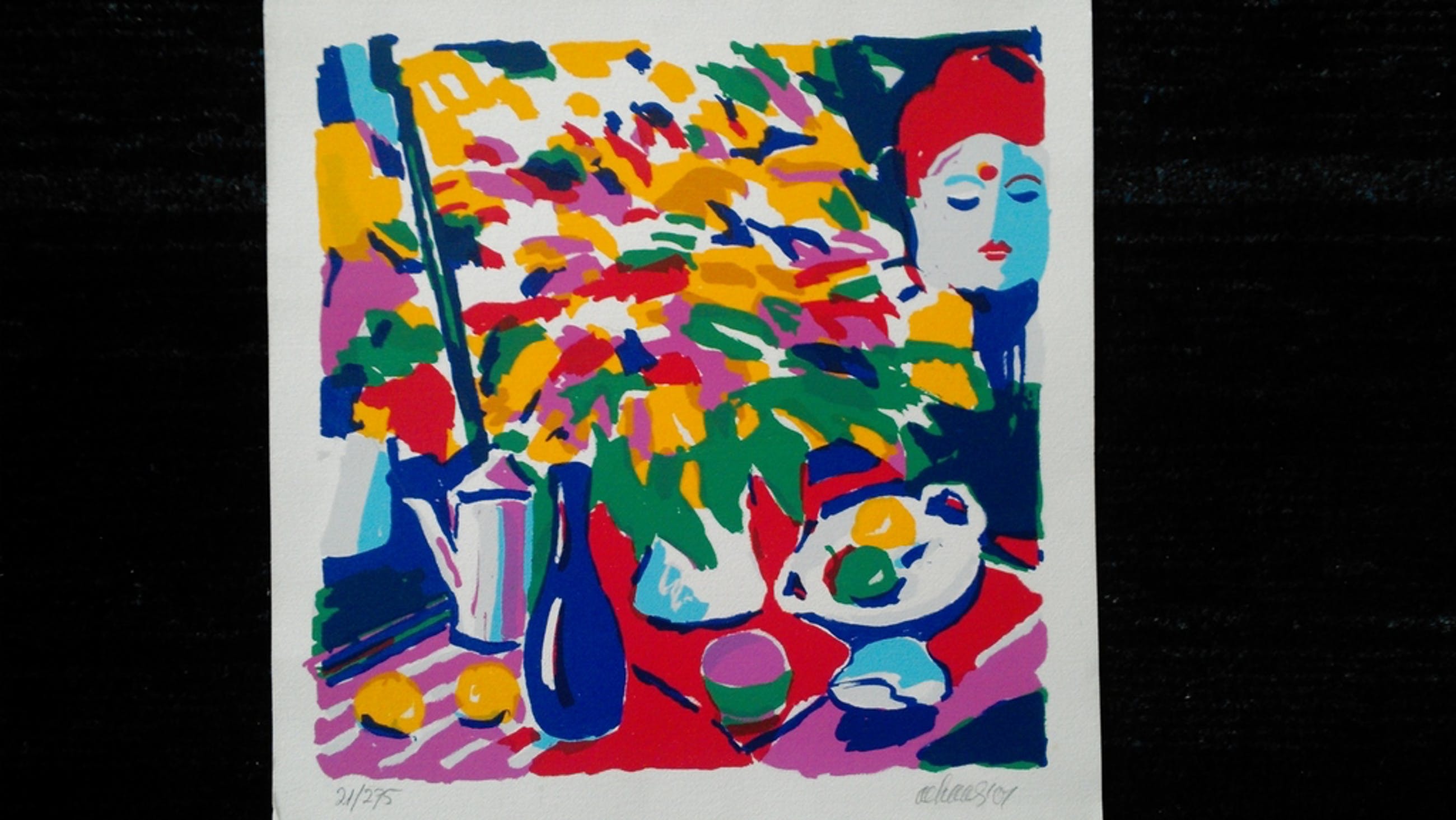 Vrolijk meerkleuren litho op dik papier gesigneerd en jaartal en genummerd 21 van de oplage van 275. Niet ingelijst afmetingen 45 x 47 cm