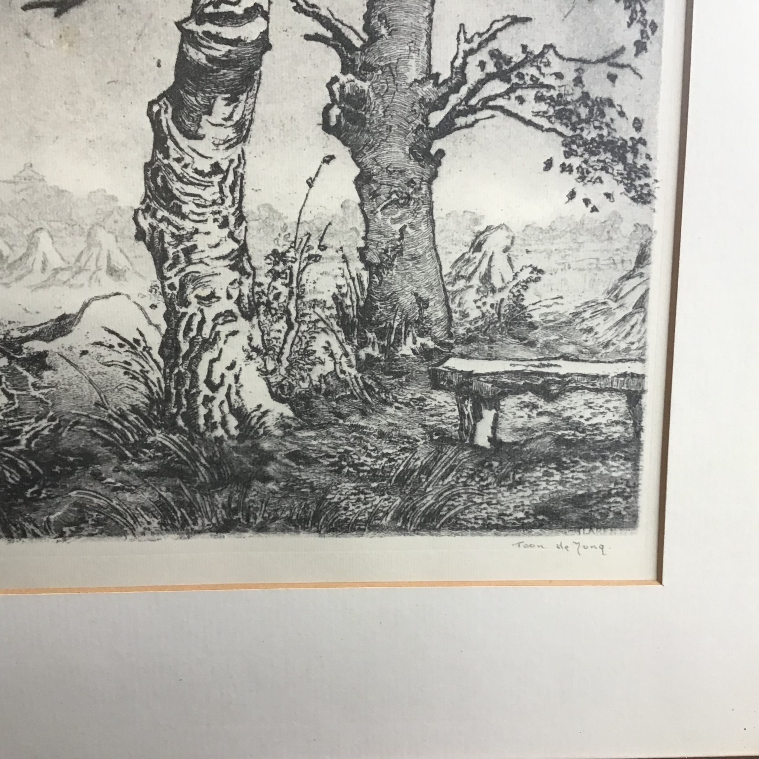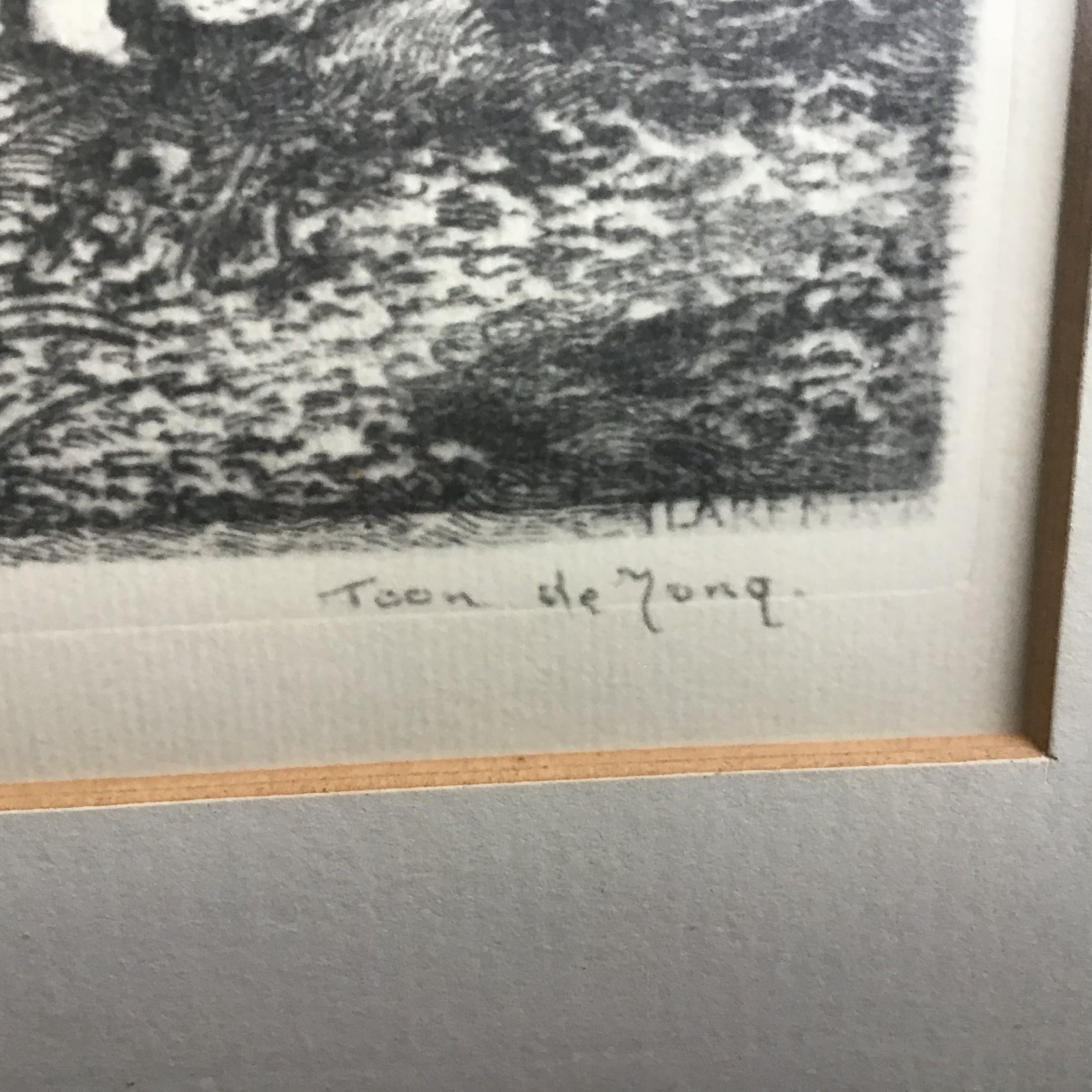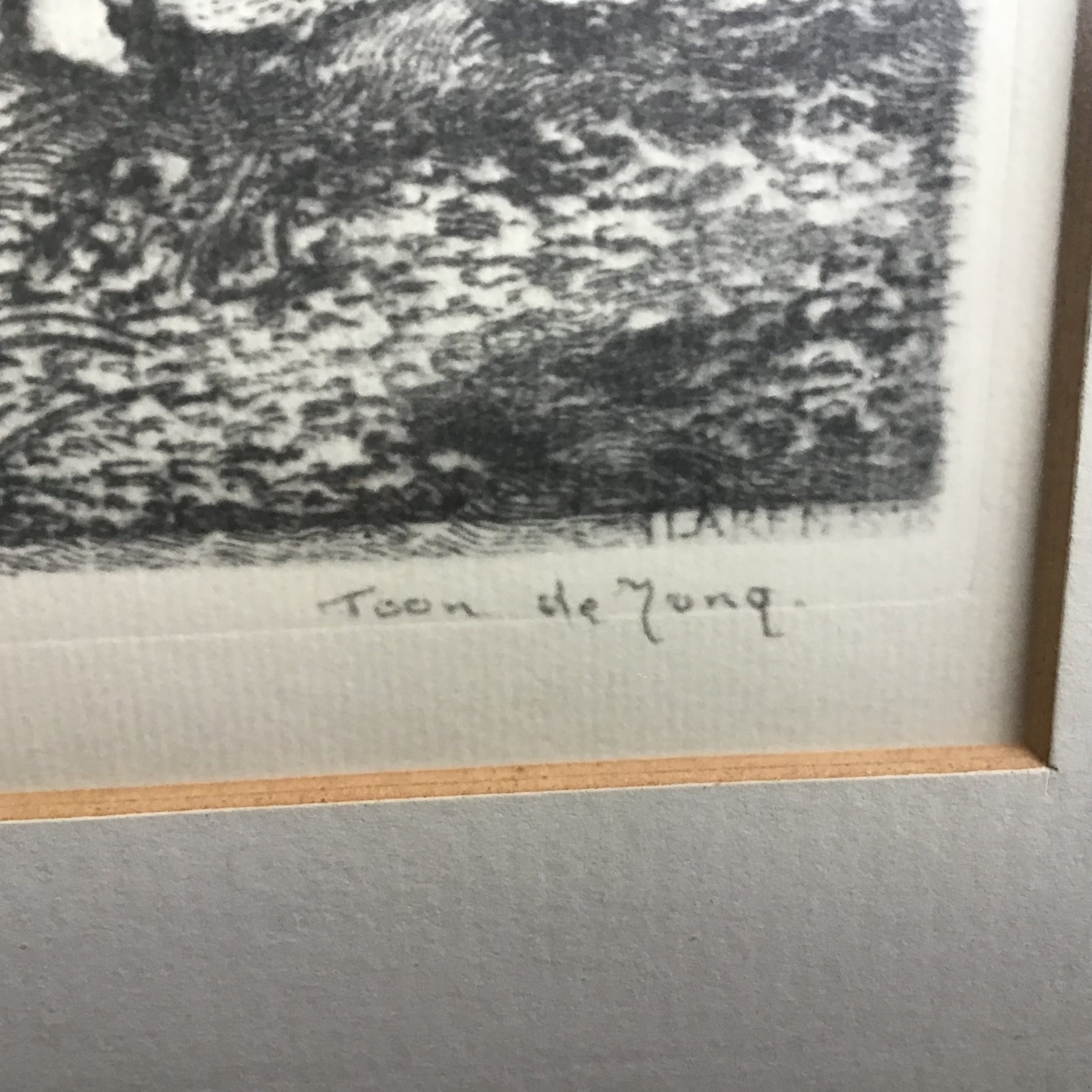 De meeste van zijn onderwerpen vond Toon de Jong dicht bij huis. Hij heeft prachtige etsen gemaakt van Laren Blaricum de Engen de Gooiersgracht en ga zo maar door.