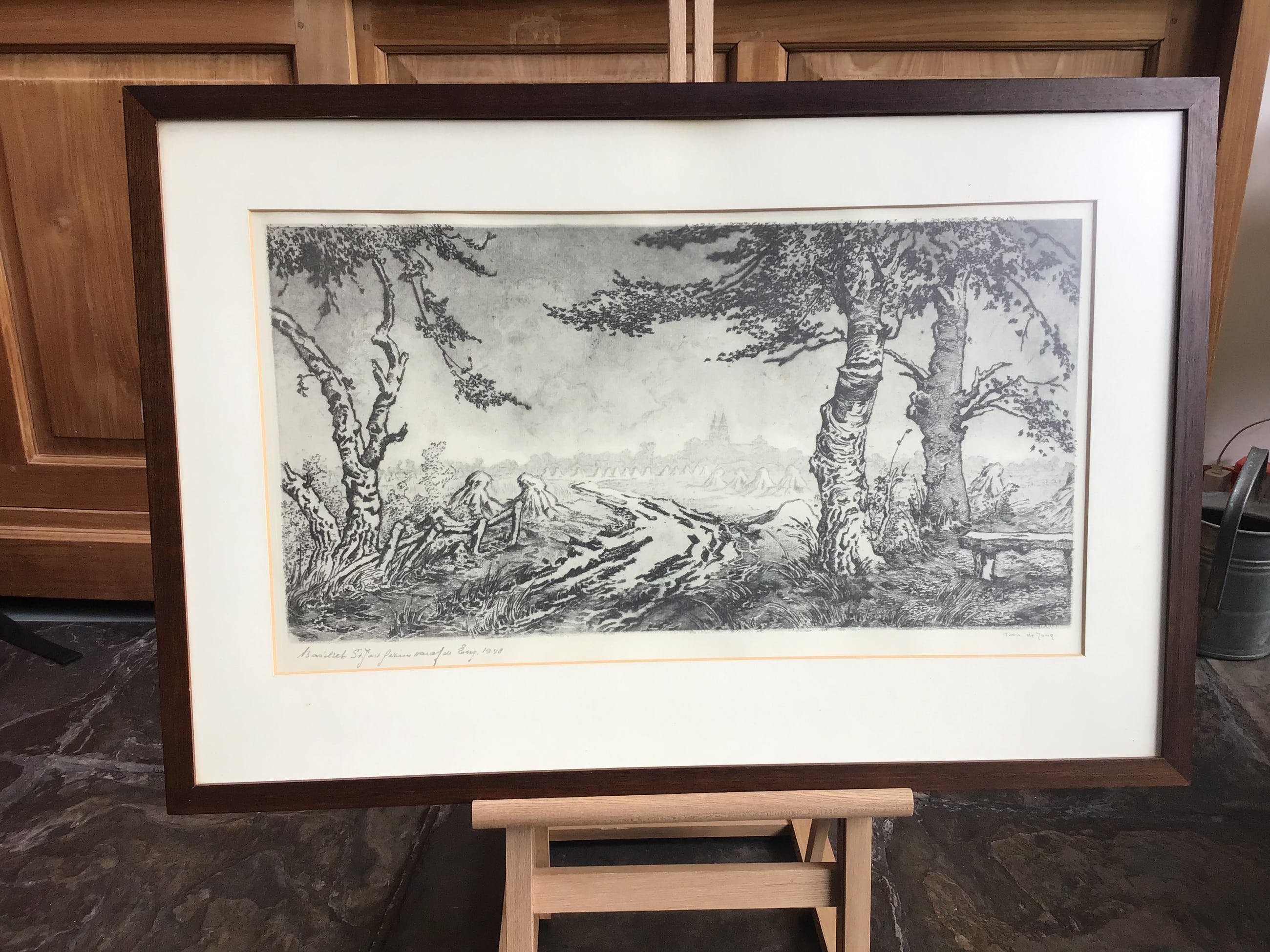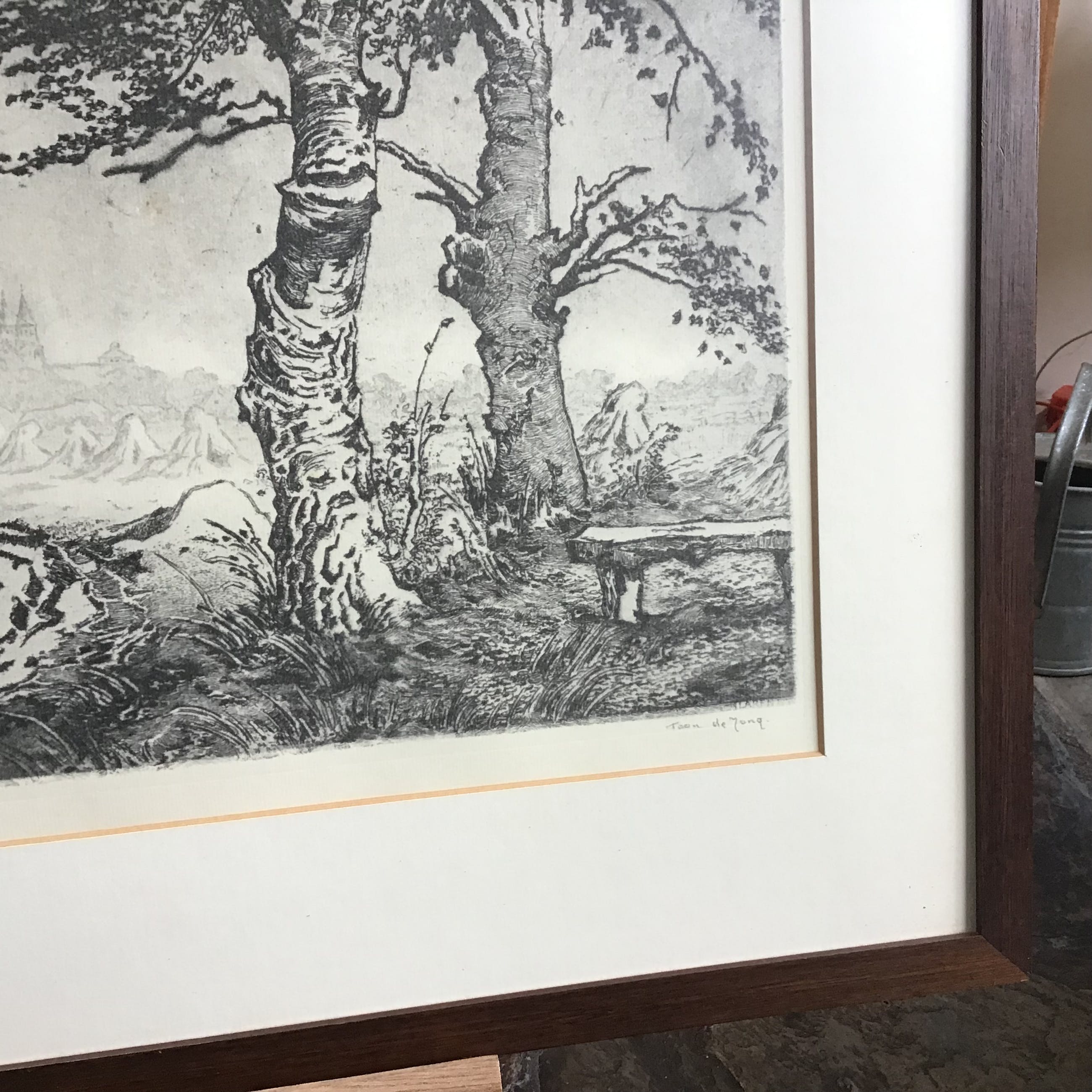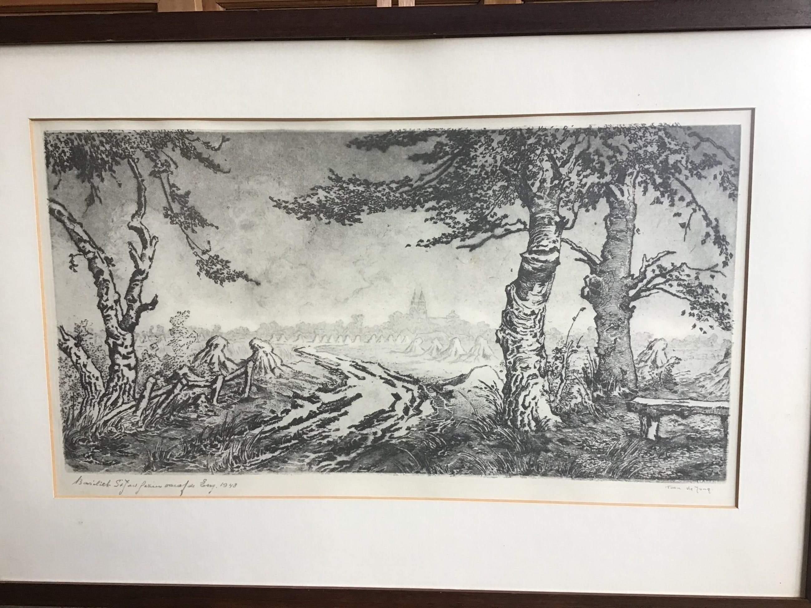 De meeste van zijn onderwerpen vond Toon de Jong dicht bij huis. Hij heeft prachtige etsen gemaakt van Laren Blaricum de Engen de Gooiersgracht en ga zo maar door.