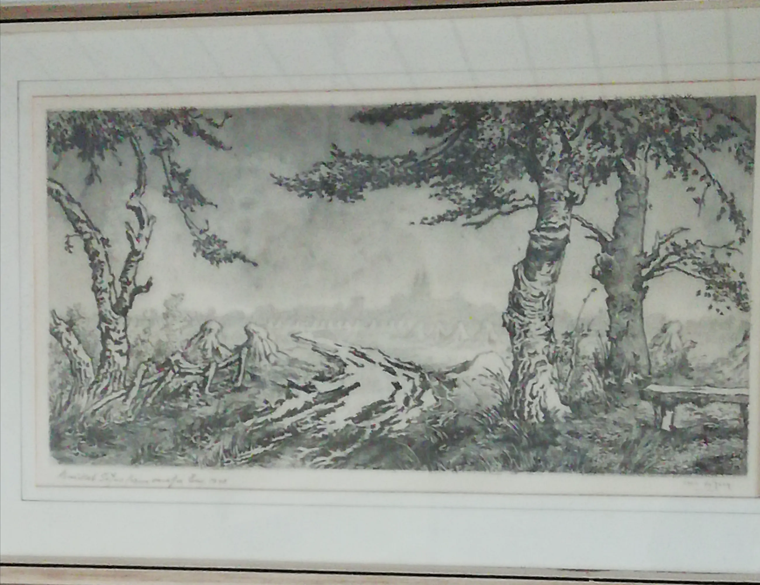 ets van deze Nederlandse tekenaar graficus Laren 1879/1978 de ets is uit 1948 de basilisk van St Jans op de achtergrond zie je vaag het dorp Laren