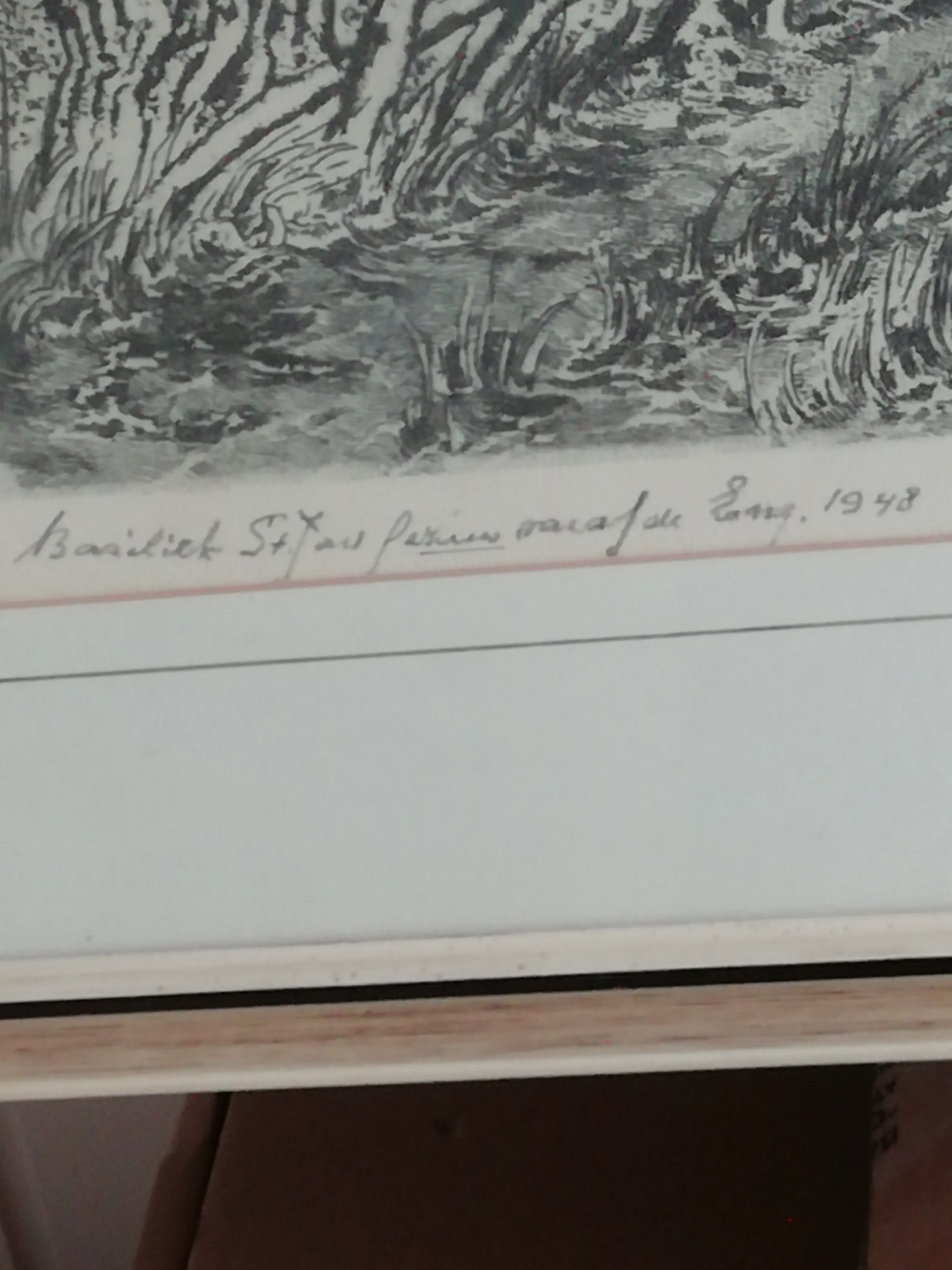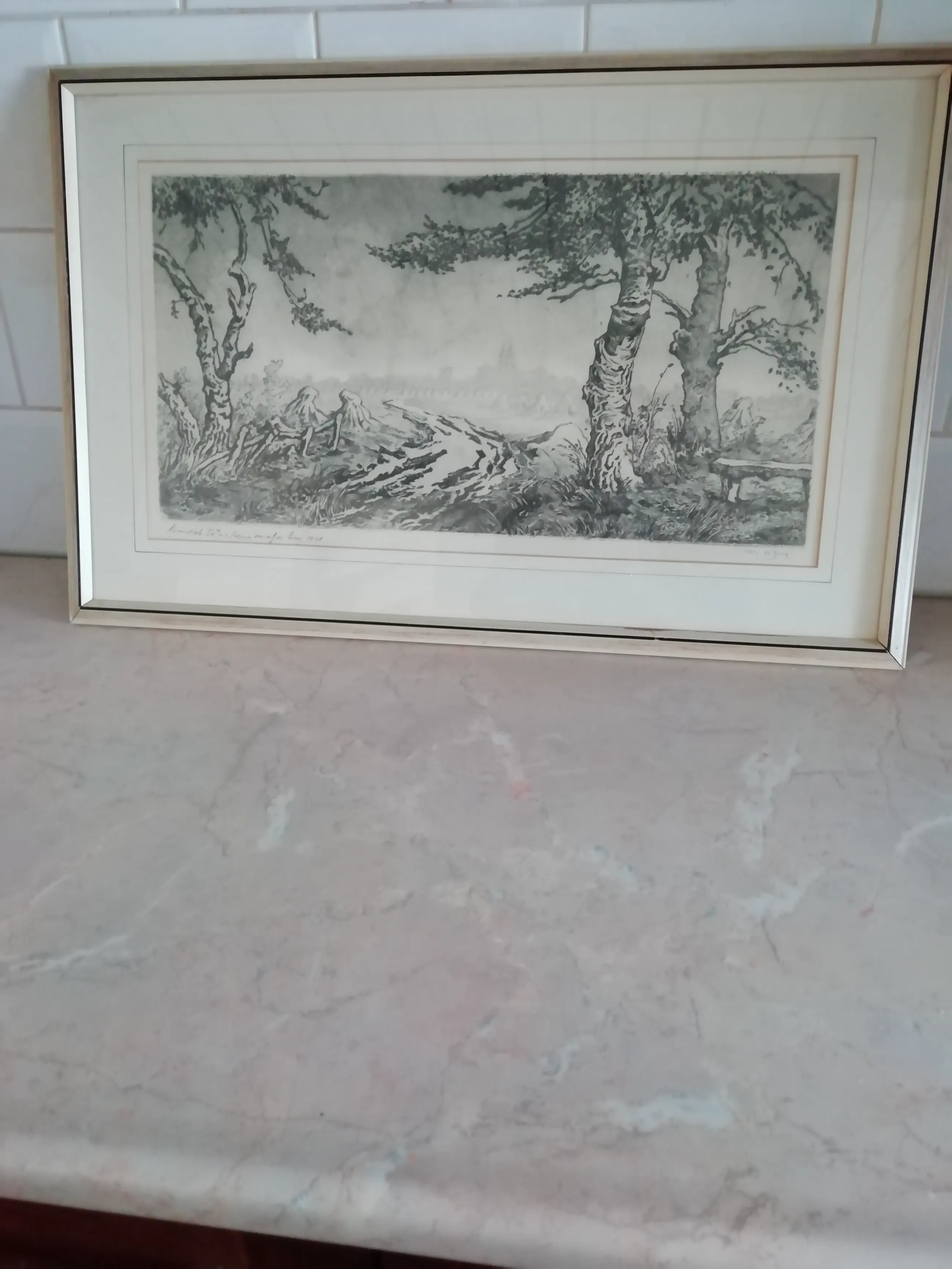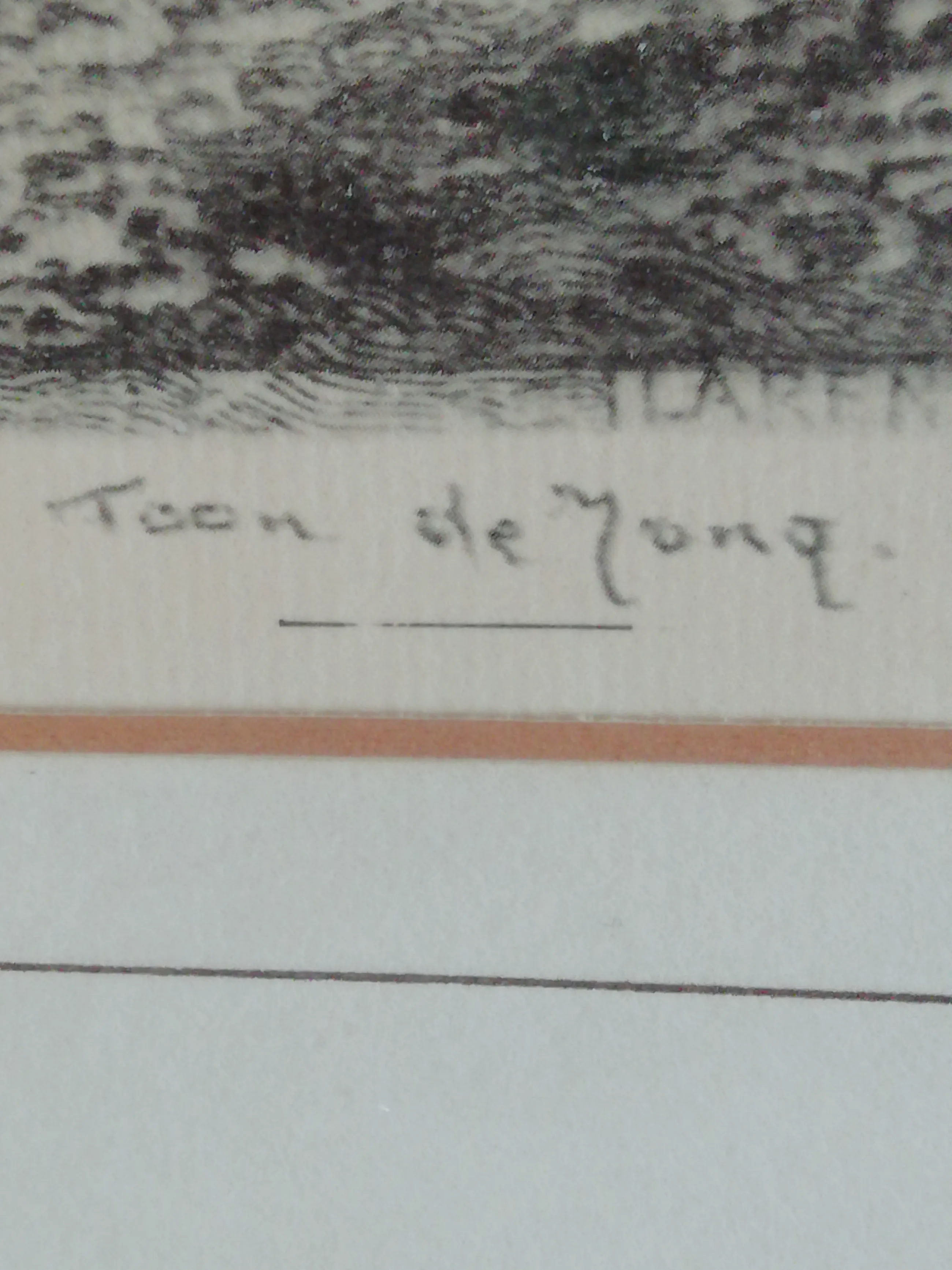 het schilderij heeft lichte gebruikers sporen aan de lijstachterkant is met hard karton gemaaktde ets is origineel achter glas geschreven en gesigneerd met potloot