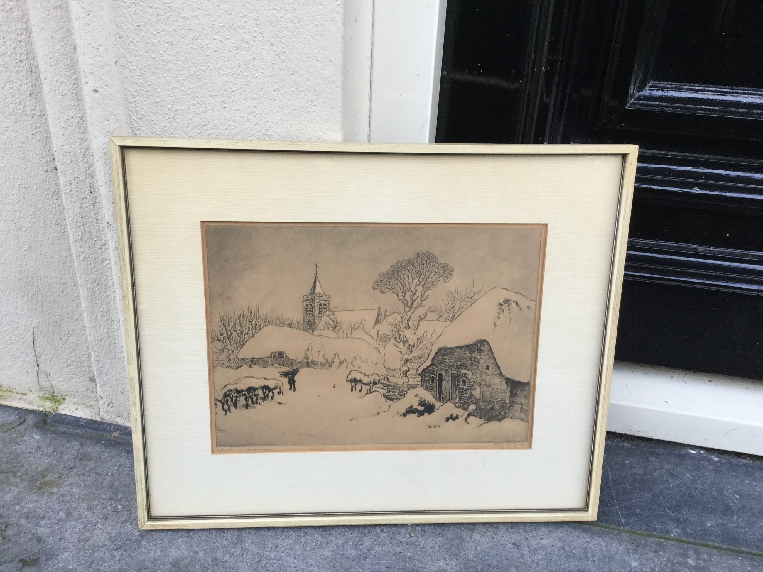 Toon de Jong, winter in Blaricum, ets, eigen druk, ro gesigneerd.