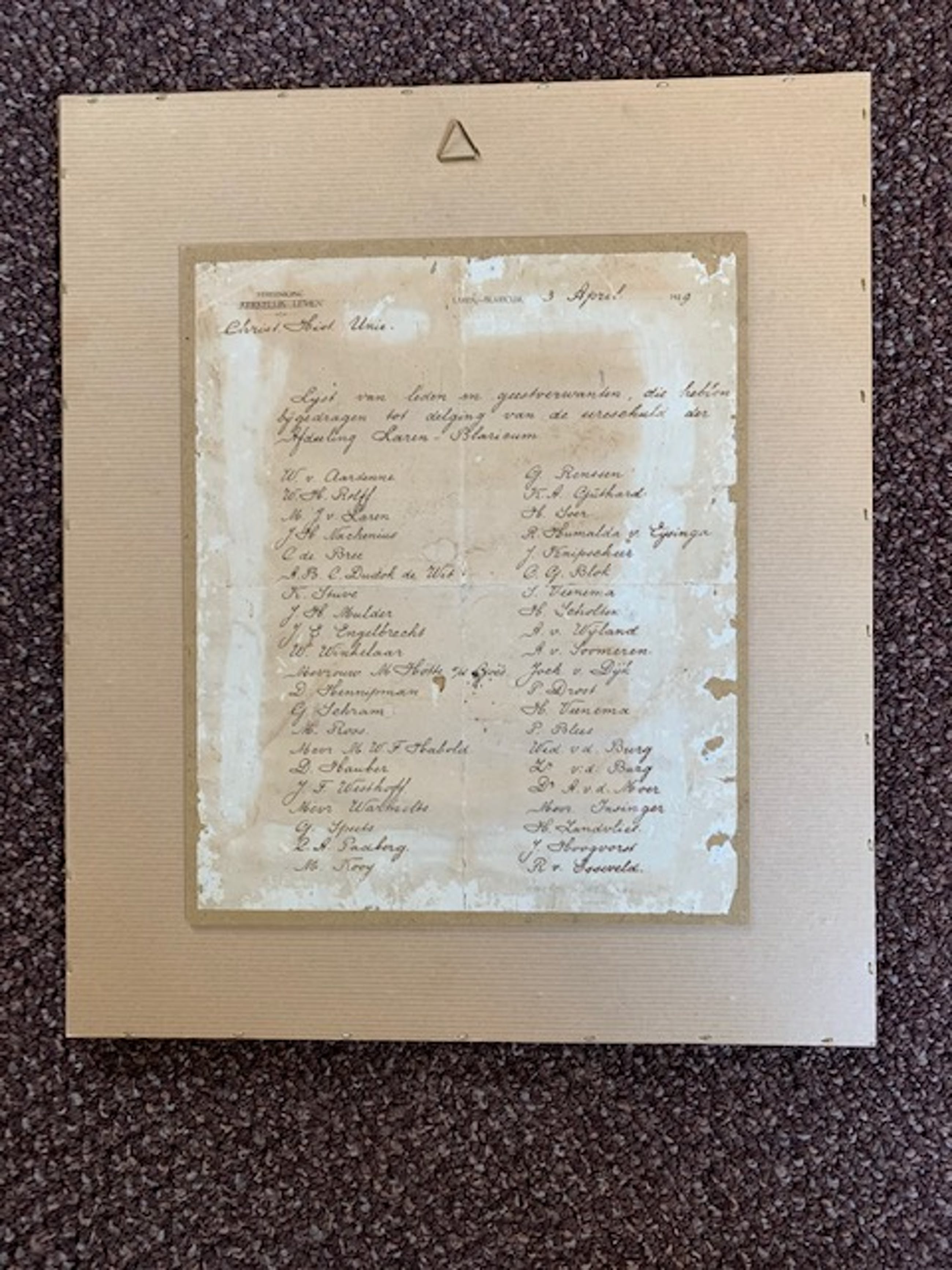 Het stuk is aangeboden op 03 april 1929 door de Christelijke Historische Unie aan de afdeling Laren/Blaricum . Op de achterkant staat een lijst van leden die hebben bijdragen aan de delging van de ereschuld.