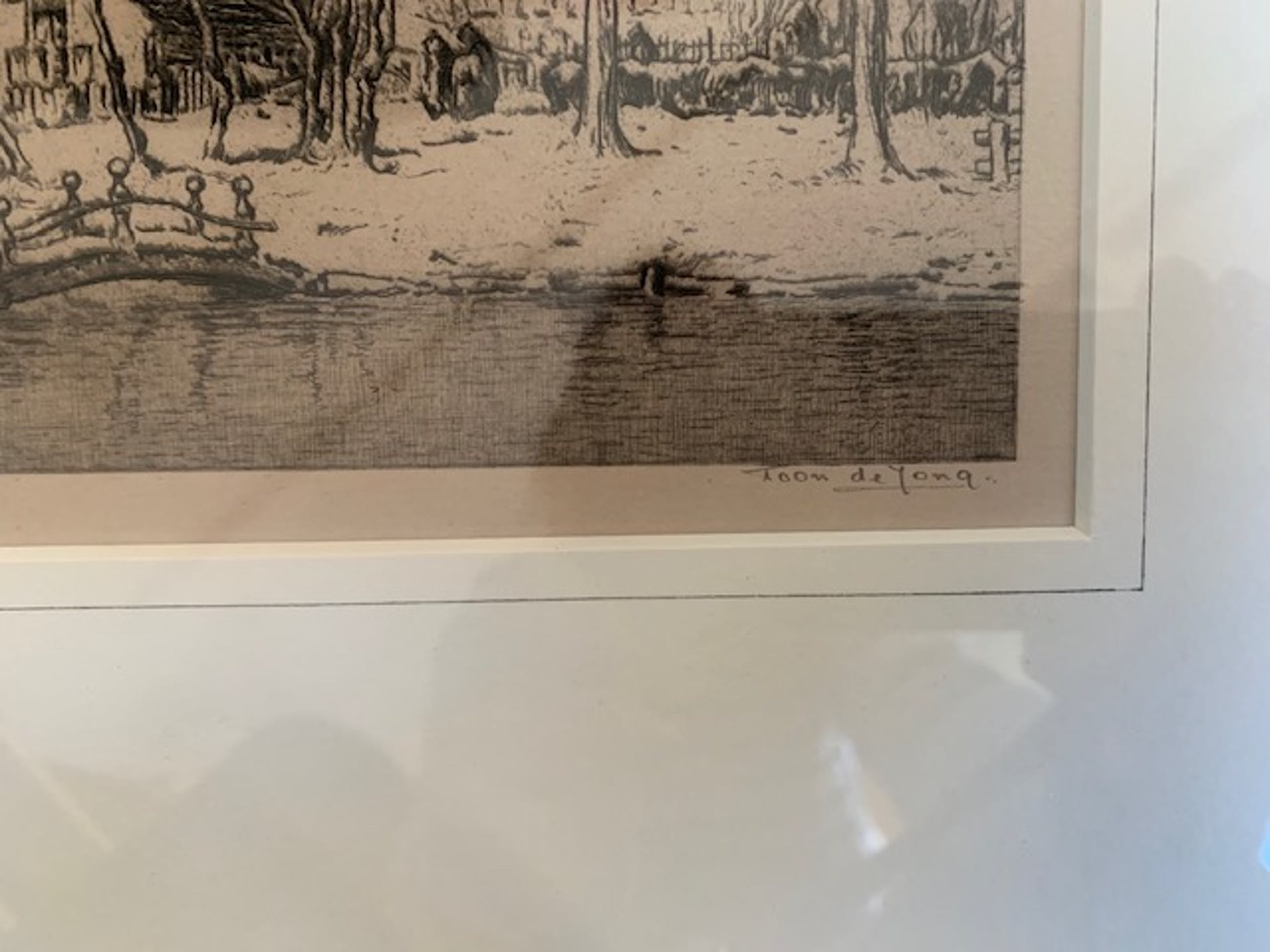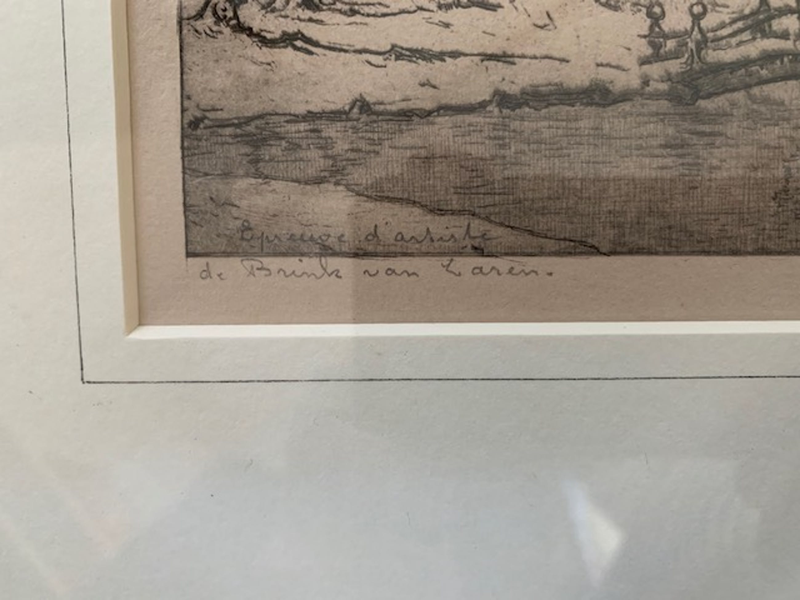 Schitterende ets van Toon de Jong voorstellende de Brink in Laren (NH) met de Johannes Kerk en het Bonte Paard. Hand gesigneerd door Toon de Jong rechtsonder.
