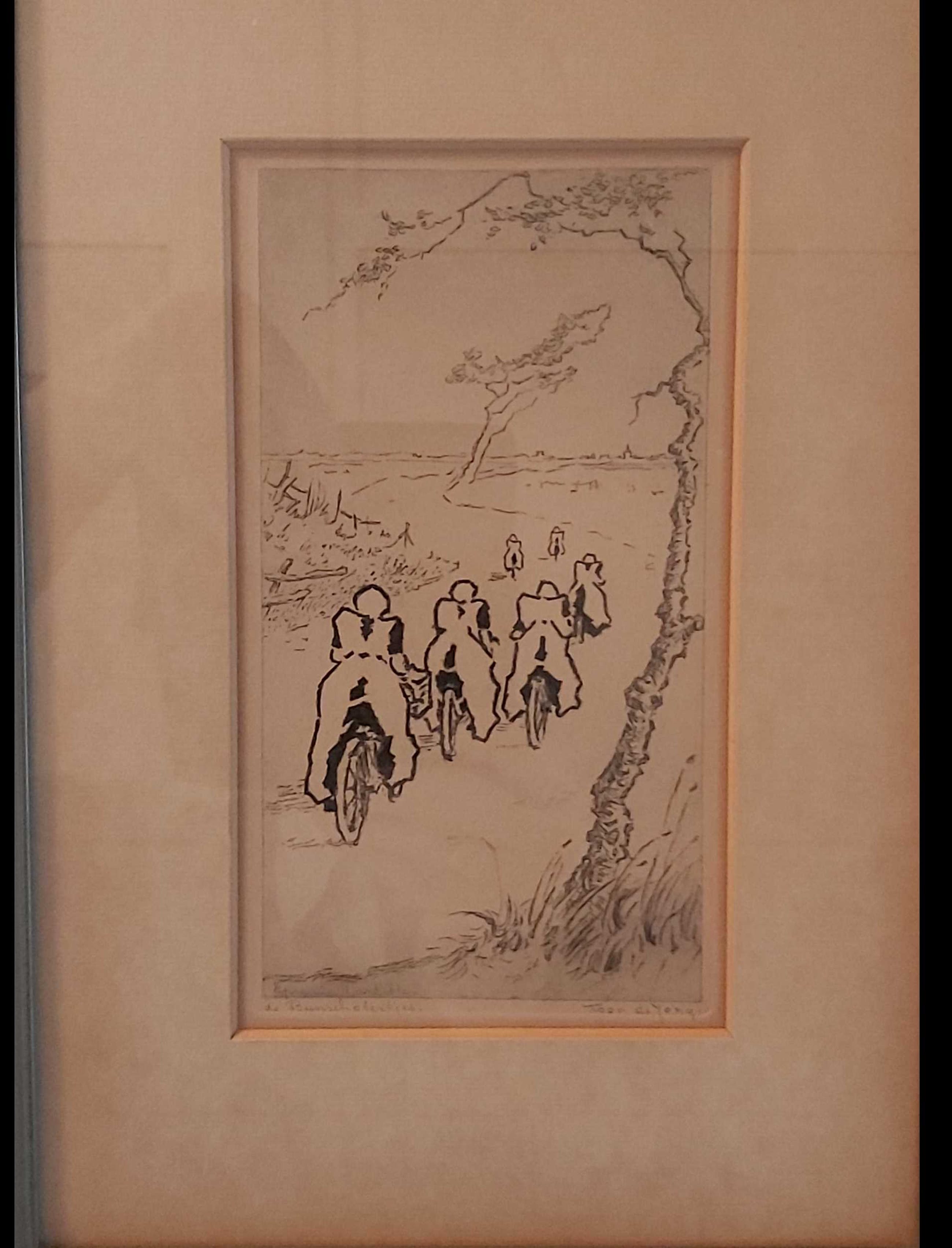 6 fietsende bunschoter dames in klederdracht op de rug gezien in een landschap waarbij de boom rechtsvoor duidelijk is aangegeven en de rest van het landschap subtiel.
