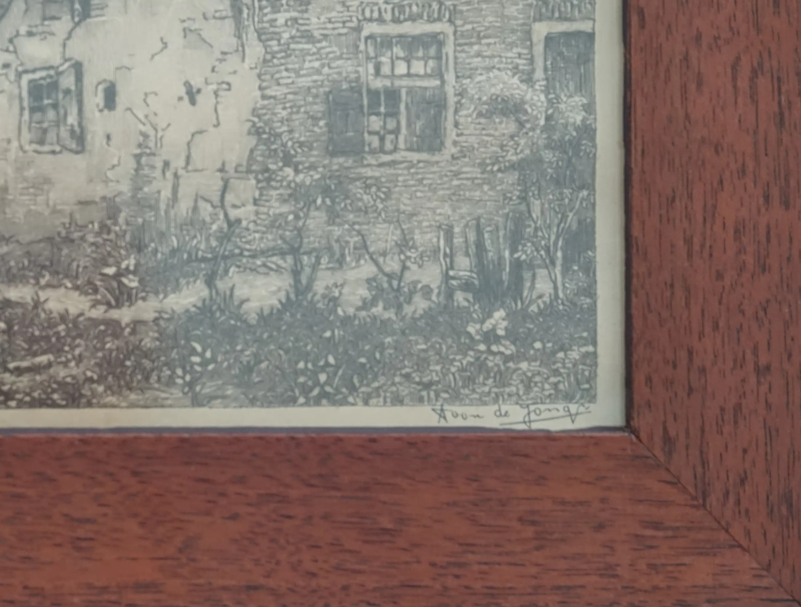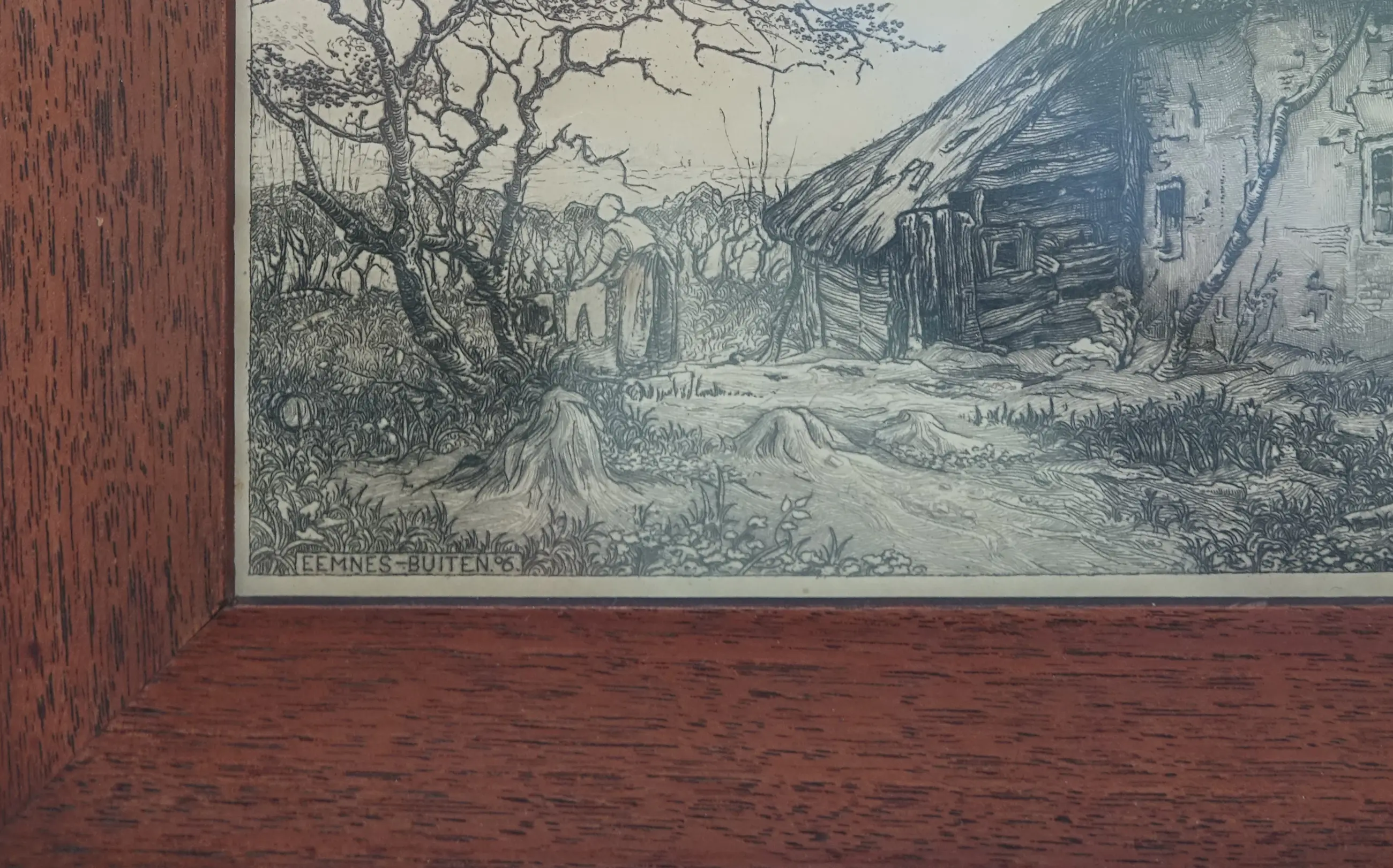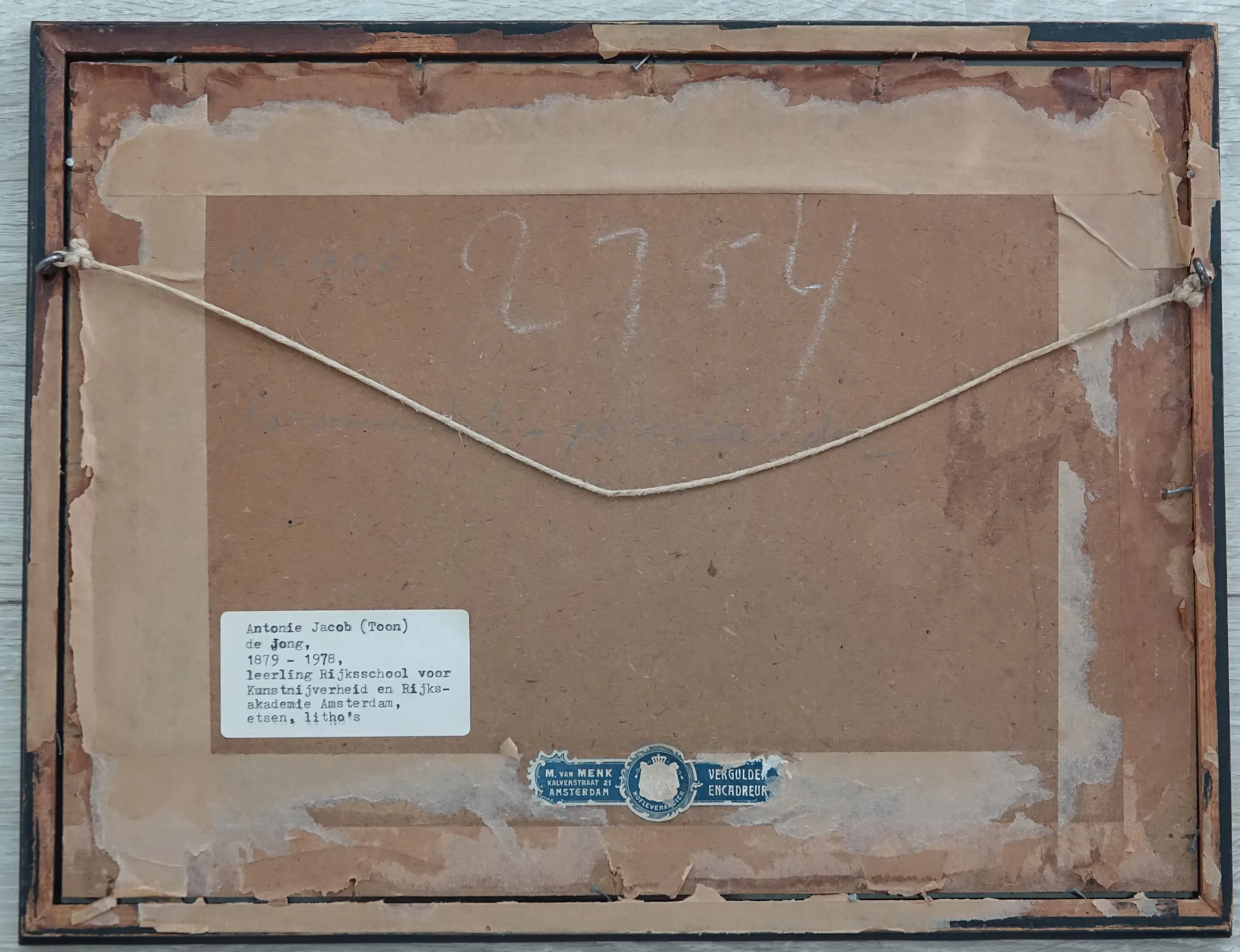 Ets, uitgegeven in 1906 door de Larensche kunsthandel. In luxe houten lijst en passe-partout (coromandel, pallisander). Antonie Jacob (Toon) de Jong (Laren 1879 – Maassluis, 1978) studeerde aan de Rijksschool voor Kunstnijverheid Amsterdam en de Rijksacademie van beeldende kunsten. Hij was een lid van de Amsterdamse kunstenaarsvereniging "Sint-Lucas" en de Larense schildersvereniging De Tien. Als schilder, etser en tekenaar hanteerde hij een naturalistisch-impressionistische stijl. Hij maakte vooral landschappen en portretten. De Jong woonde en werkte in Laren en tekende veel van zijn werken in Het Gooi.