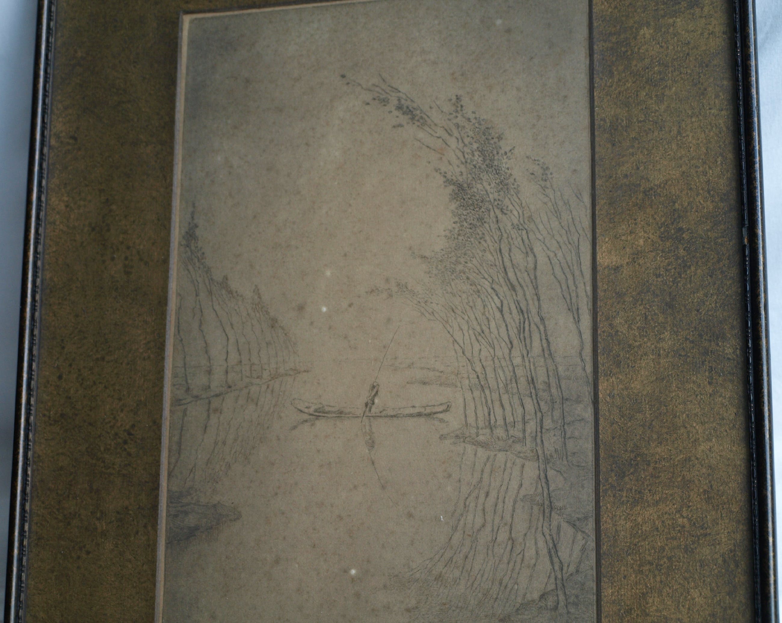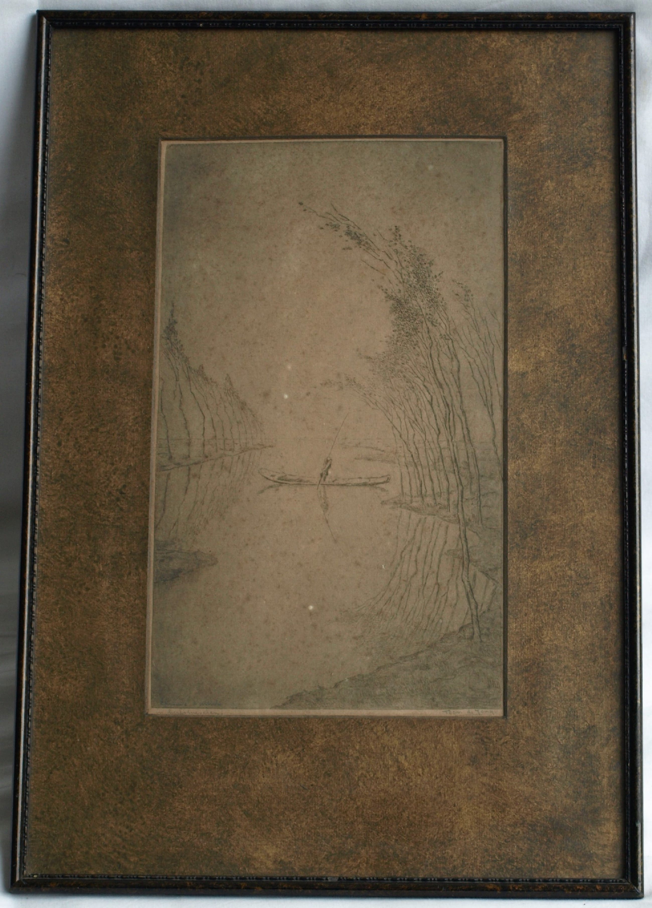 Een ingelijste ets van de Larense kunstenaar Toon de Jong (1879-1978), getiteld “In herfstnevelen”.