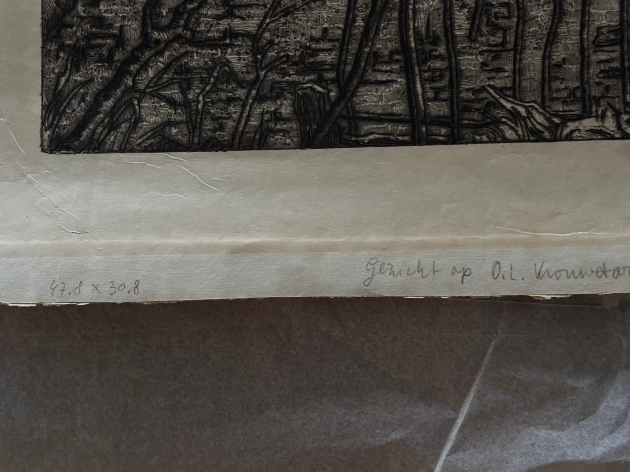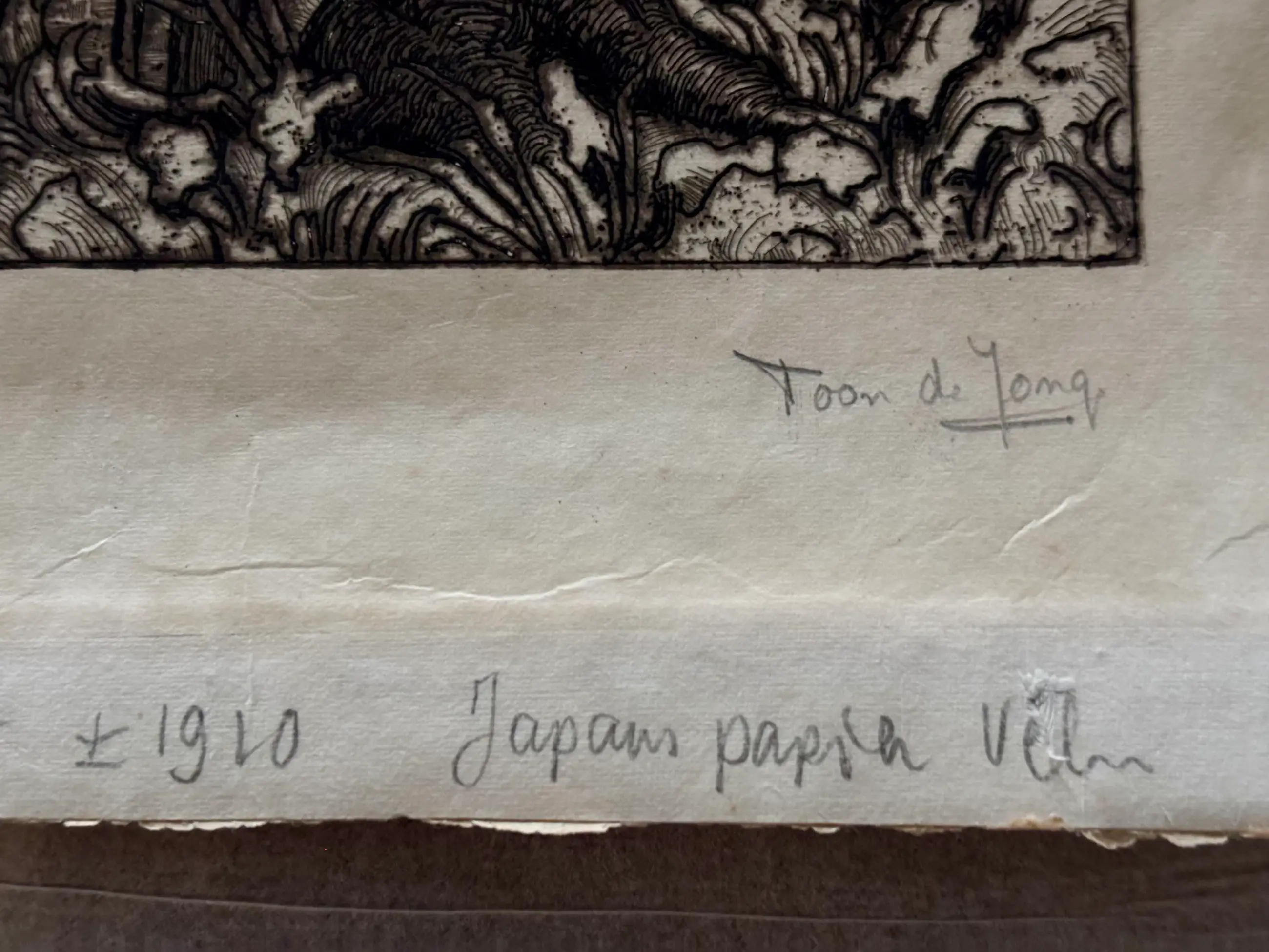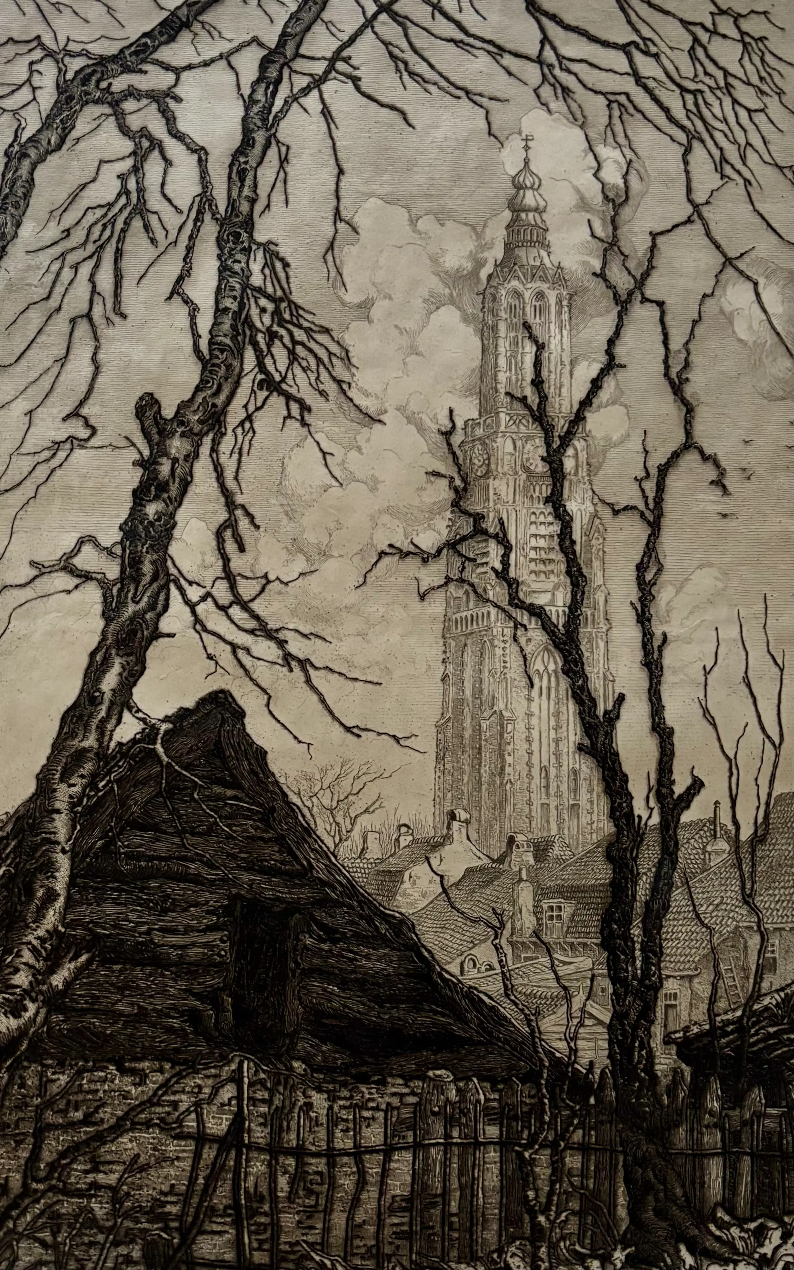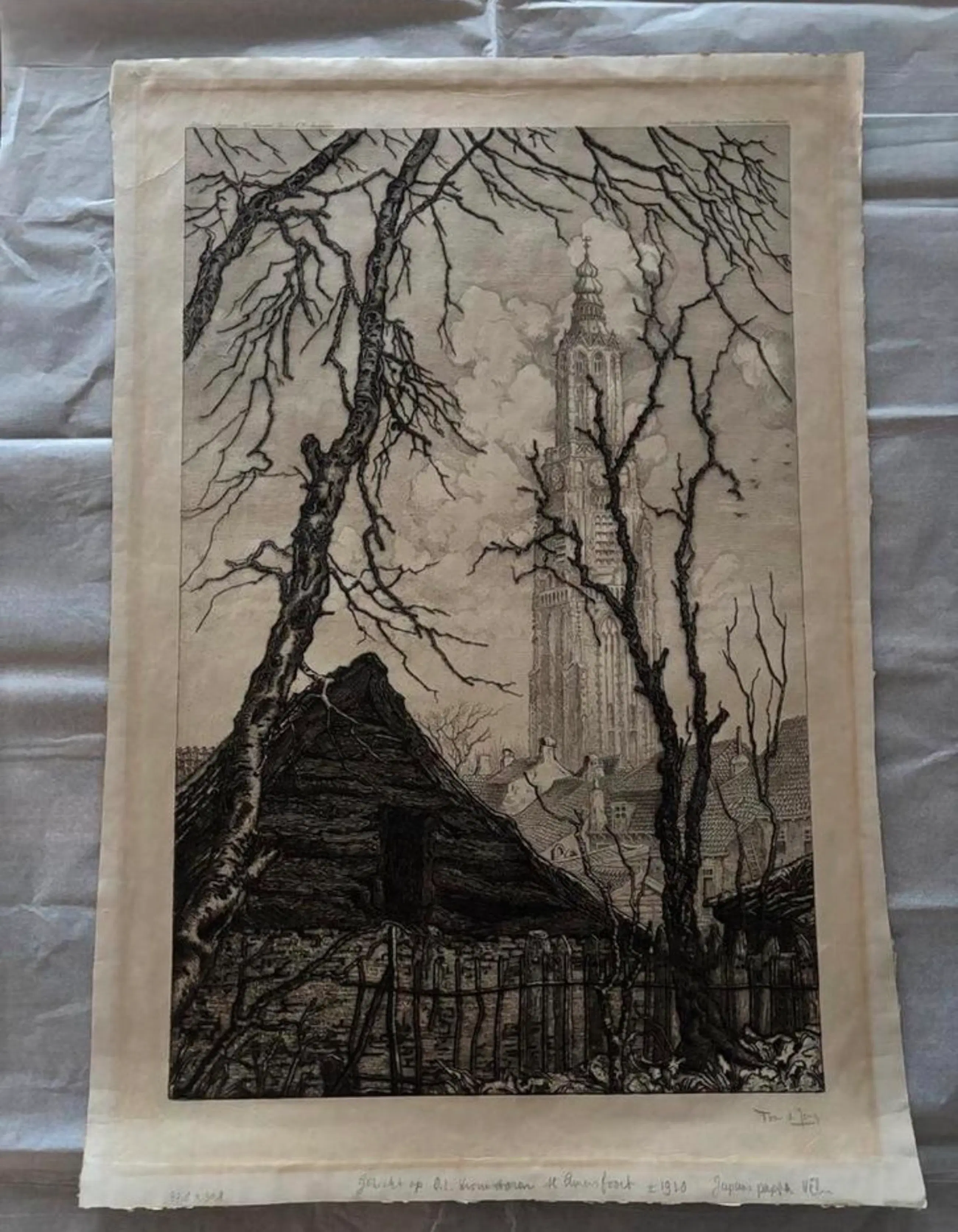Prachtige gravure van Toon de Jong, voorstellende een gezicht op Amersfoort met de Onze Lieve Vrouwetoren. Gedrukt in 1910 op Japans papier. Gesigneerd door de kunstenaar. In goede staat. Afmeting circa 47 x 30.5 cm.