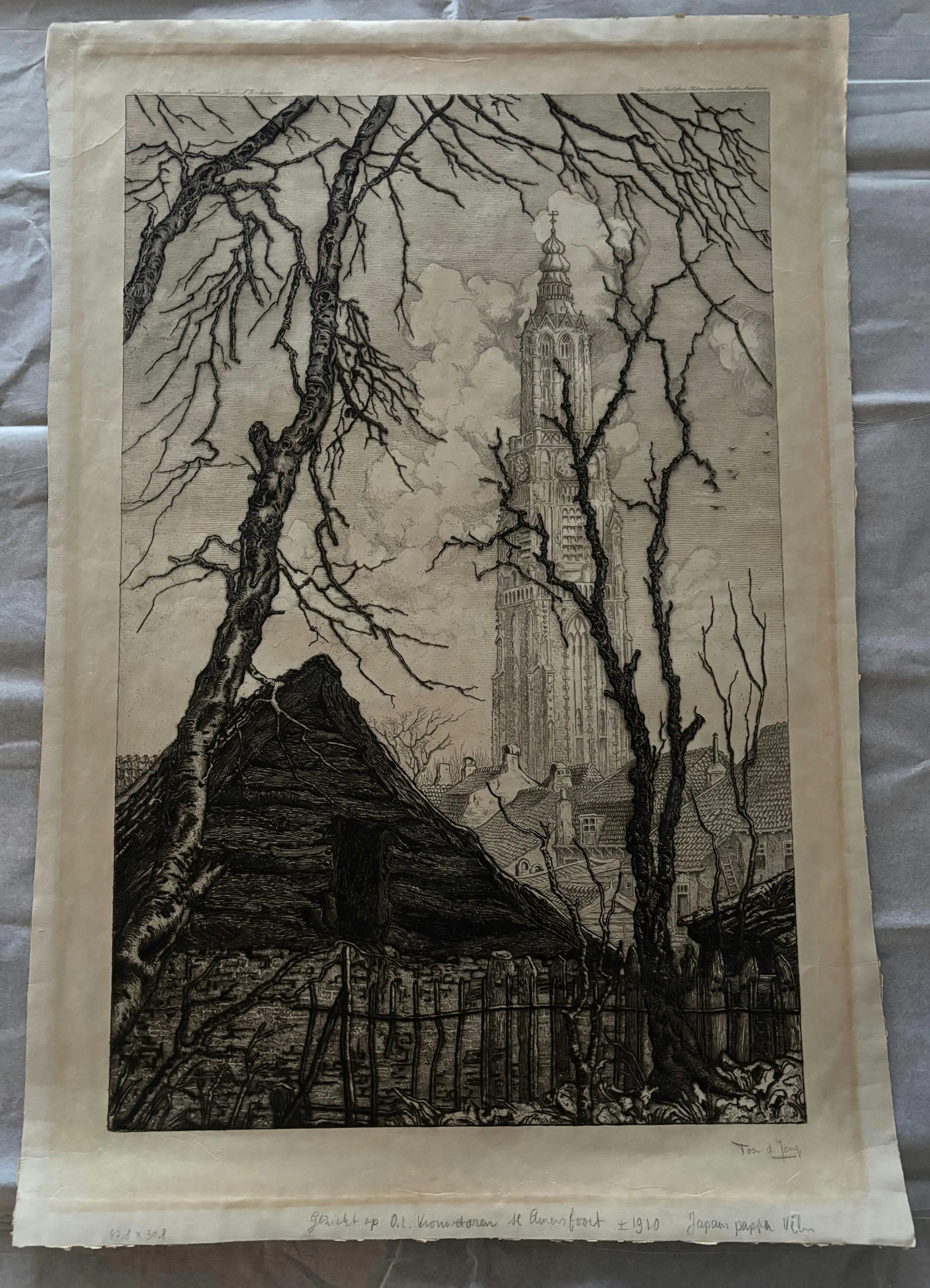 Prachtige gravure van Toon de Jong, voorstellende een gezicht op Amersfoort met de Onze Lieve Vrouwetoren prominent en prachtig gedetailleerd getekend.