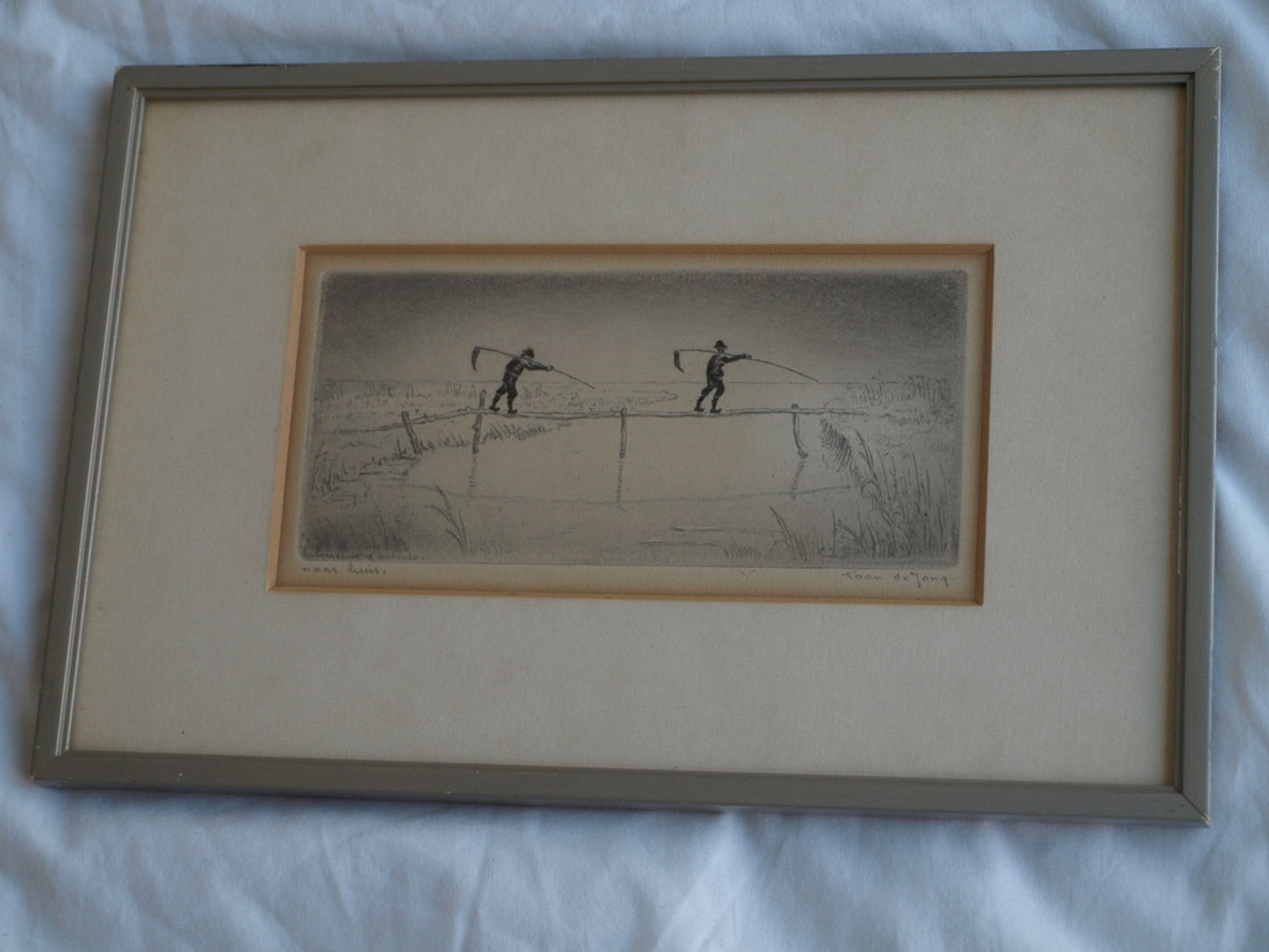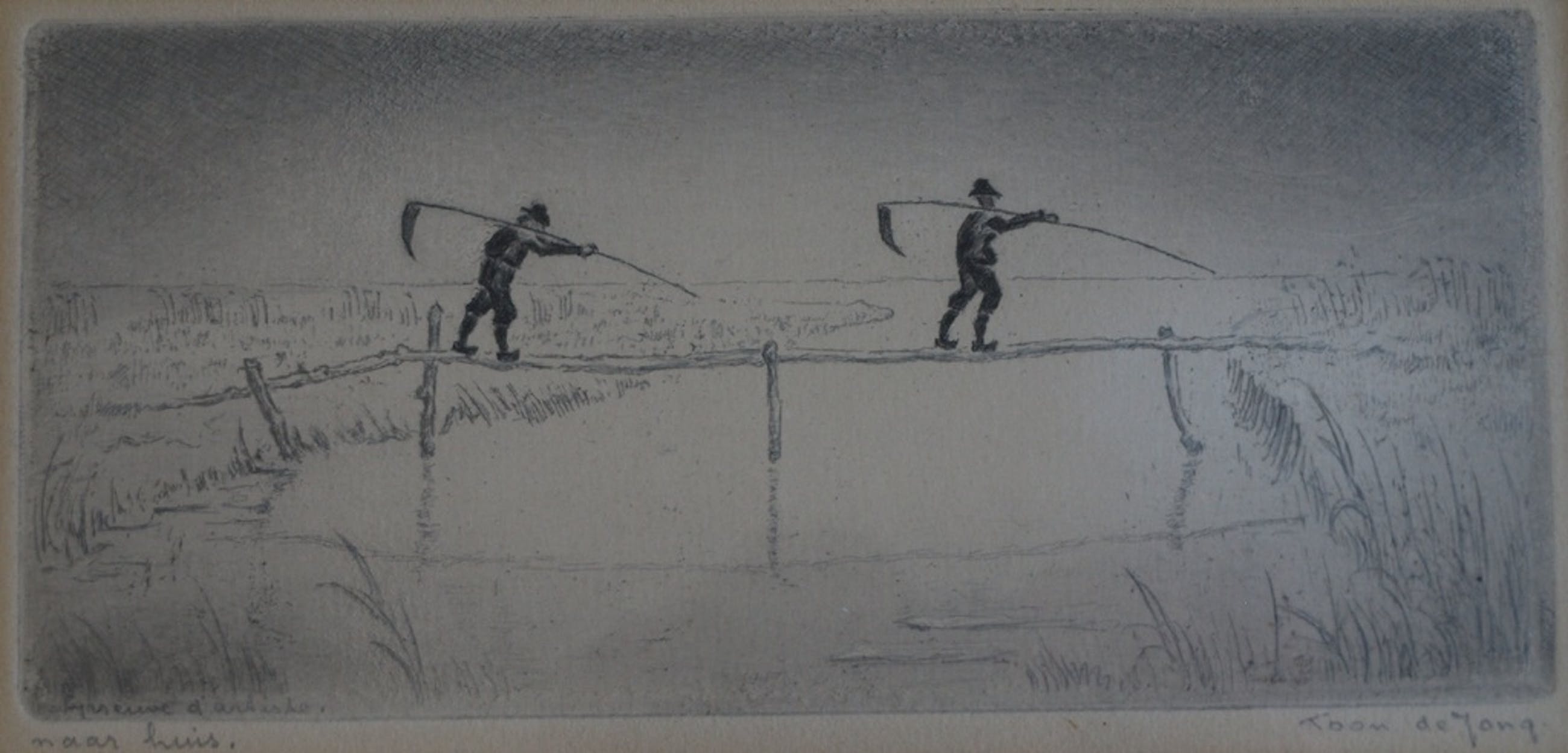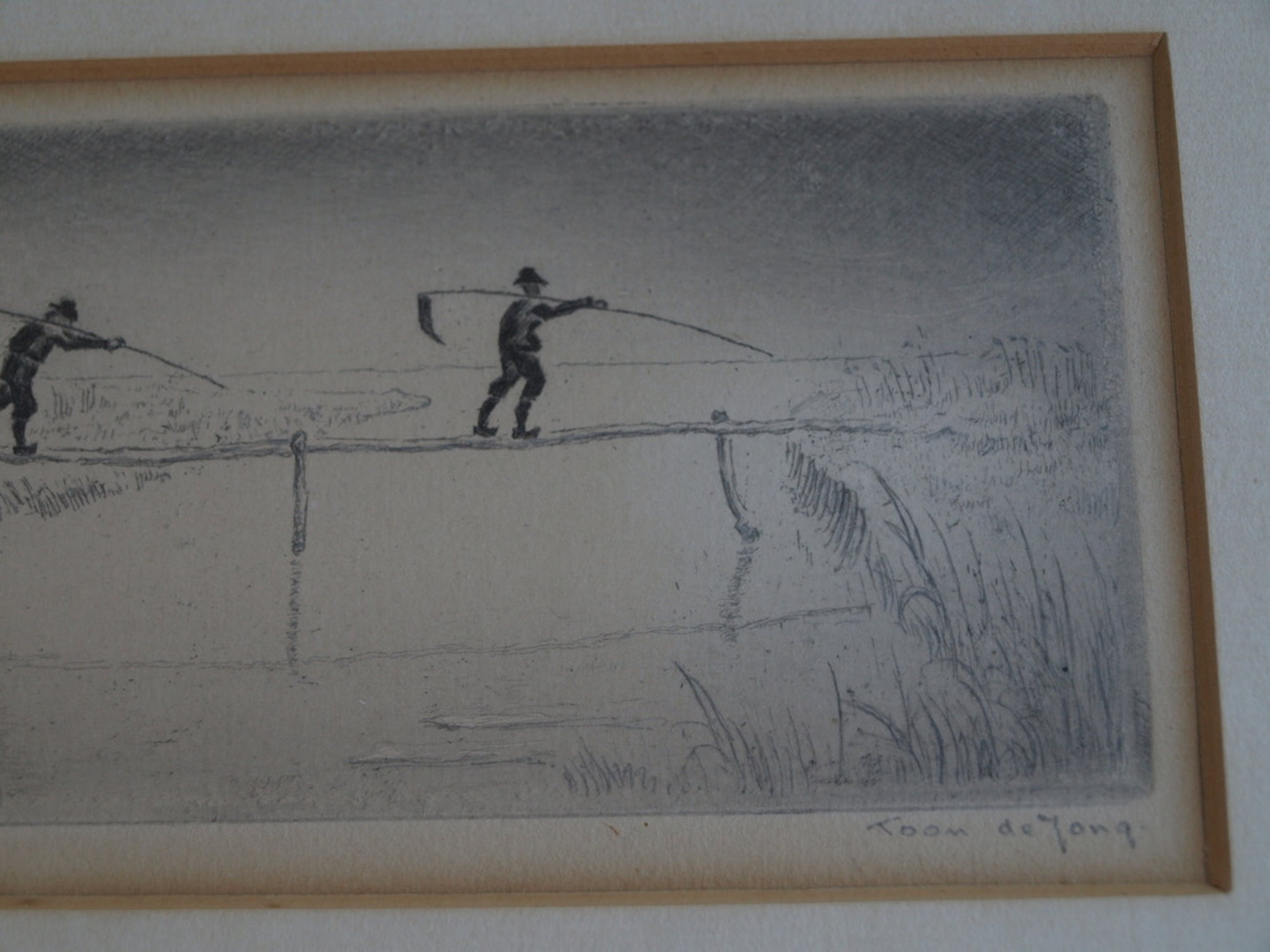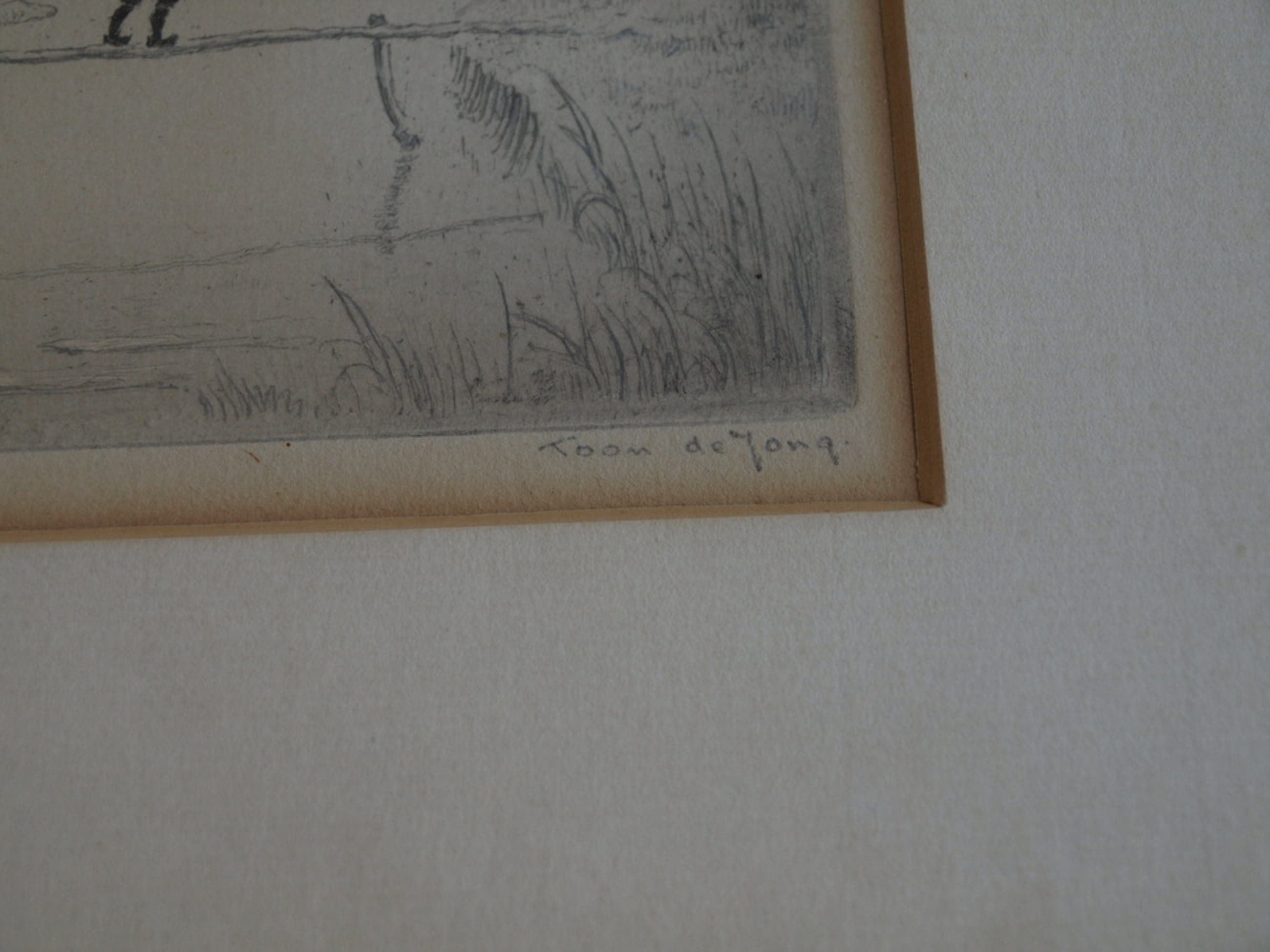 Een ingelijste ets van de Larense kunstenaar Toon de Jong (1879-1978).
