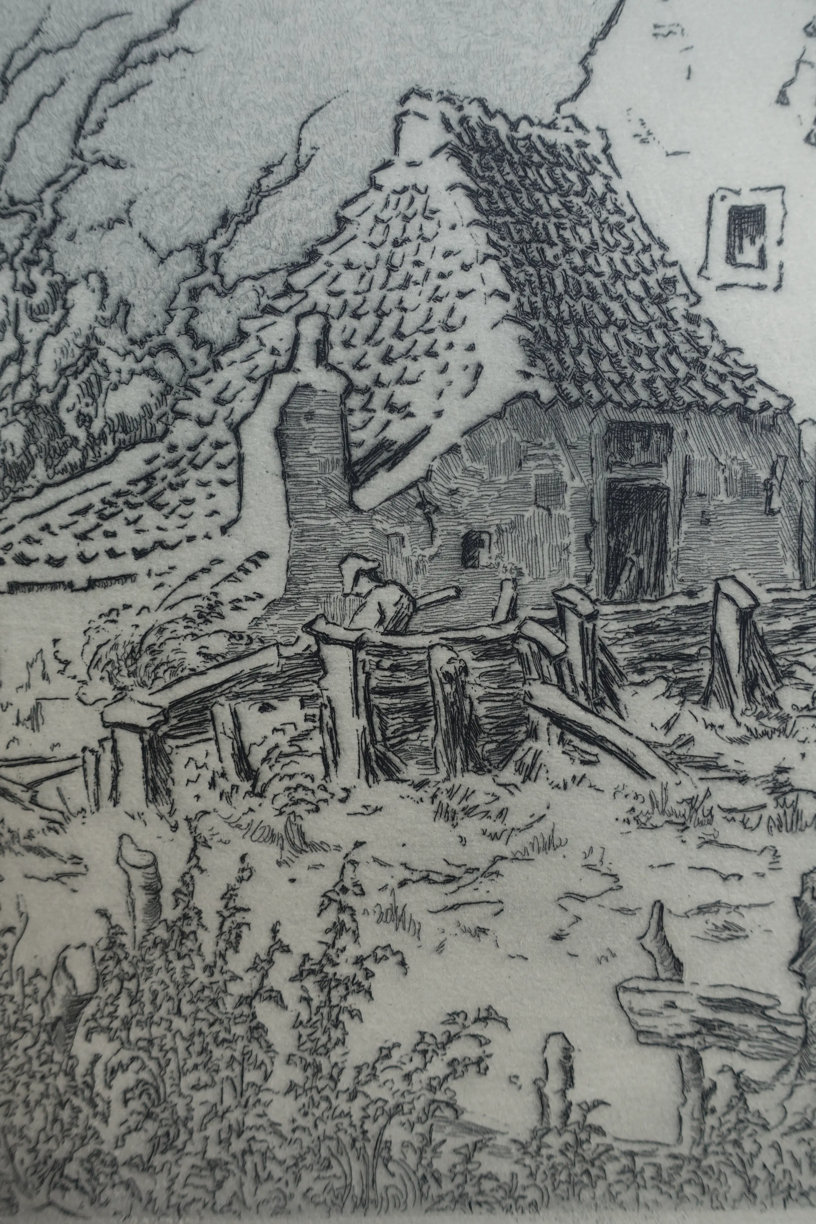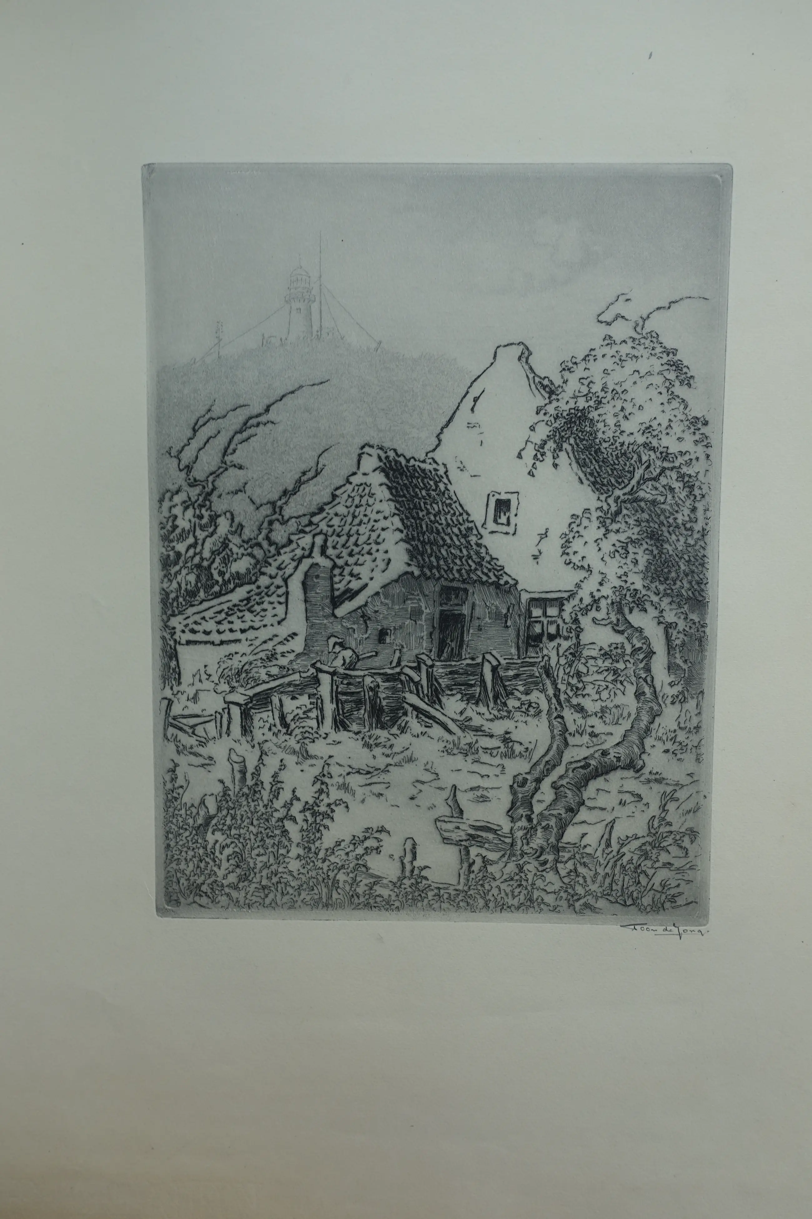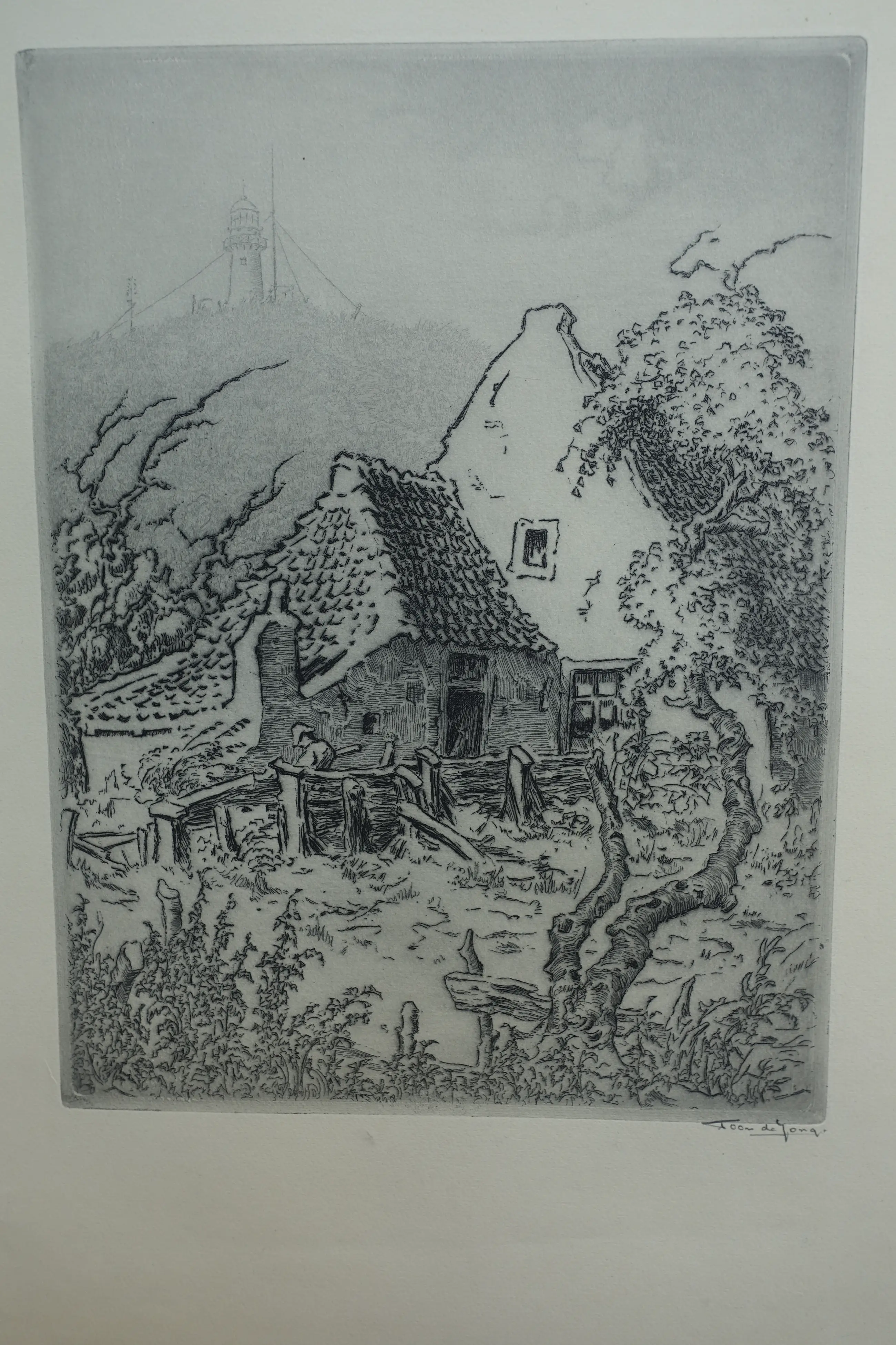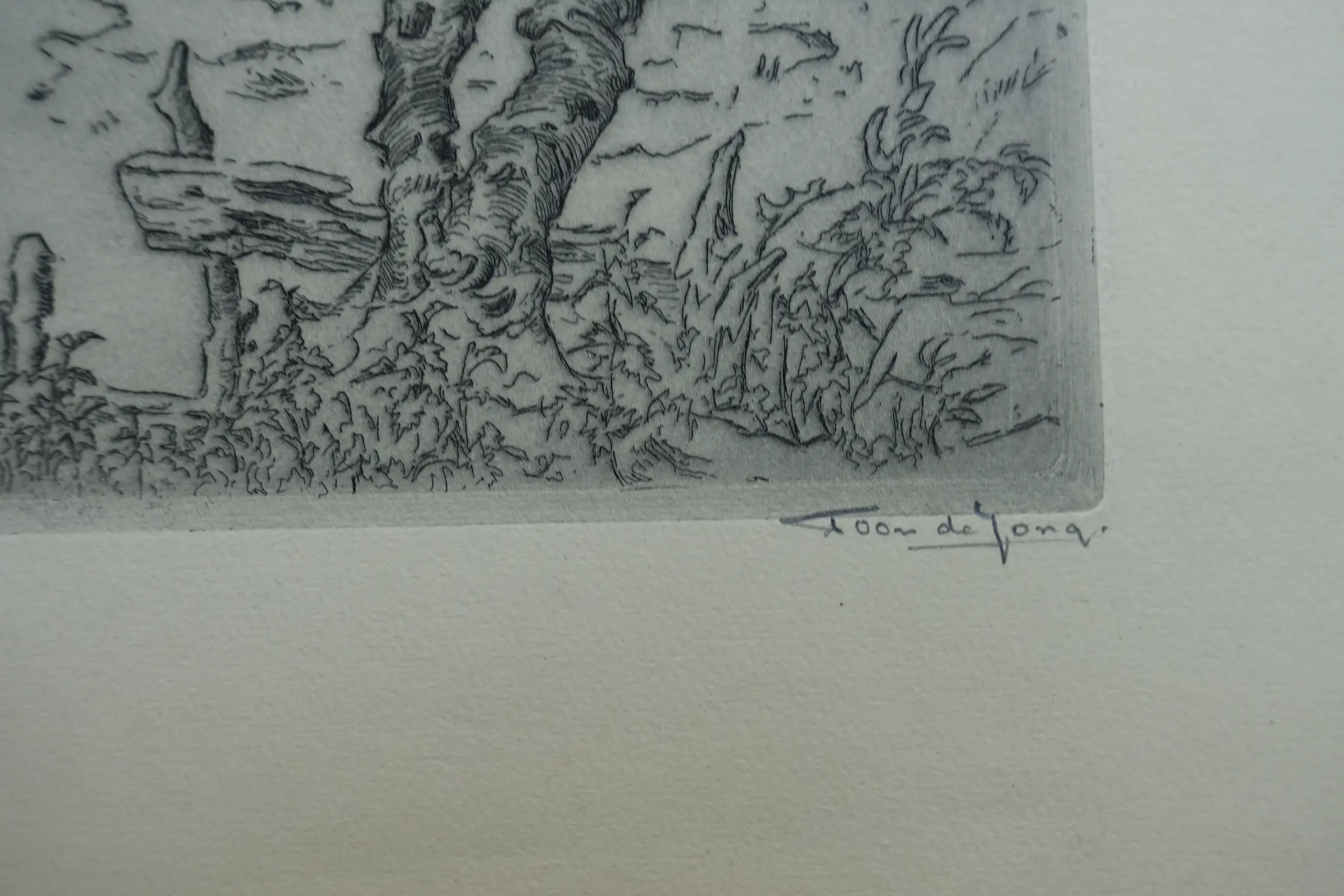 Klassieke prent van Toon de Jong uit de eerste helft van de vorige eeuw. Uitstekende conditie. Gesigneerd r.o. met potlood. Deze ets is afgedrukt op een blad met een formaat van 56 x 35.5 cm. Onberispelijke marges.