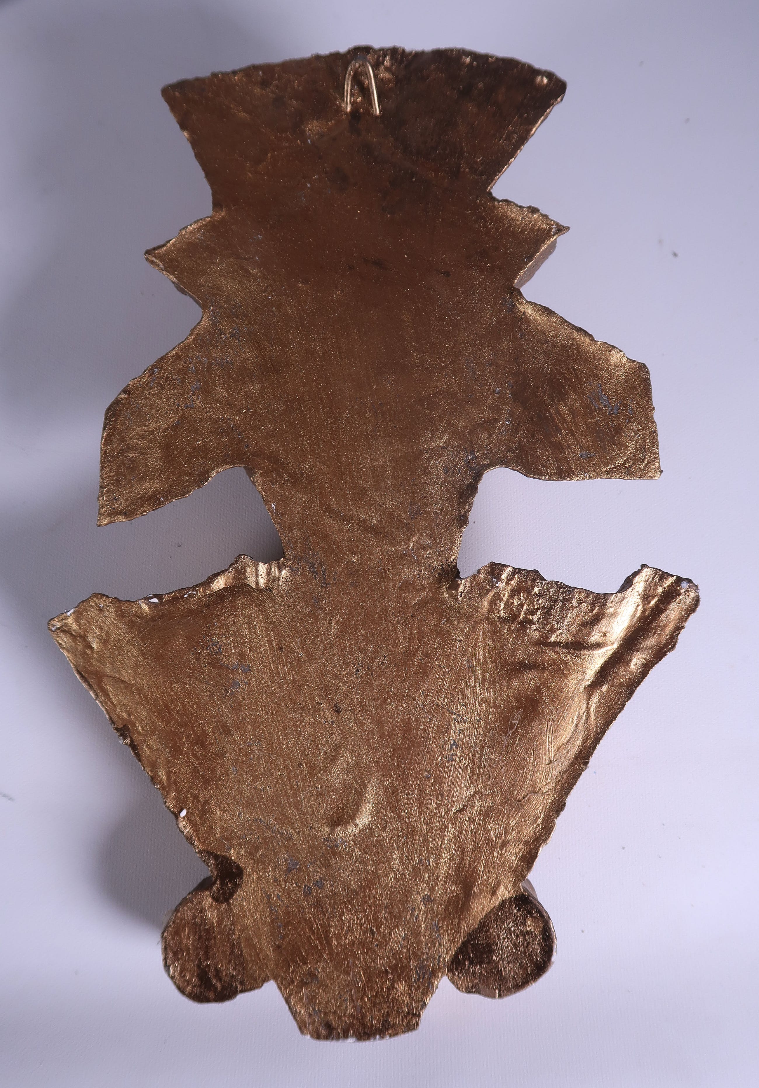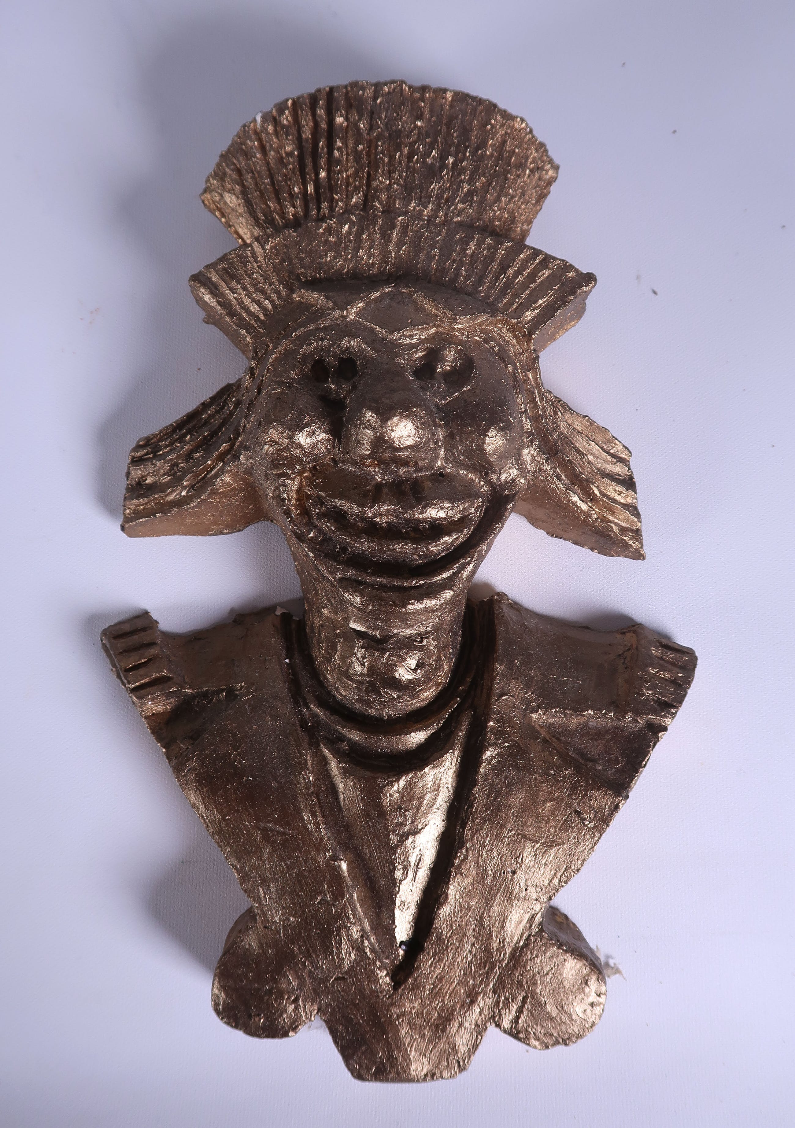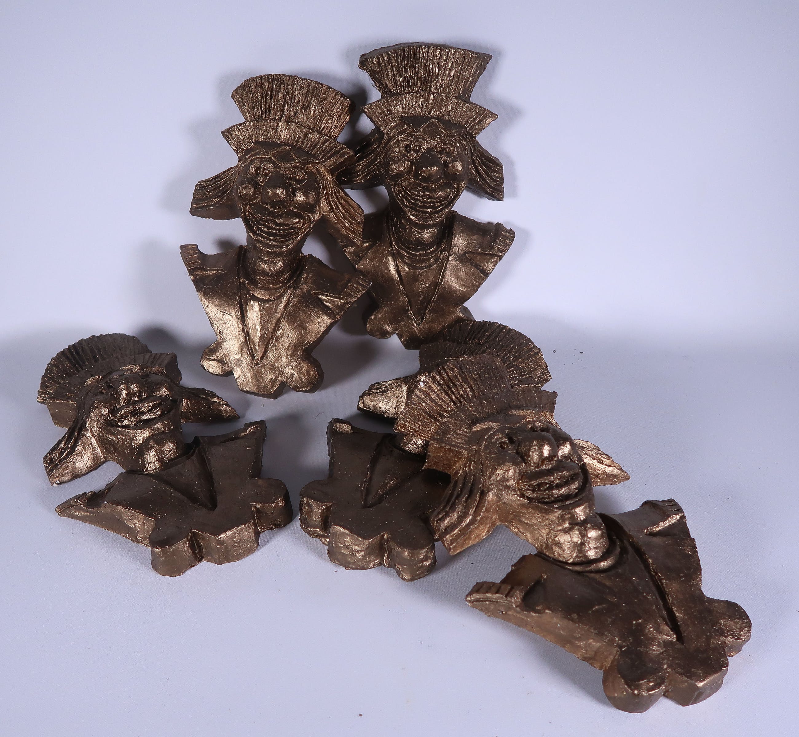 Lot van vijf goud beschilderde clowntjes. Alle clowntjes zijn aan de achterzijde voorzien van een metalen ring, zodat de clowtjes ook opgehangen kunnen worden.