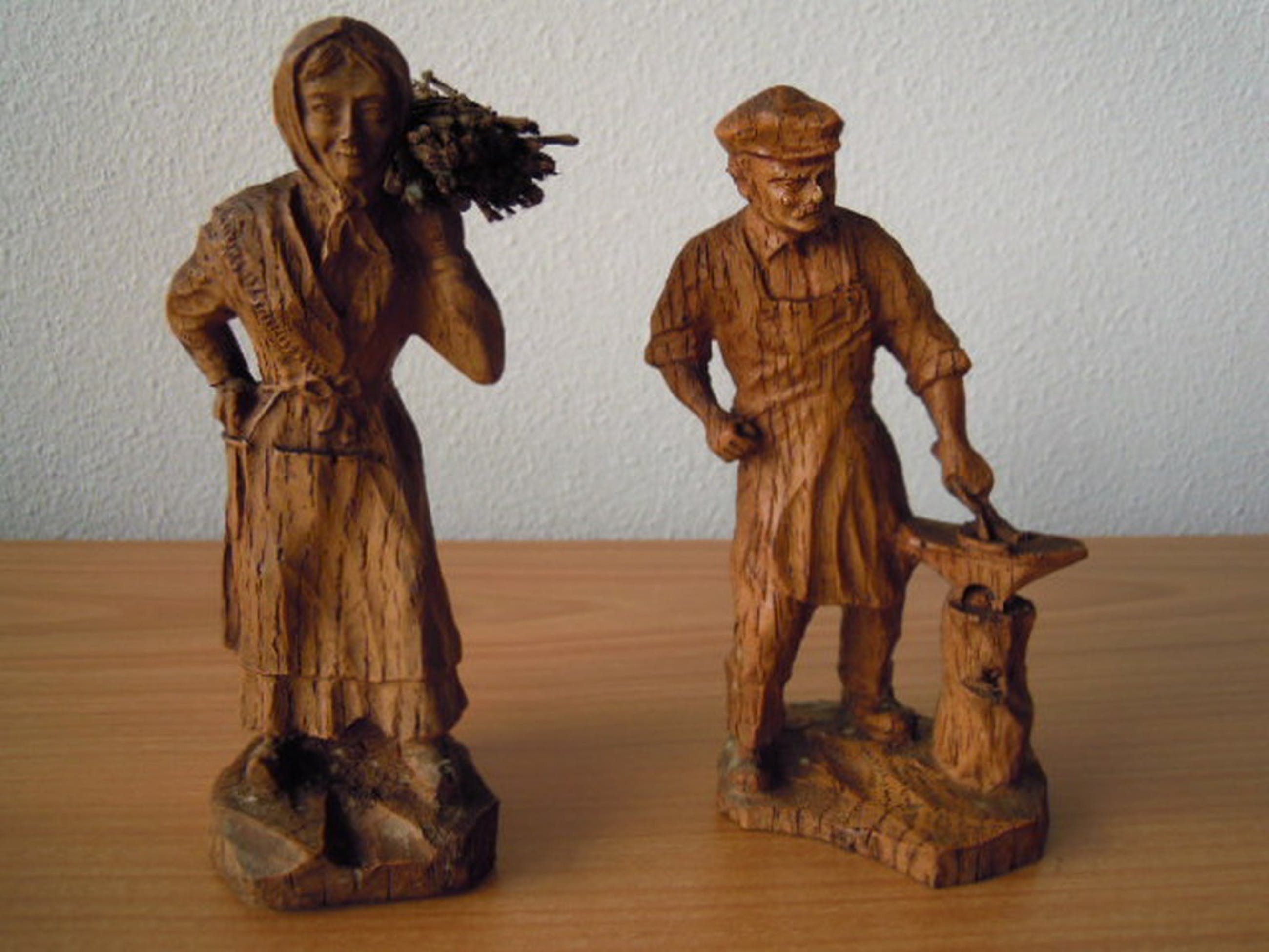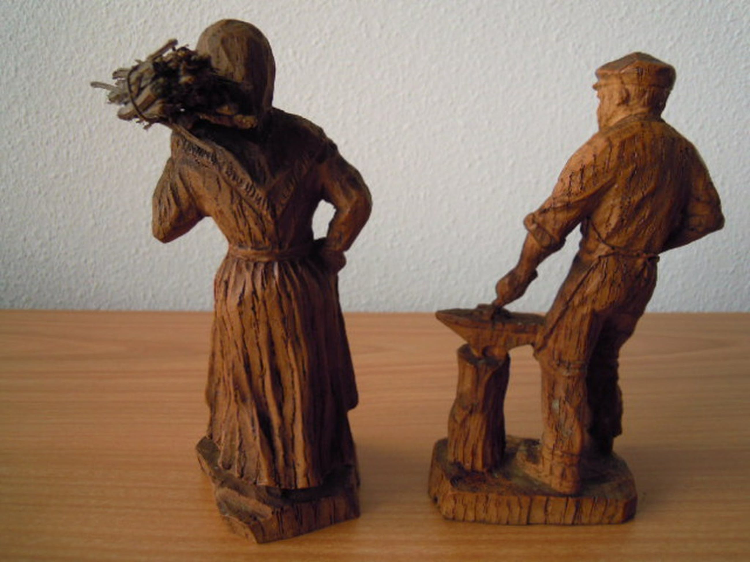 De twee kleinere beelden 17 cm hoog zijn van hout en met de hand gemaakt en niet gesigneerd..