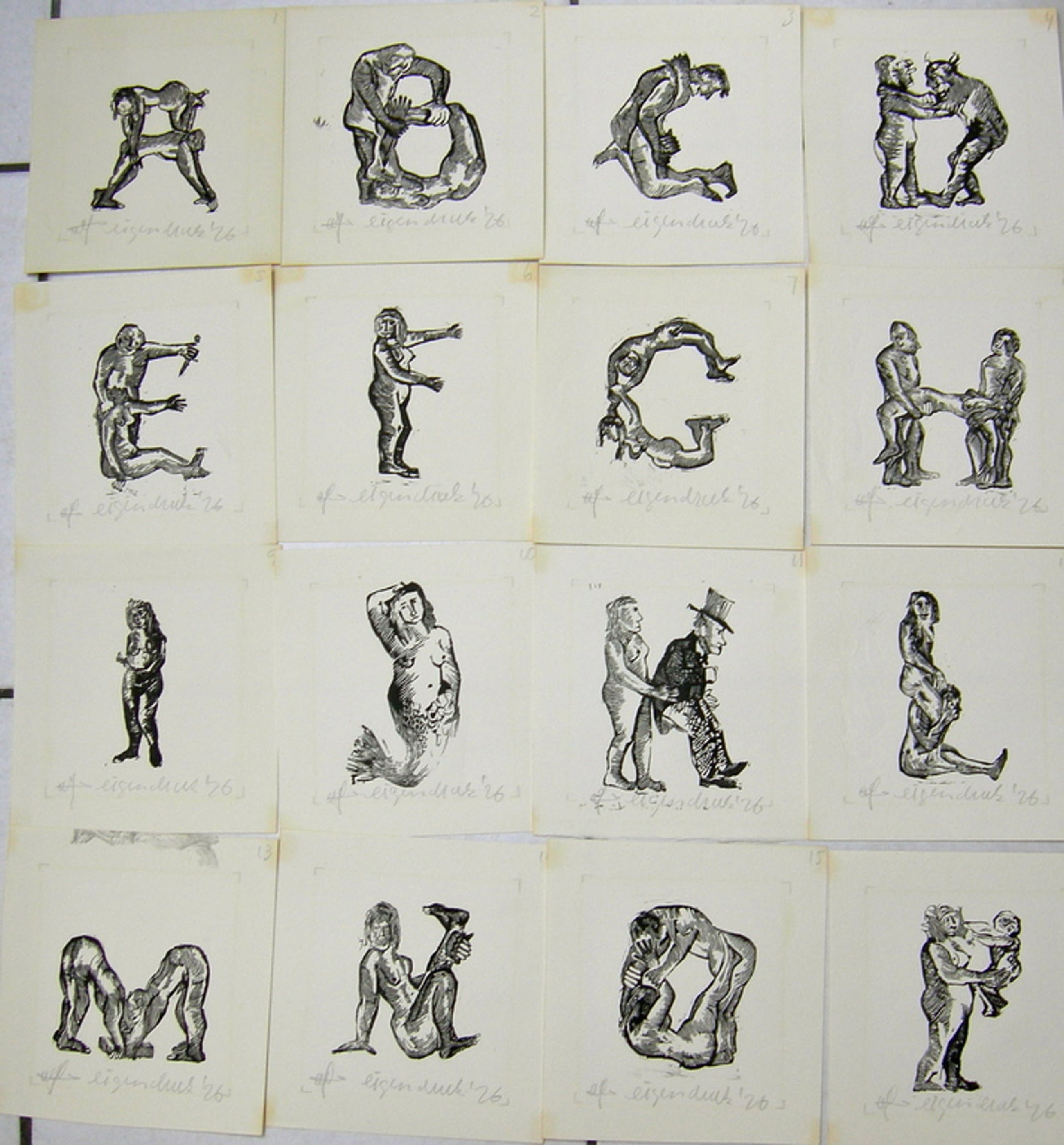 26 houtsnedes voorstellende het alfabet A t/m Z afgebeeld door menselijke figuren, alle 26 zijn gesigneerd, formaat per voorstelling/letter afbeelding 10,5 x 11,5 cm., papierformaat 14,5 x 15,5 cm.