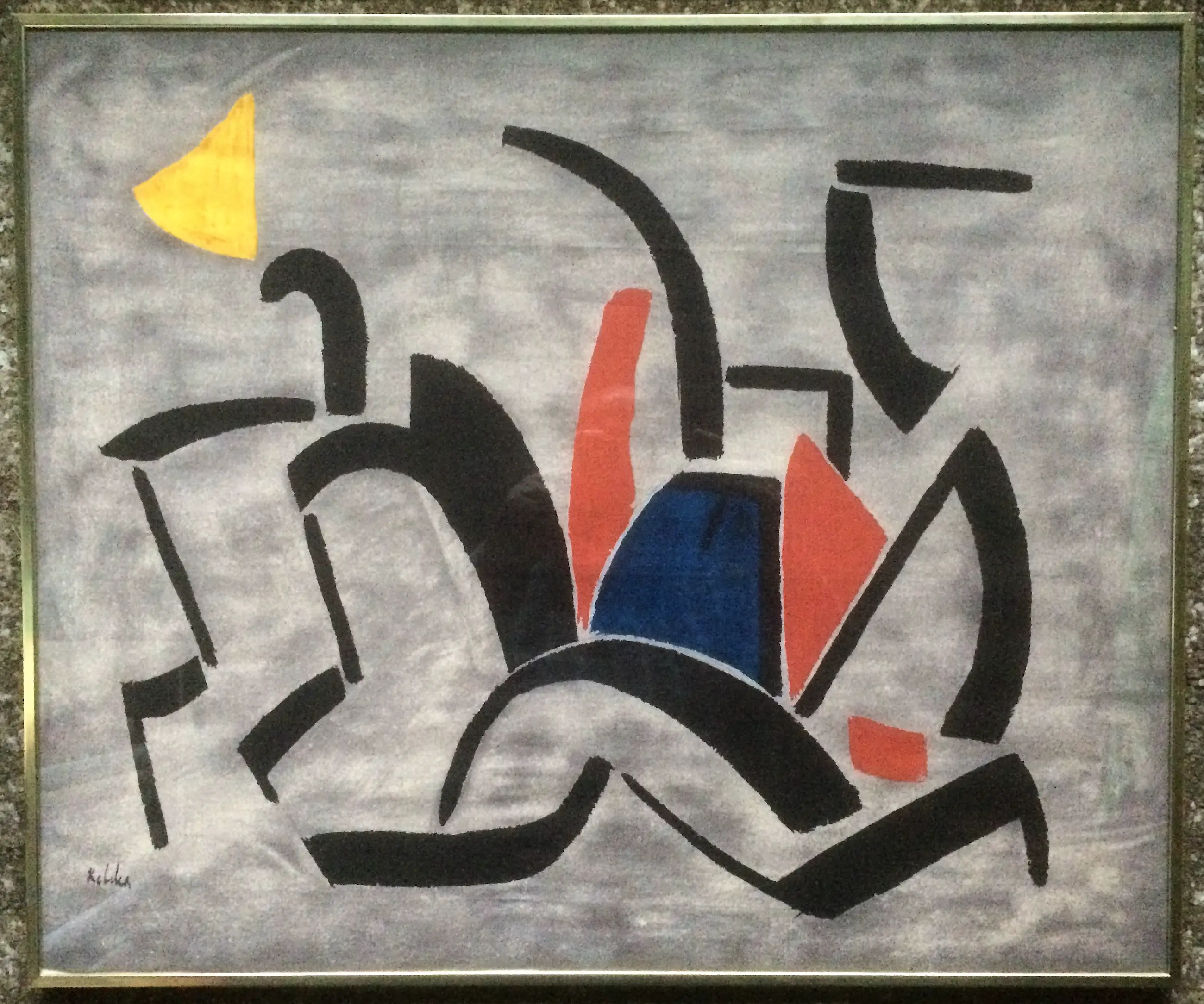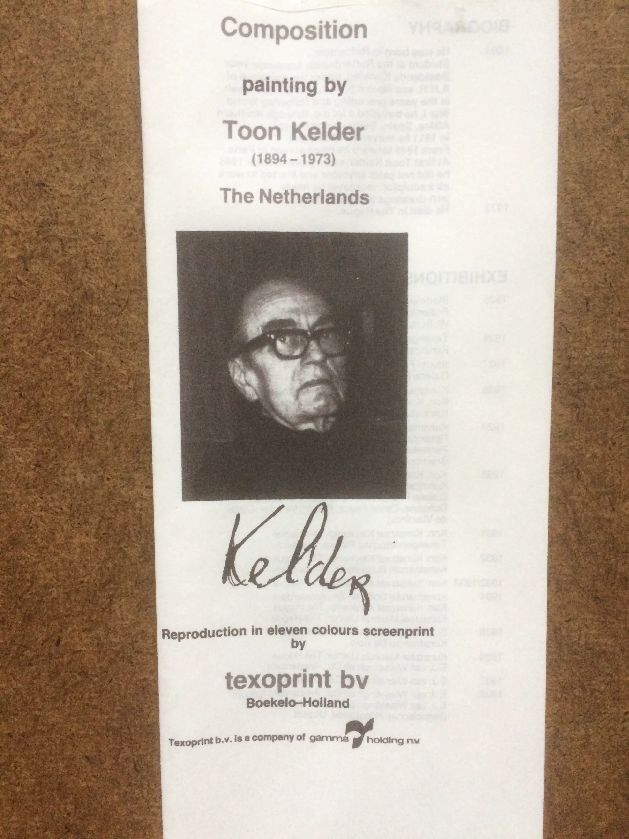 Titel: Composition Uitvoering: Texoprint Jaartal: 1987 Ingelijst: Lijst 50 cm x 60 cm Gesigneerd: Ja, in de druk Materiaal: Zeefdruk op katoenzijde