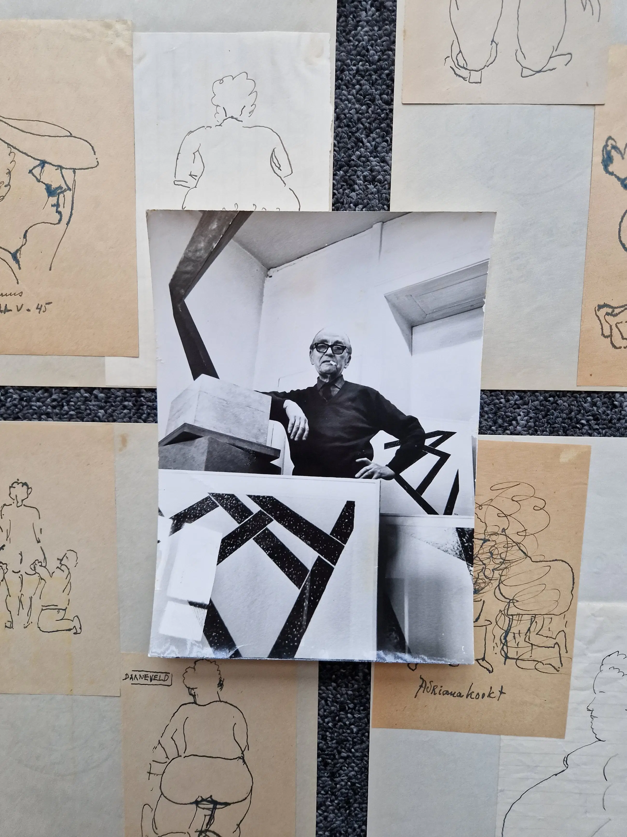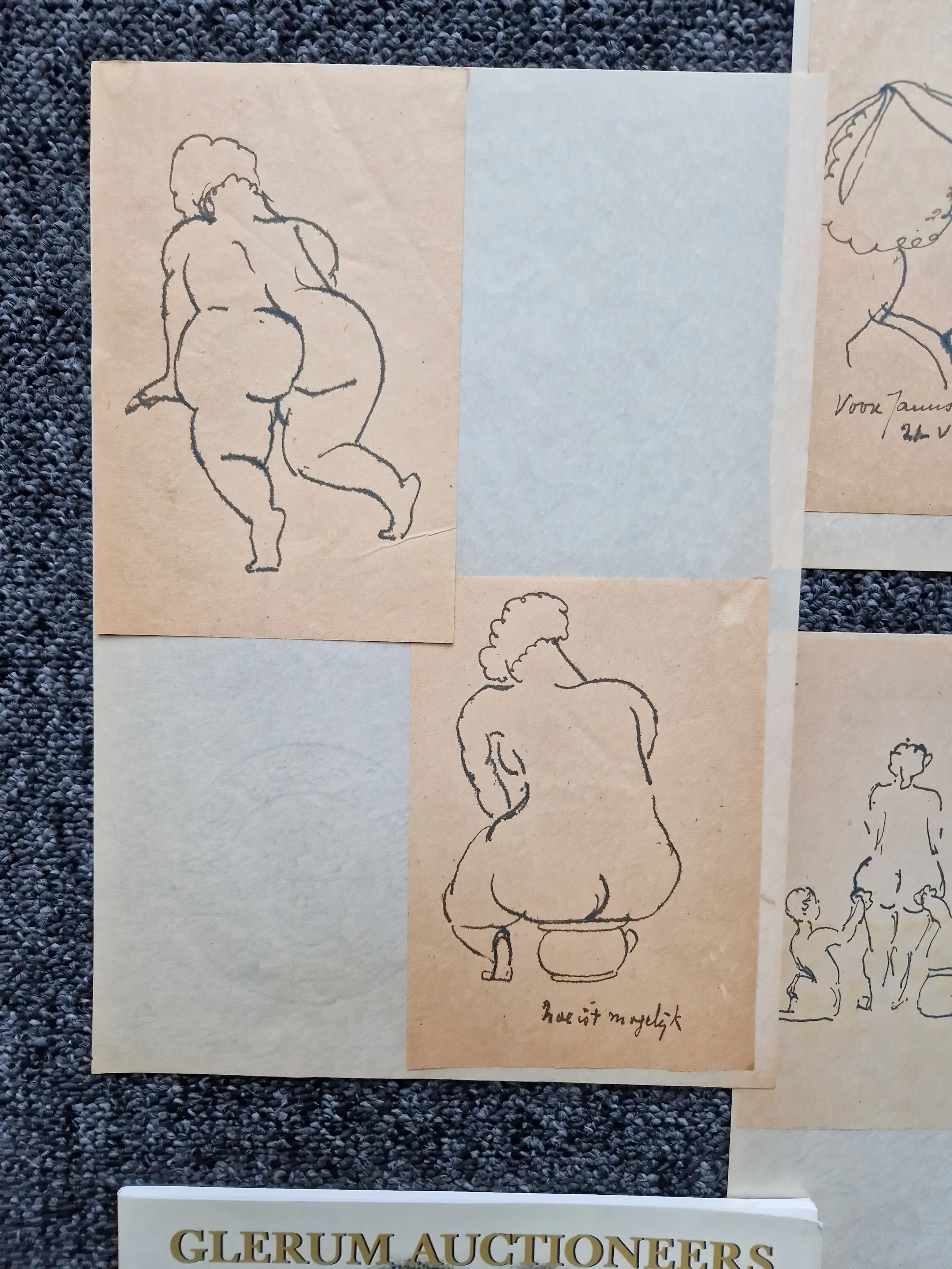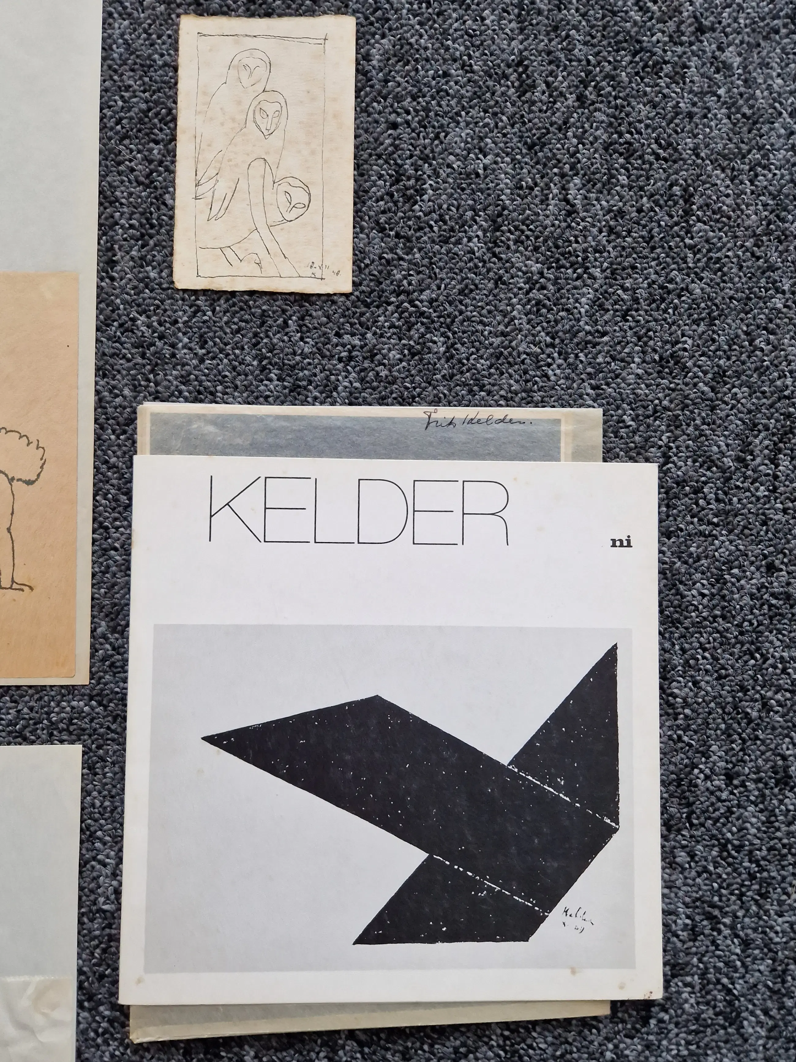 Een interessante verzameling bestaande uit een grote minimalistische 1949 inkt/sepiatekening van een zittend vrouwelijk naakt (afm. 35x30cm). Daarnaast 11 kleine inkt (schets)tekeningen met voornamelijk naakte corpulente dames als onderwerp. Een originele zwart wit foto van Toon Kelder himself - een originele 1960 Stedelijk Museum tentoonstellingscatalogus, Dito jaren 70 galerie Nouvelles Images den Haag expositiecatalogus (met losse foto's) en een Glerum Auct. catalogus van de december 2004 toon Kelder veiling.