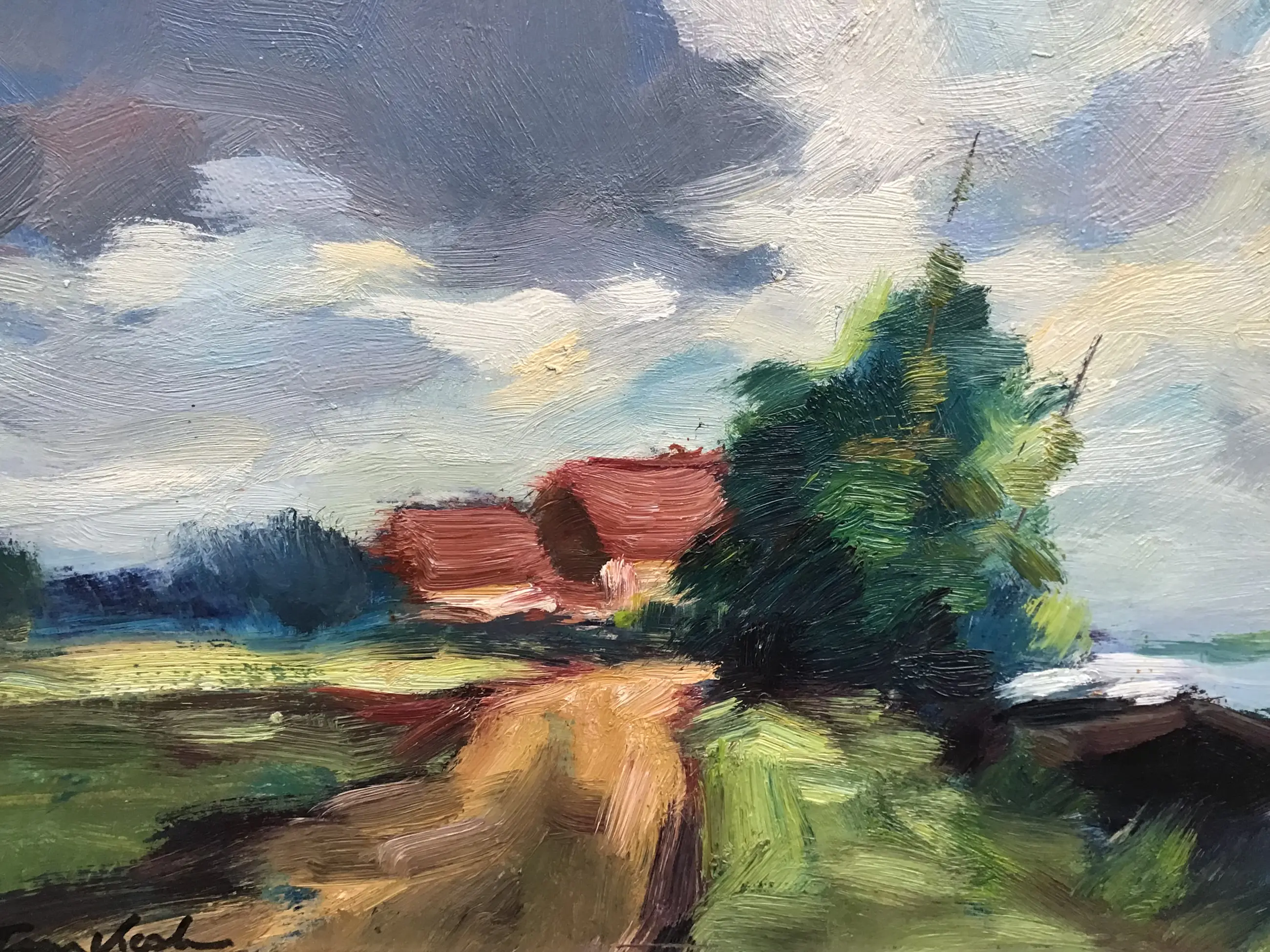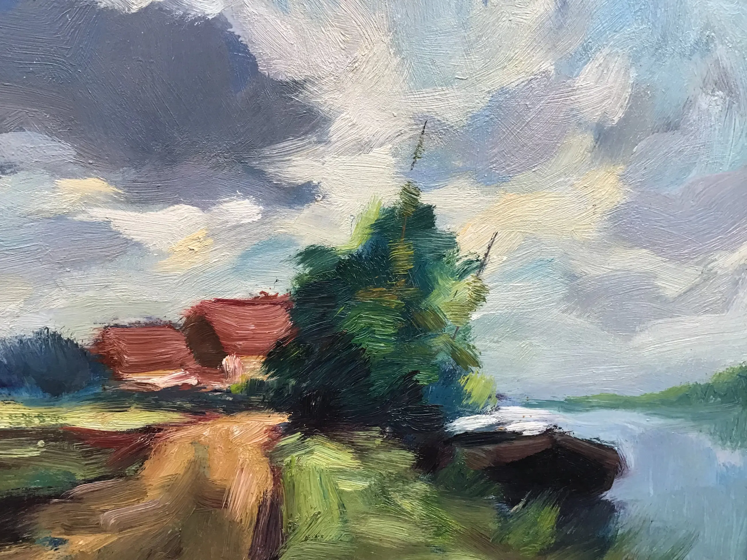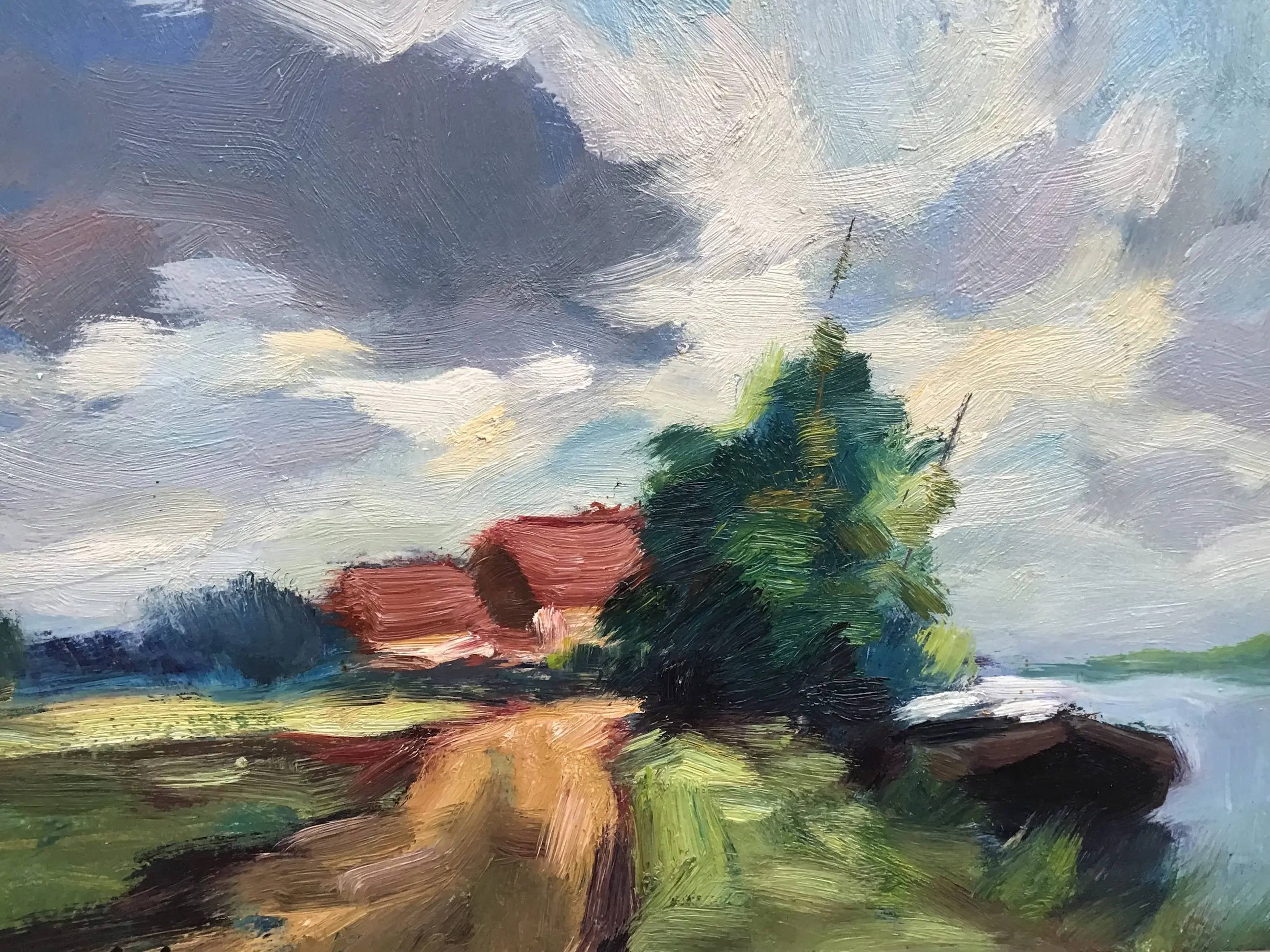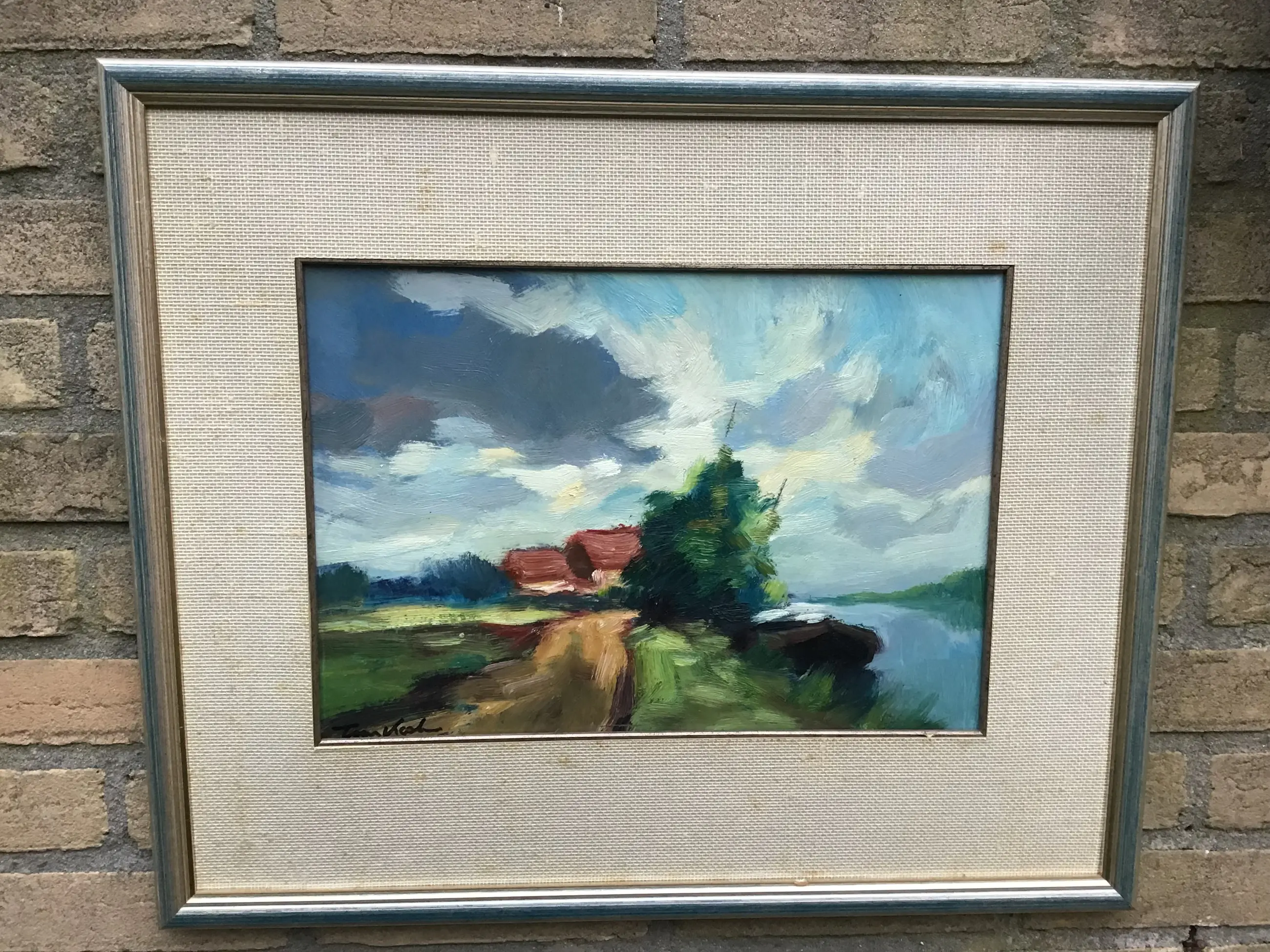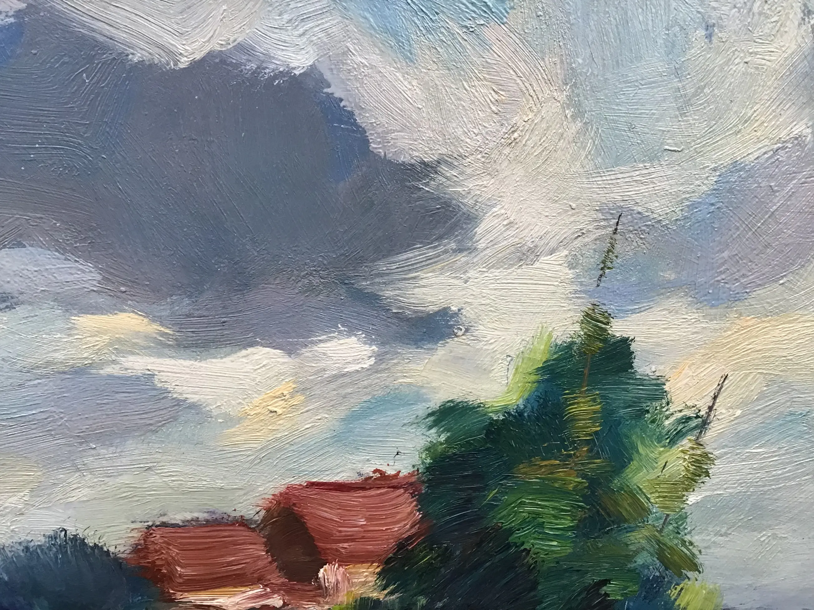 Redelijk groot werk van 30/40cm in een brede lijst, waarschijnlijk nog de oorspronkelijke. Typisch de stijl van Koster, krachtige brede penseelstreken. Een spectaculaire lucht. Niet echt te vangen in een bepaalde stroming. Hij heeft zich nooit geconformeerd aan een bepaalde richting.