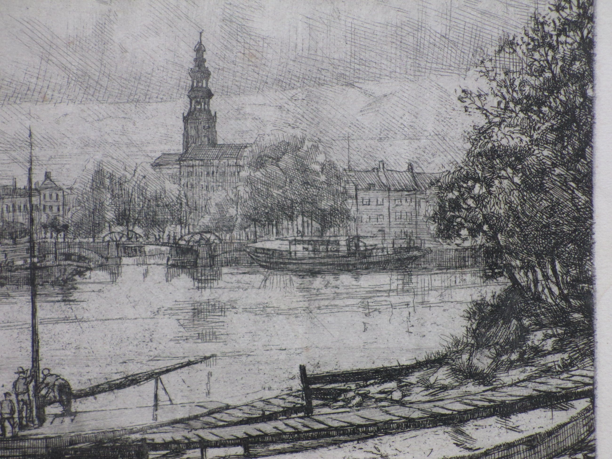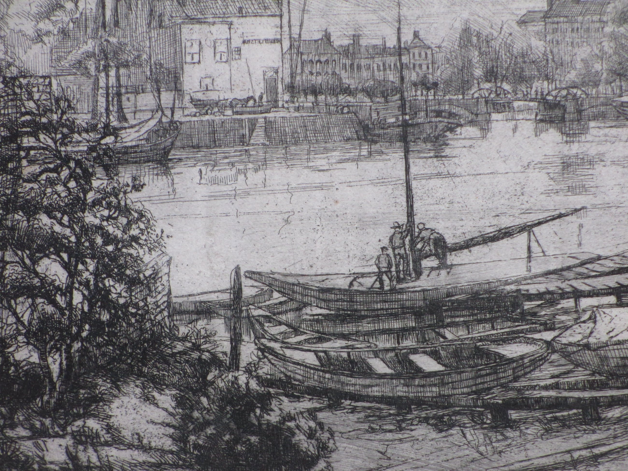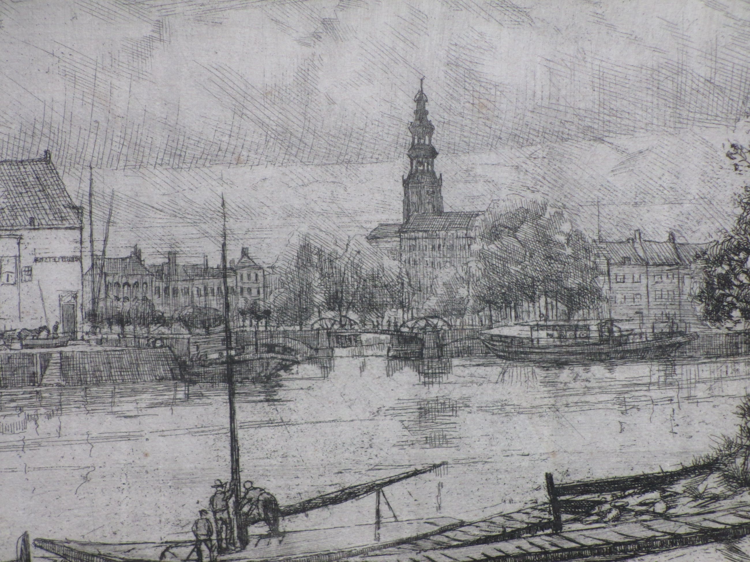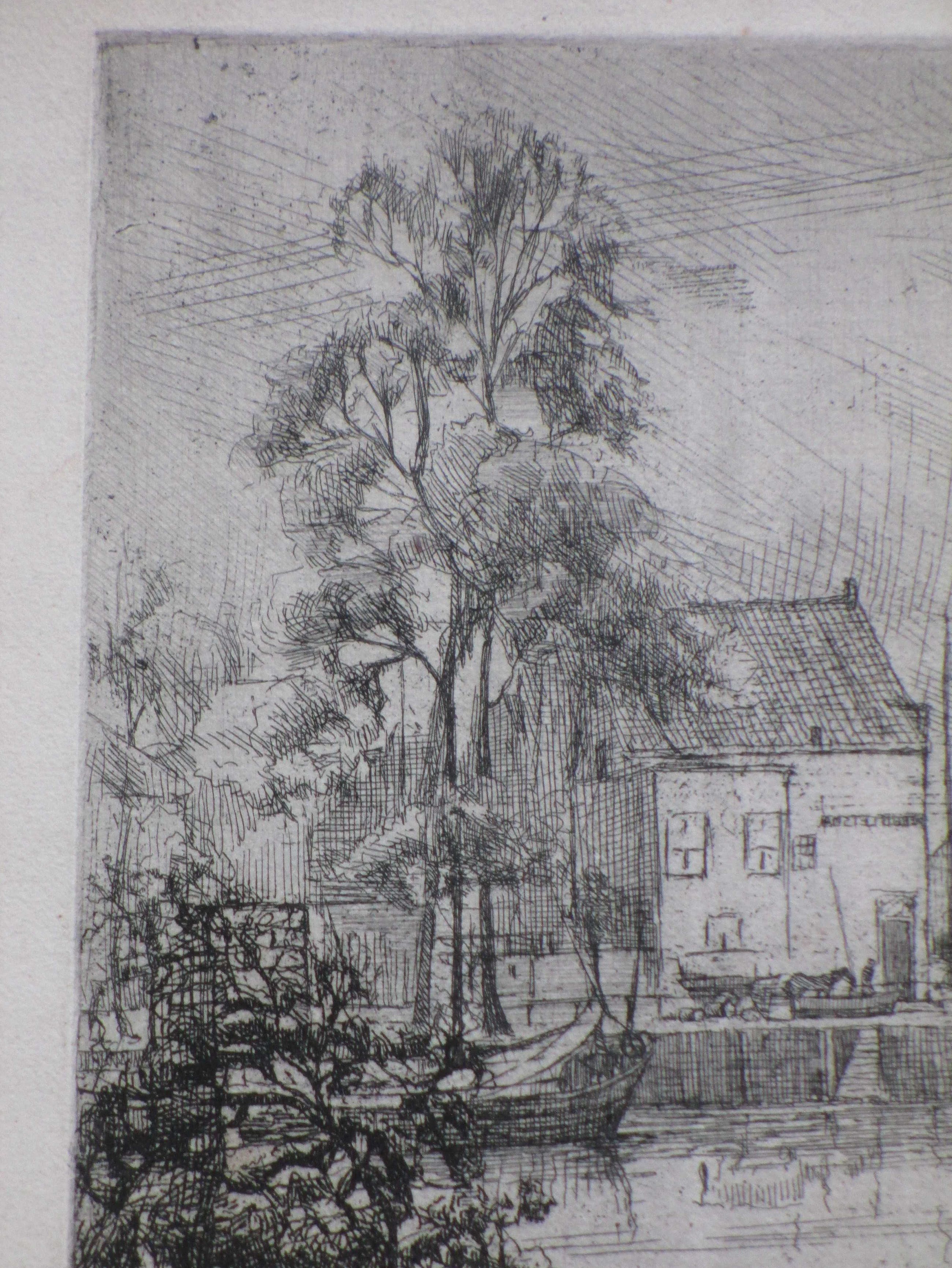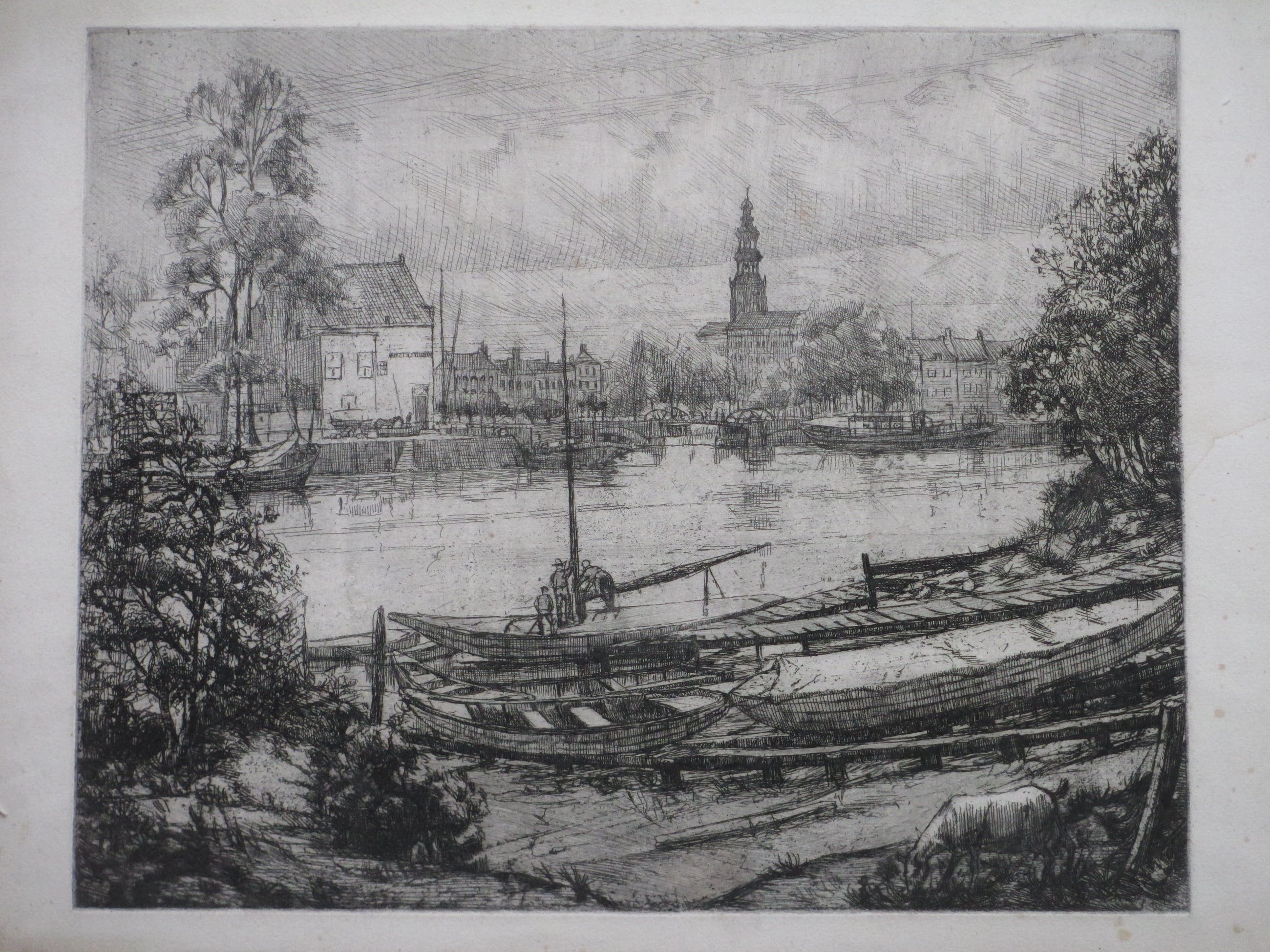 Weinig geziene ets door Toon Pluymers Voorstelling van de binnenhaven van Middelburg Losbladig, beeldmaat 29x36, bladmaat 32,5x50 Niet gesigneerd Authenticiteit volledig gegarandeerd
