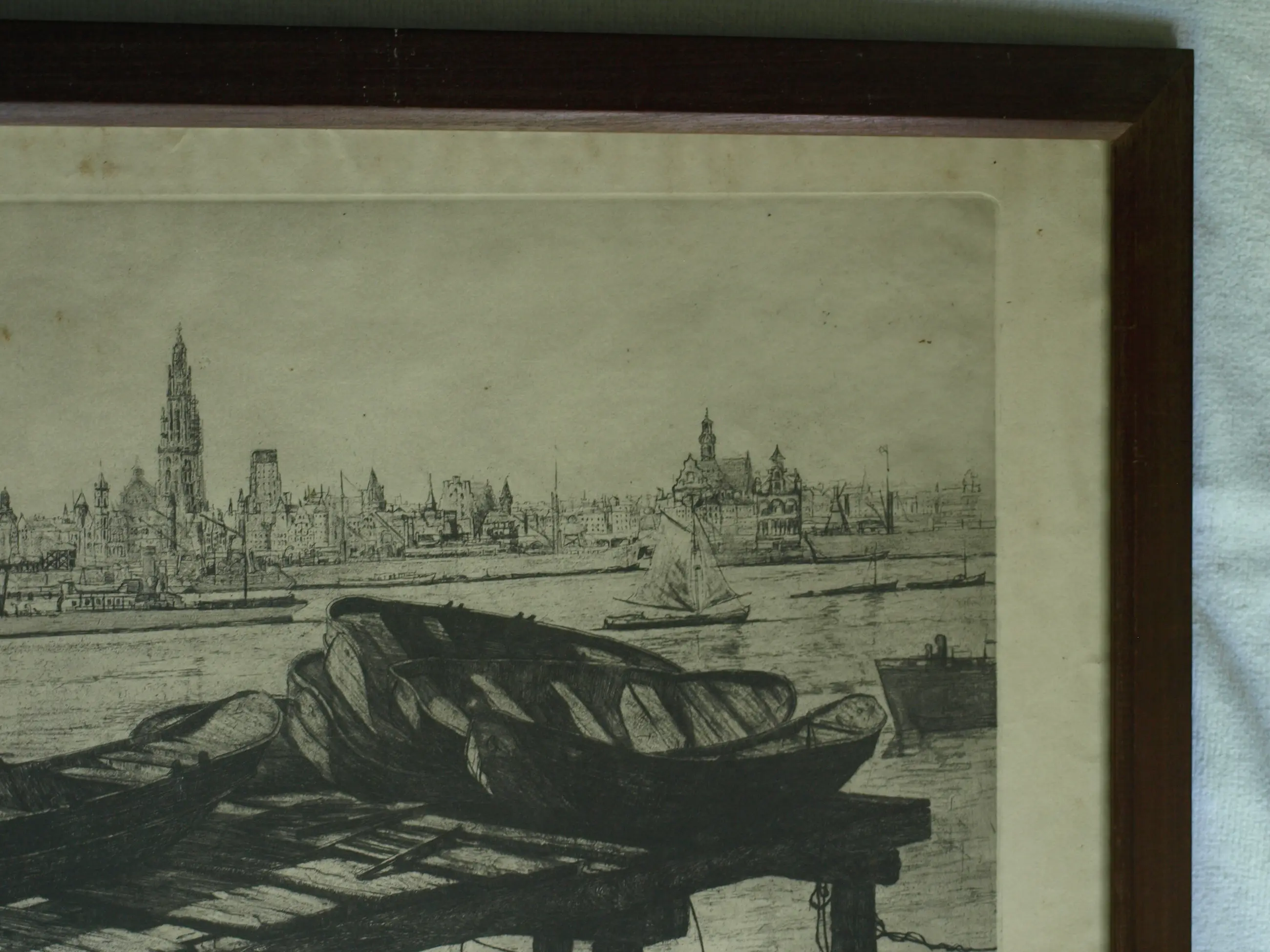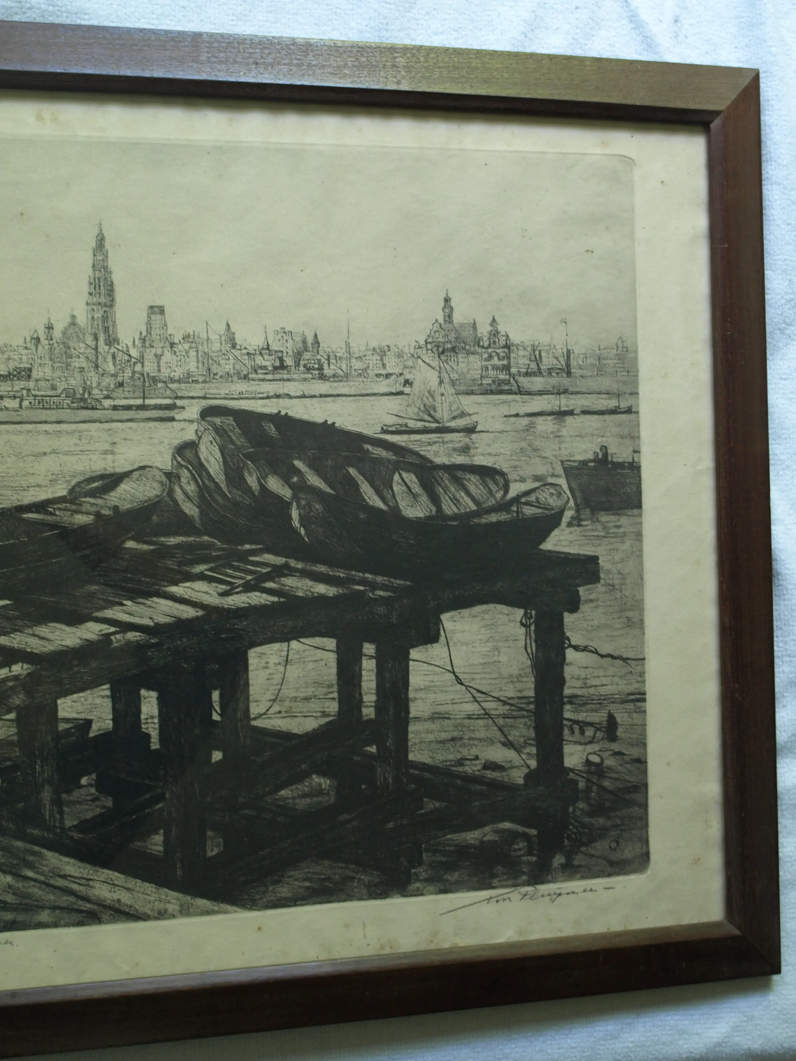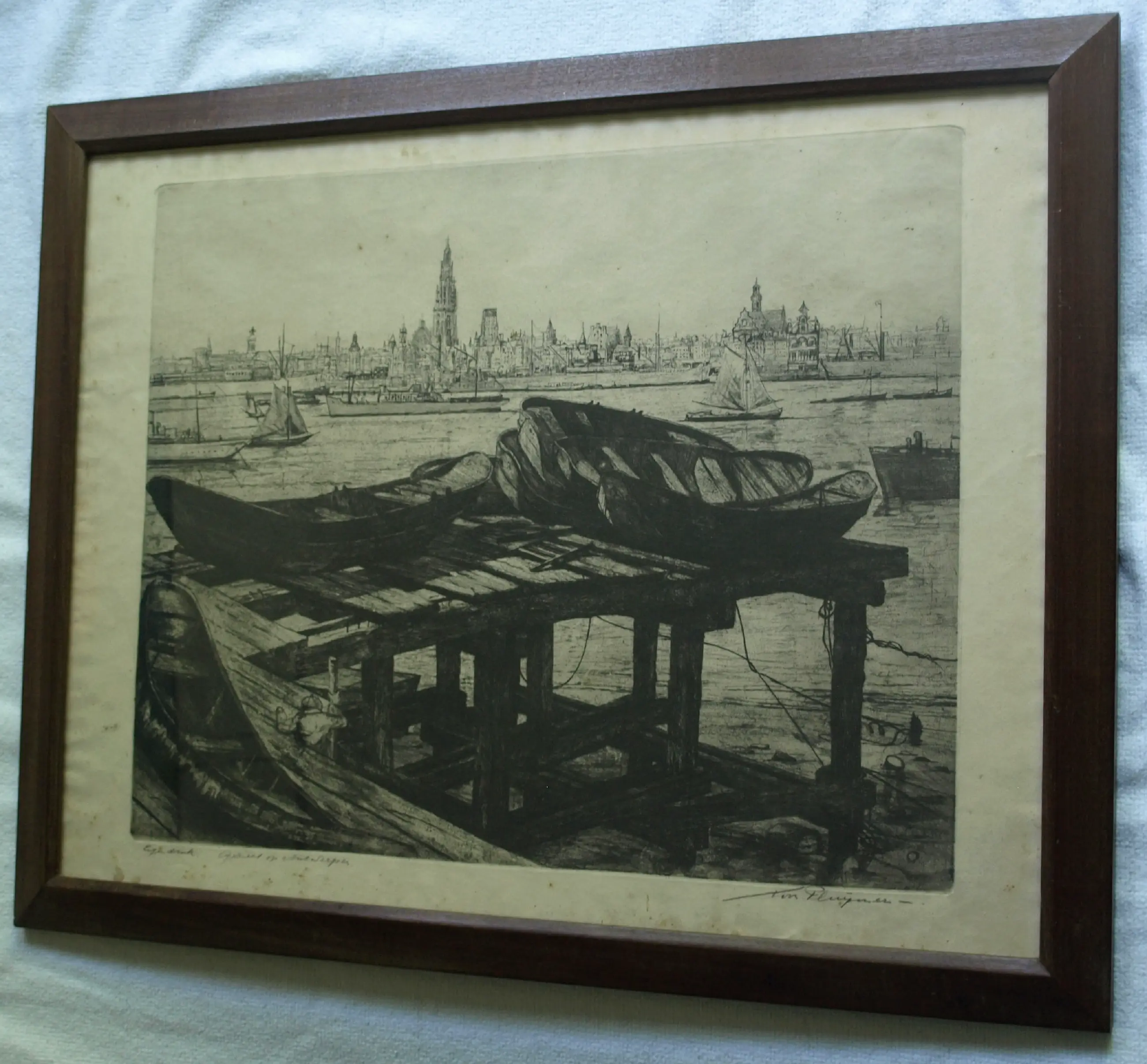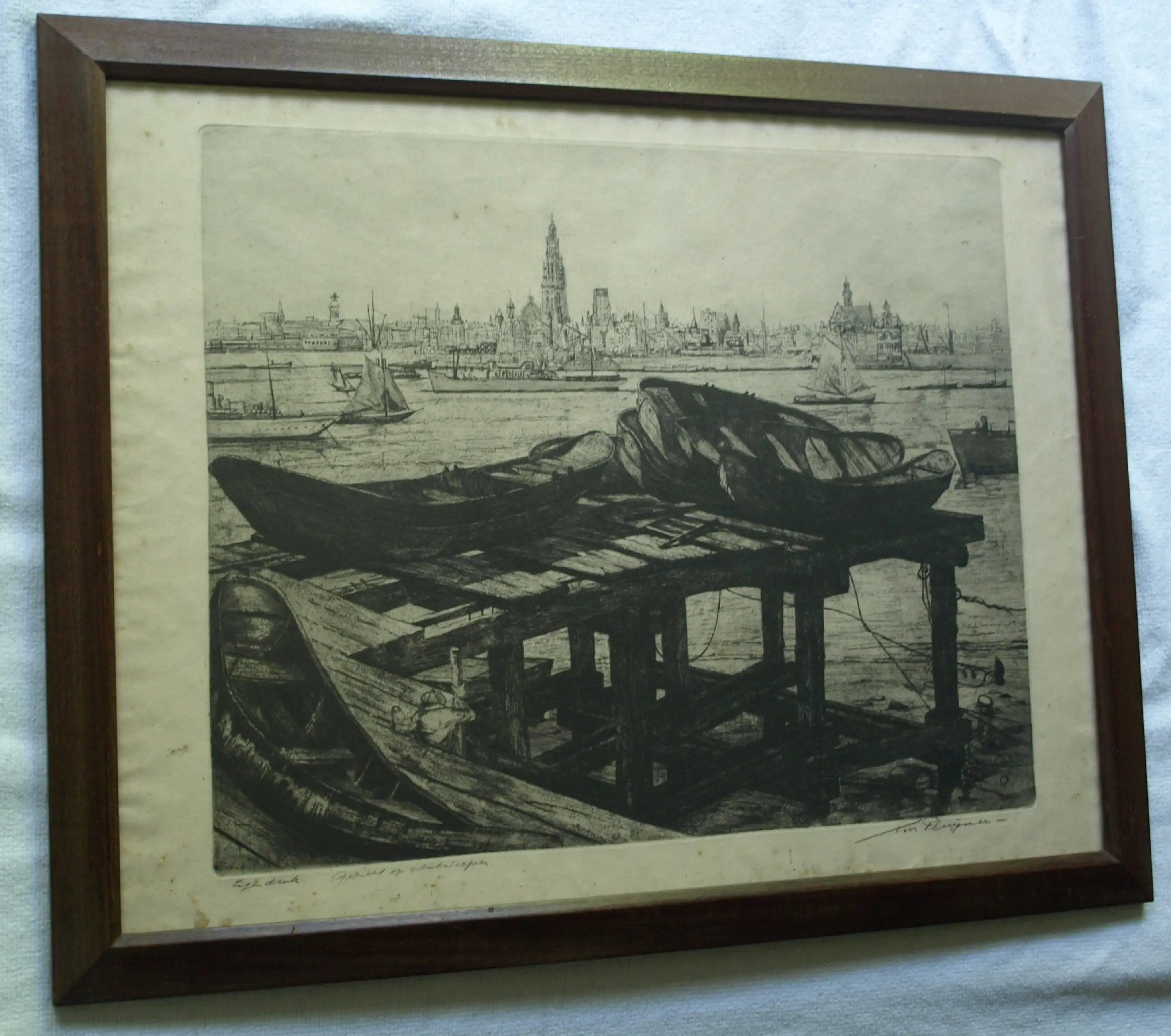 Een grote ingelijste ets van de van oorsprong Zeeuwse kunstenaar Toon Pluymers (1910-1967), getiteld “Gezicht op Antwerpen” met een voorstelling van een panorama op Antwerpen over de Schelde. -Gesigneerd en getiteld met potlood. Een eigen druk van de kunstenaar. -Ingelijst in de originele houten lijst met glasplaat. -Afmetingen: Lijst, 56 x 71 x 2½ cm. Beeld, 43 x 53½ cm. -Herkomst: Uit een inboedel. -Conditie: De ets is in goede staat met een paar ‘zuurvlekjes’ in de lucht en ‘foxing’ en vlekjes aan de randen van het papier (buiten beeld). De lijst heeft slijtplekken. Zie ook de foto’s voor een eigen indruk. Kan zo aan de muur.