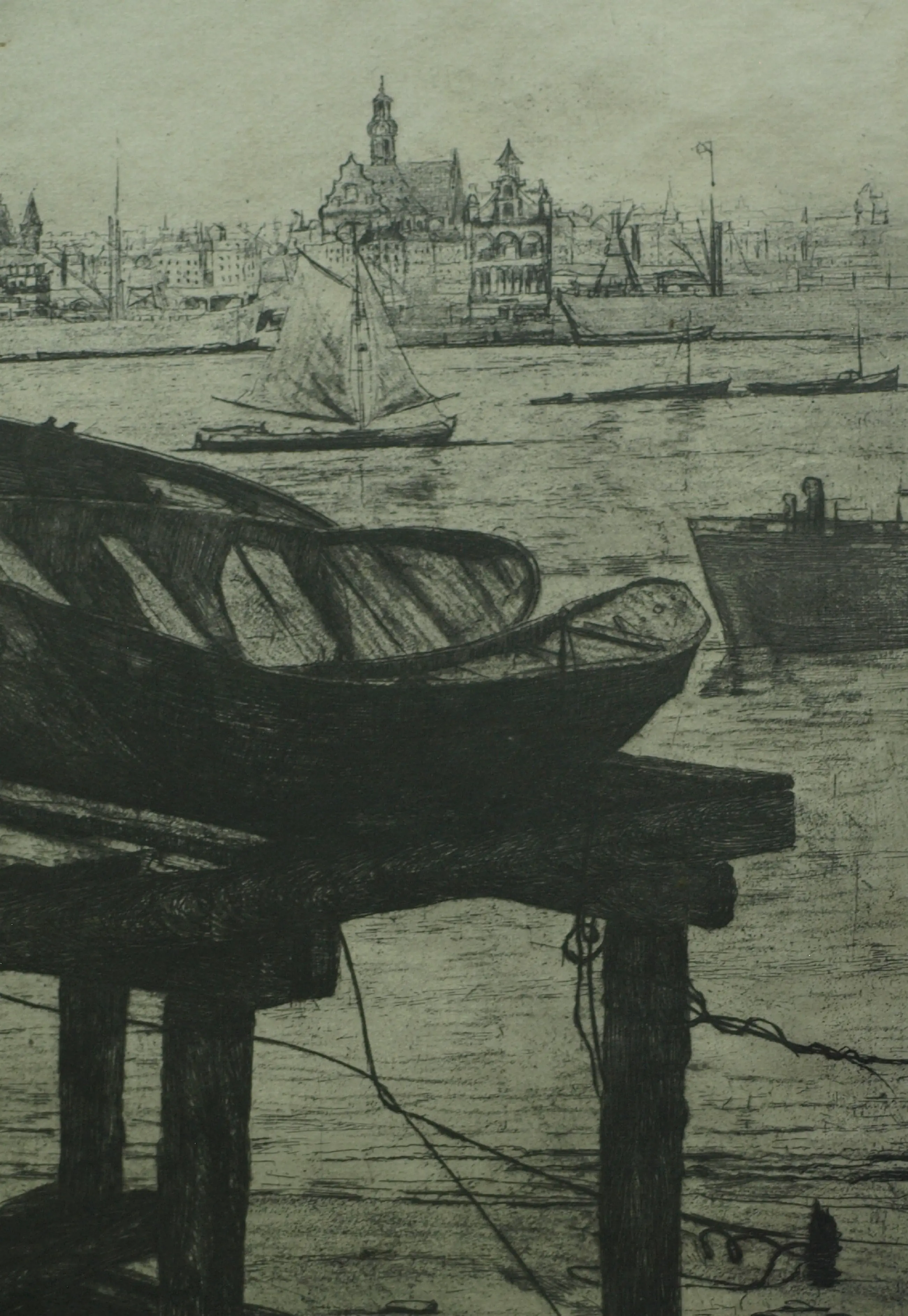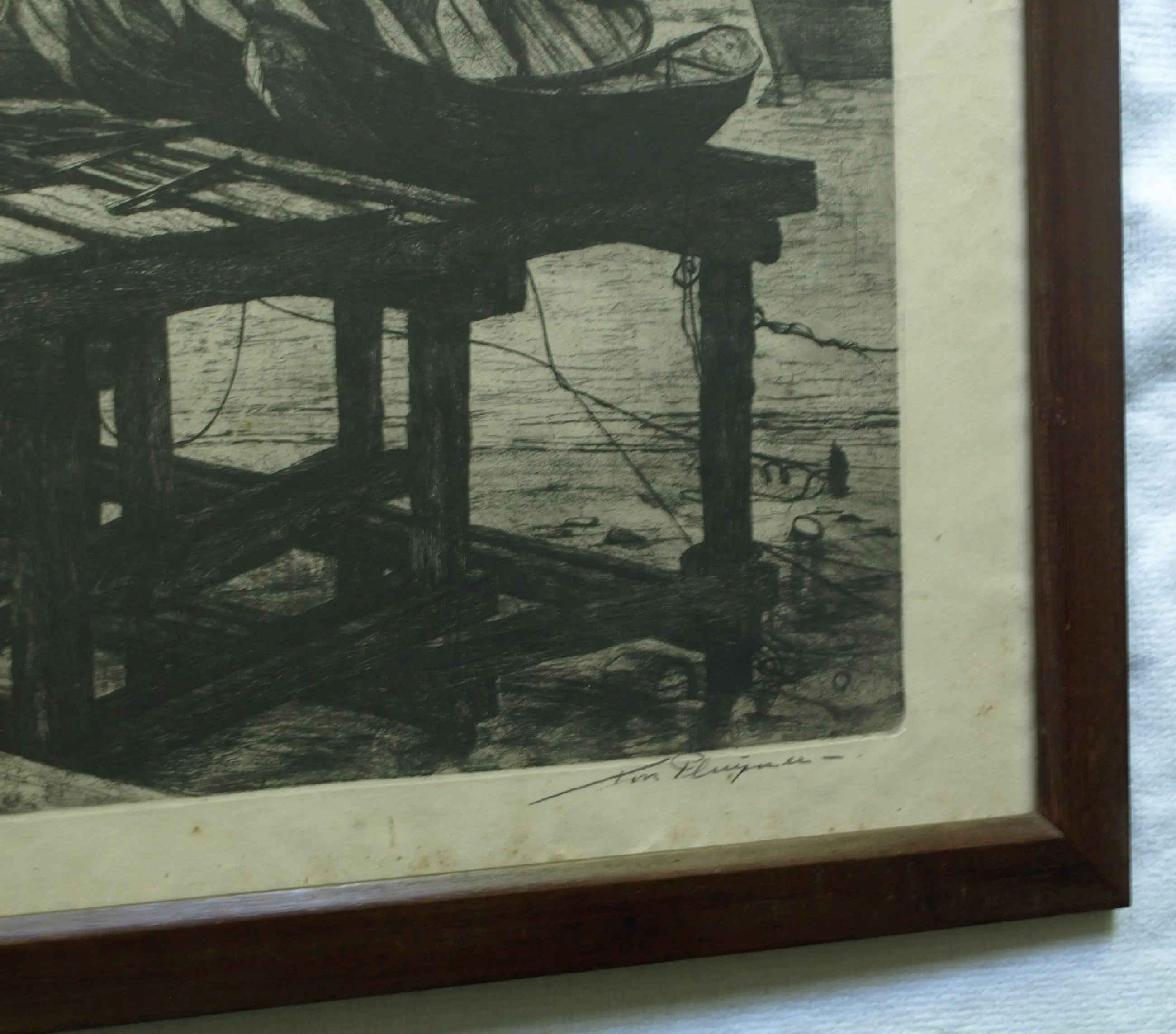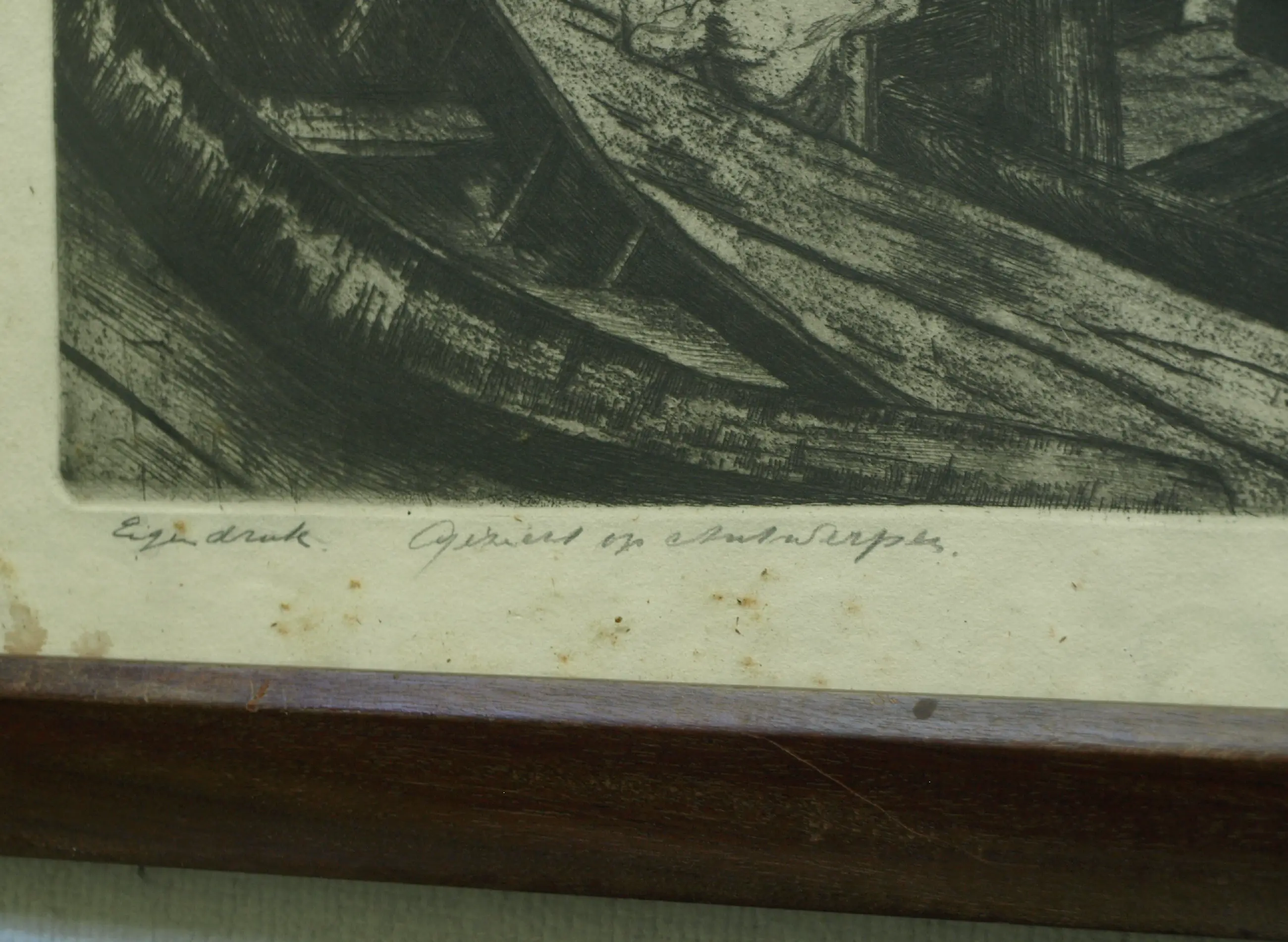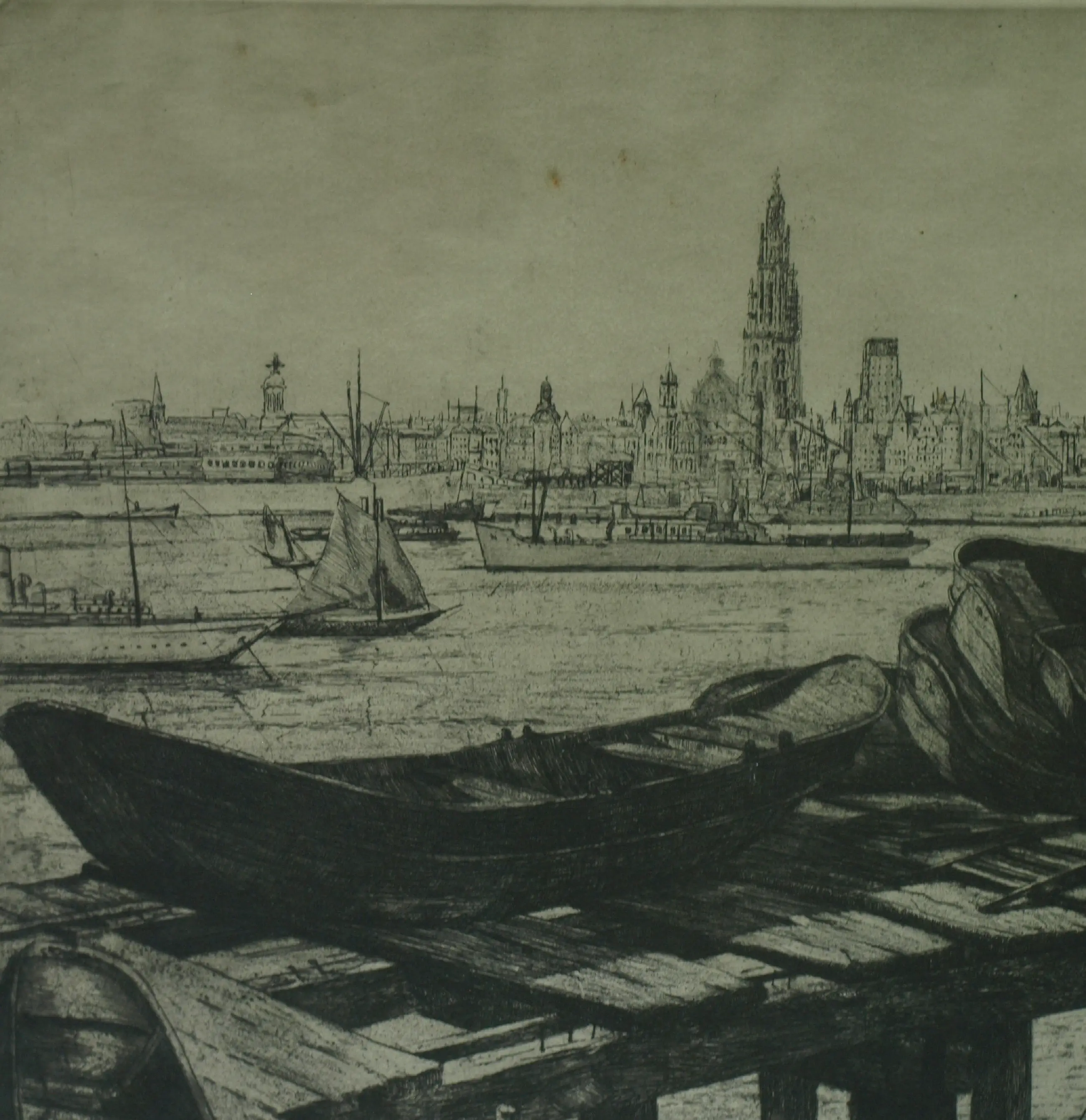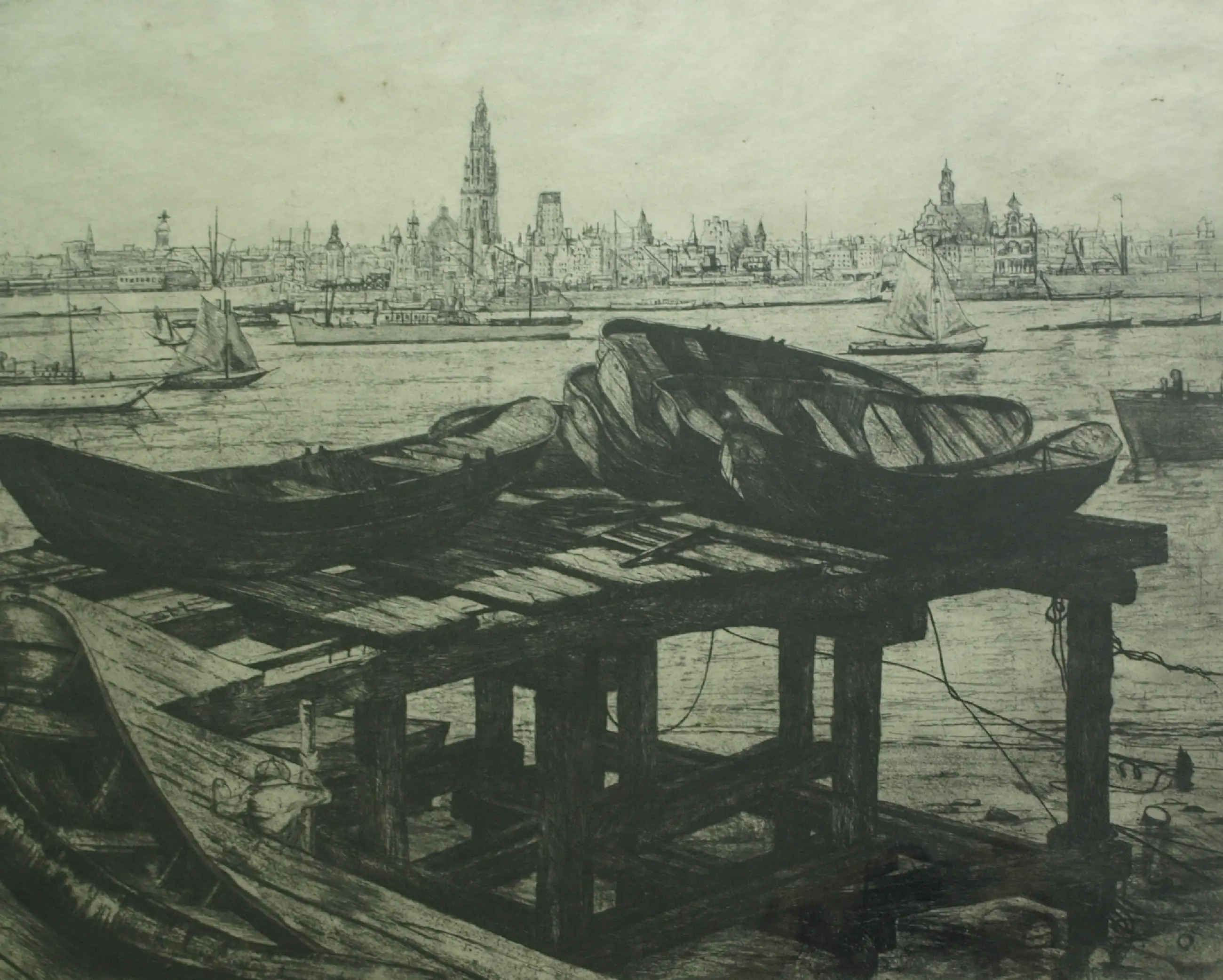 Een grote ingelijste ets van de van oorsprong Zeeuwse kunstenaar Toon Pluymers (1910-1967), getiteld “Gezicht op Antwerpen” met een voorstelling van een panorama op Antwerpen over de Schelde. -Gesigneerd en getiteld met potlood. Een eigen druk van de kunstenaar. -Ingelijst in de originele houten lijst met glasplaat. -Afmetingen: Lijst, 56 x 71 x 2½ cm. Beeld, 43 x 53½ cm. -Herkomst: Uit een inboedel. -Conditie: De ets is in goede staat met een paar ‘zuurvlekjes’ in de lucht en ‘foxing’ en vlekjes aan de randen van het papier (buiten beeld). De lijst heeft slijtplekken. Zie ook de foto’s voor een eigen indruk. Kan zo aan de muur.