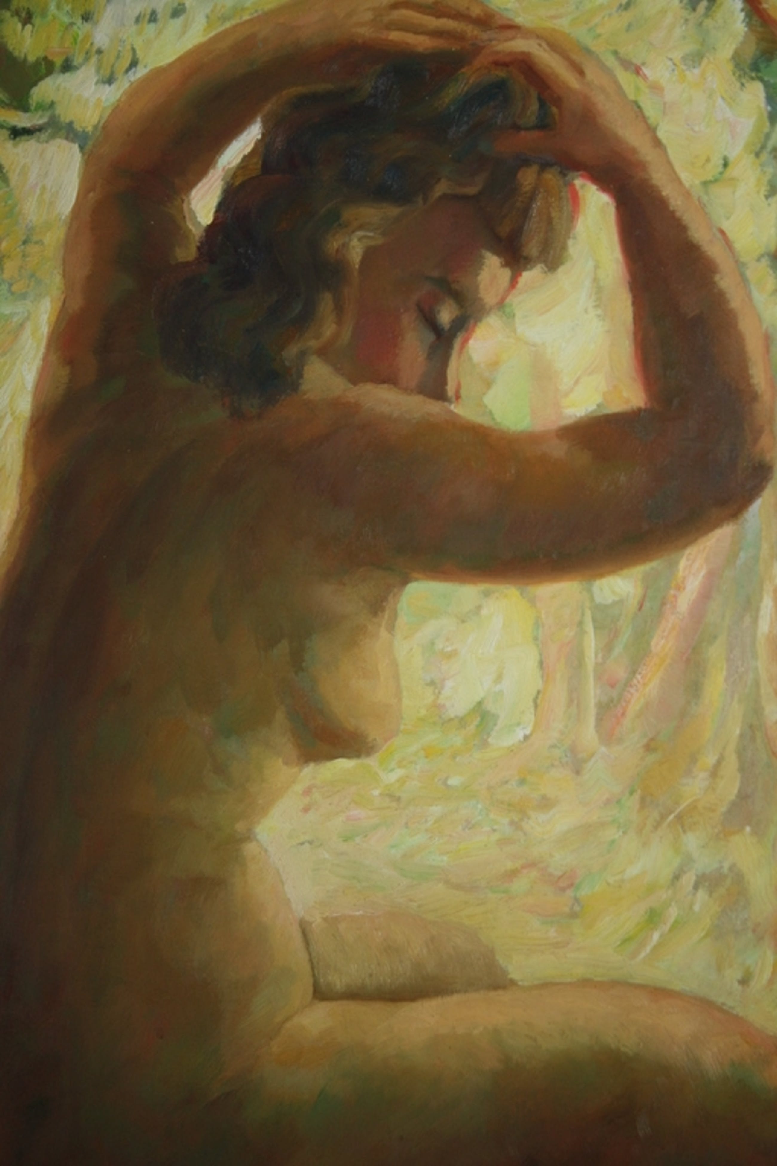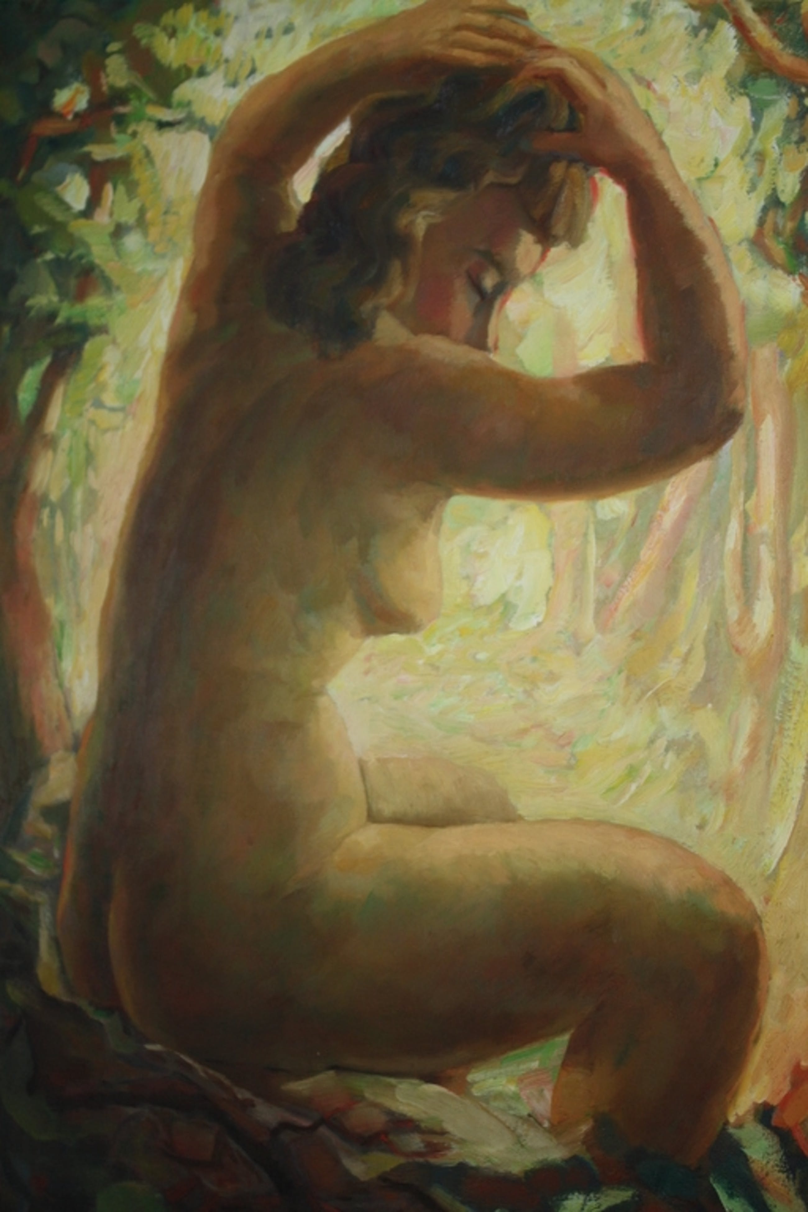 ZITTEND NAAKT OP DE RUG GEZIEN
