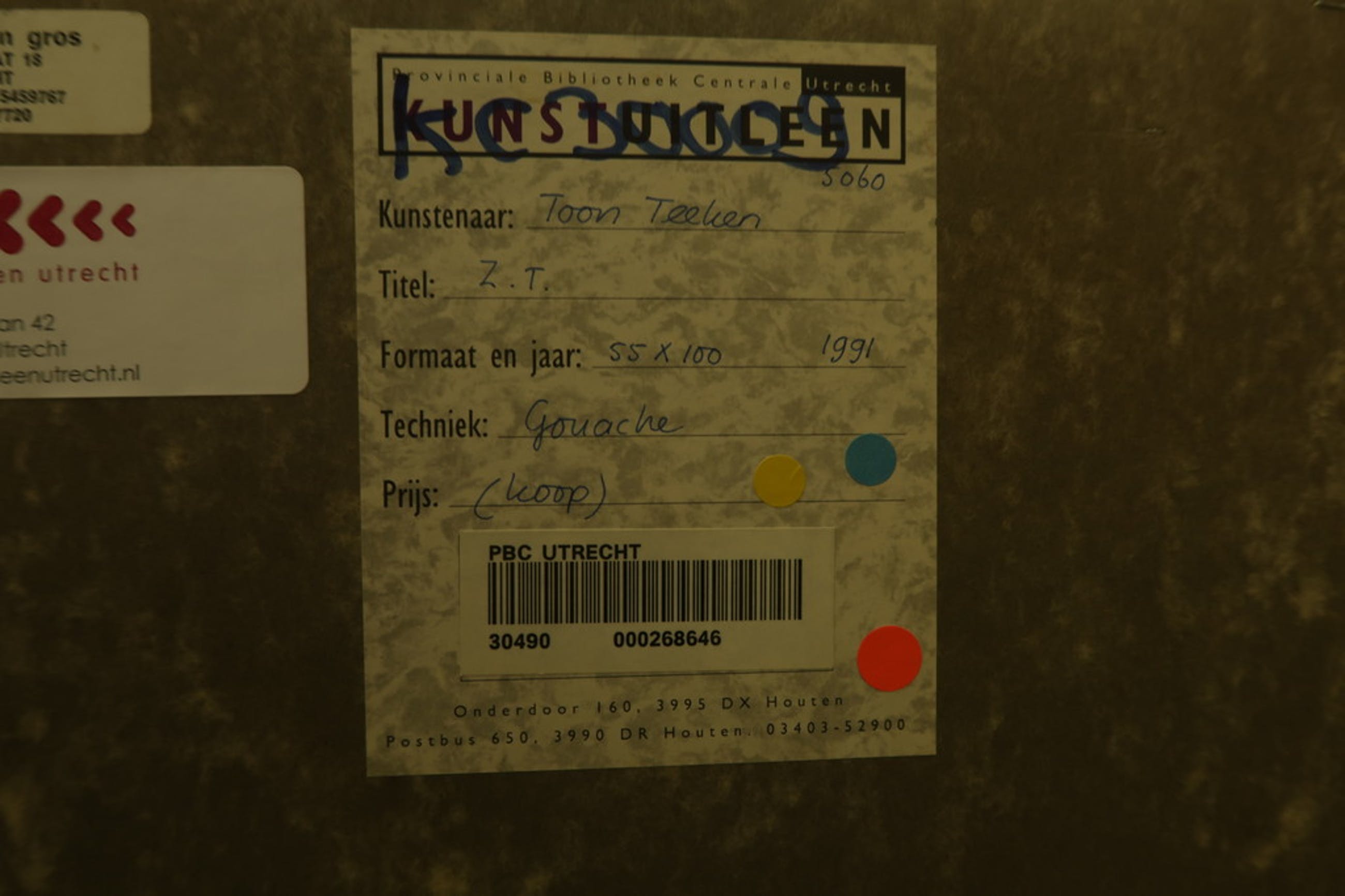 Op de sticker achterop het werk staat dat het om een gouache van Toon Teeken gaat. Naar onze mening gaat het om een zeefdruk.