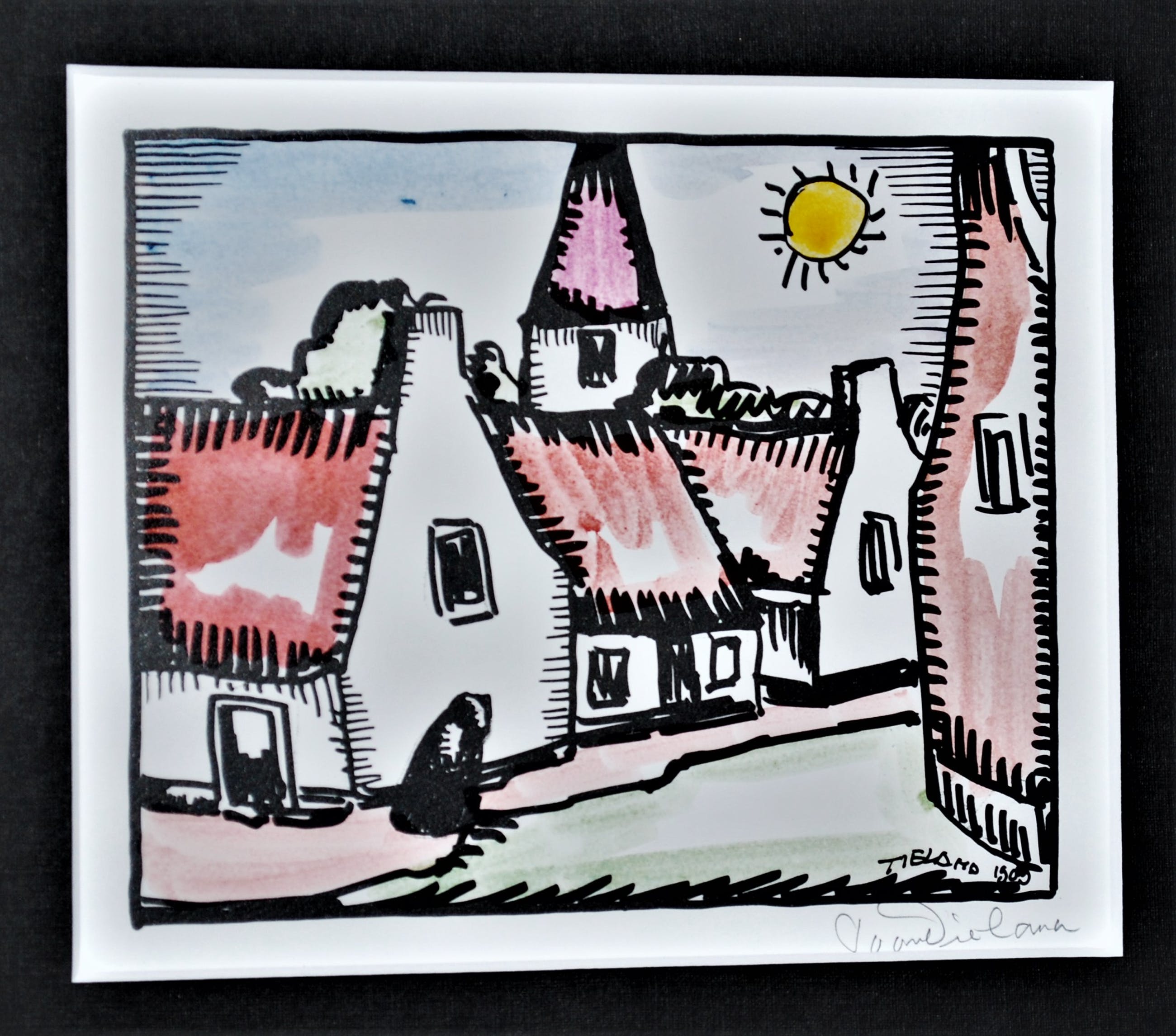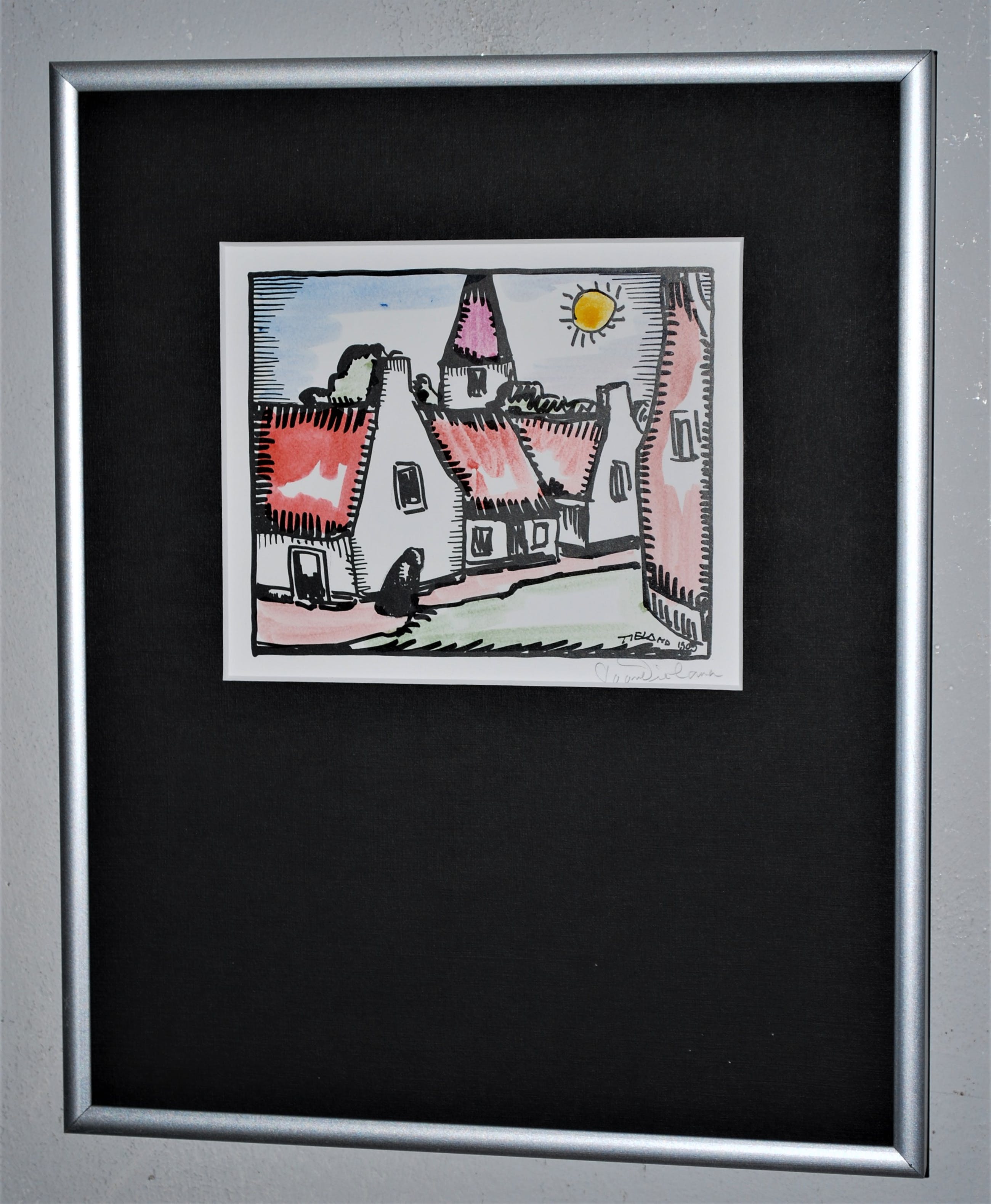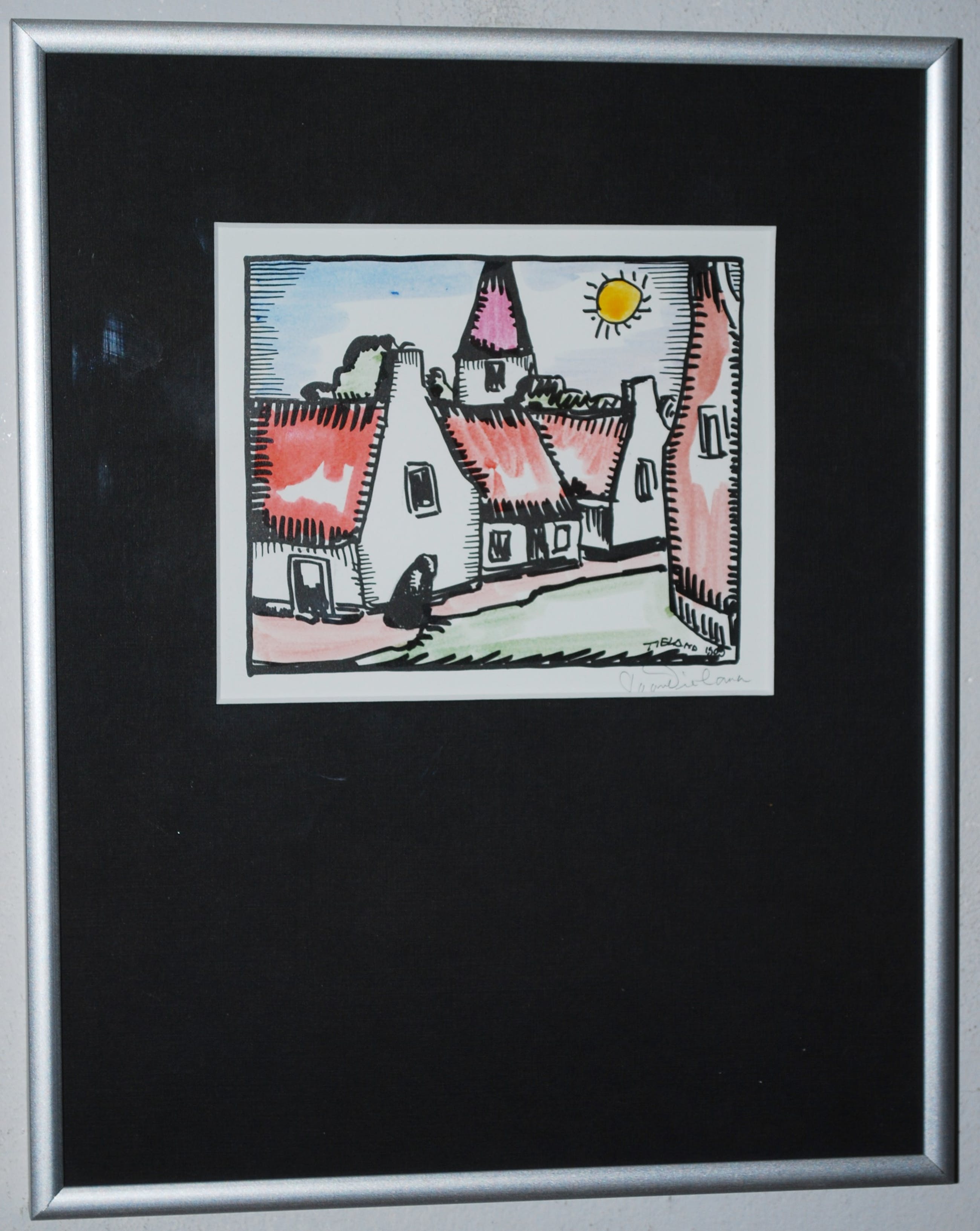 Het blad is bevestigd tussen karton en passepartout. Met potlood gesigneerd r.o. onder het beeld. In het beeld ook gesigneerd en gedateerd (jaren '90). Achter glas, in een aluminium lijst.