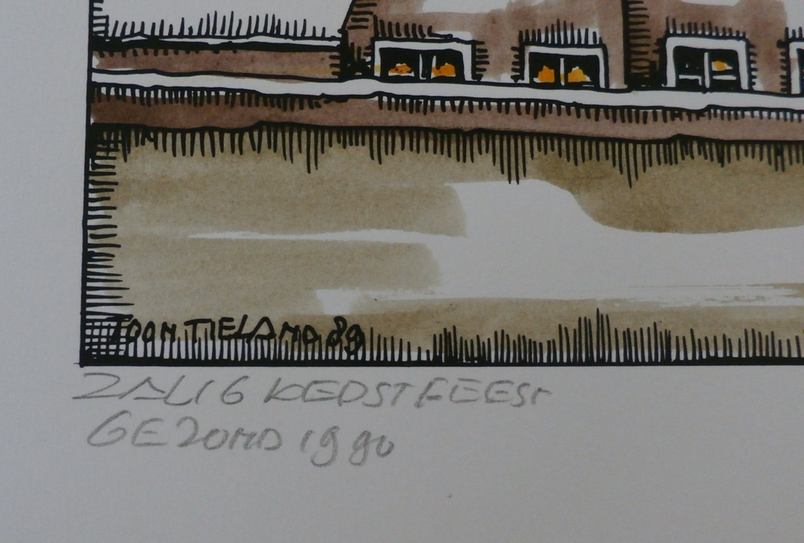Handingekleurde Litho van Toon Tieland uit 1989. Zalig kerstfeest gezond 1990. Het werk is met potlood, aan de onderzijde, gesigneerd. Afmetingen: H19.5 x b21 cm. Afmetingen ingekleurde voorstelling: H20 x b15.5 cm. Conditie: in goede staat. De authenciteit van deze werken wordt volledig gegarandeerd. Een certificaat van echtheid kan, op aanvraag, worden meegeleverd.