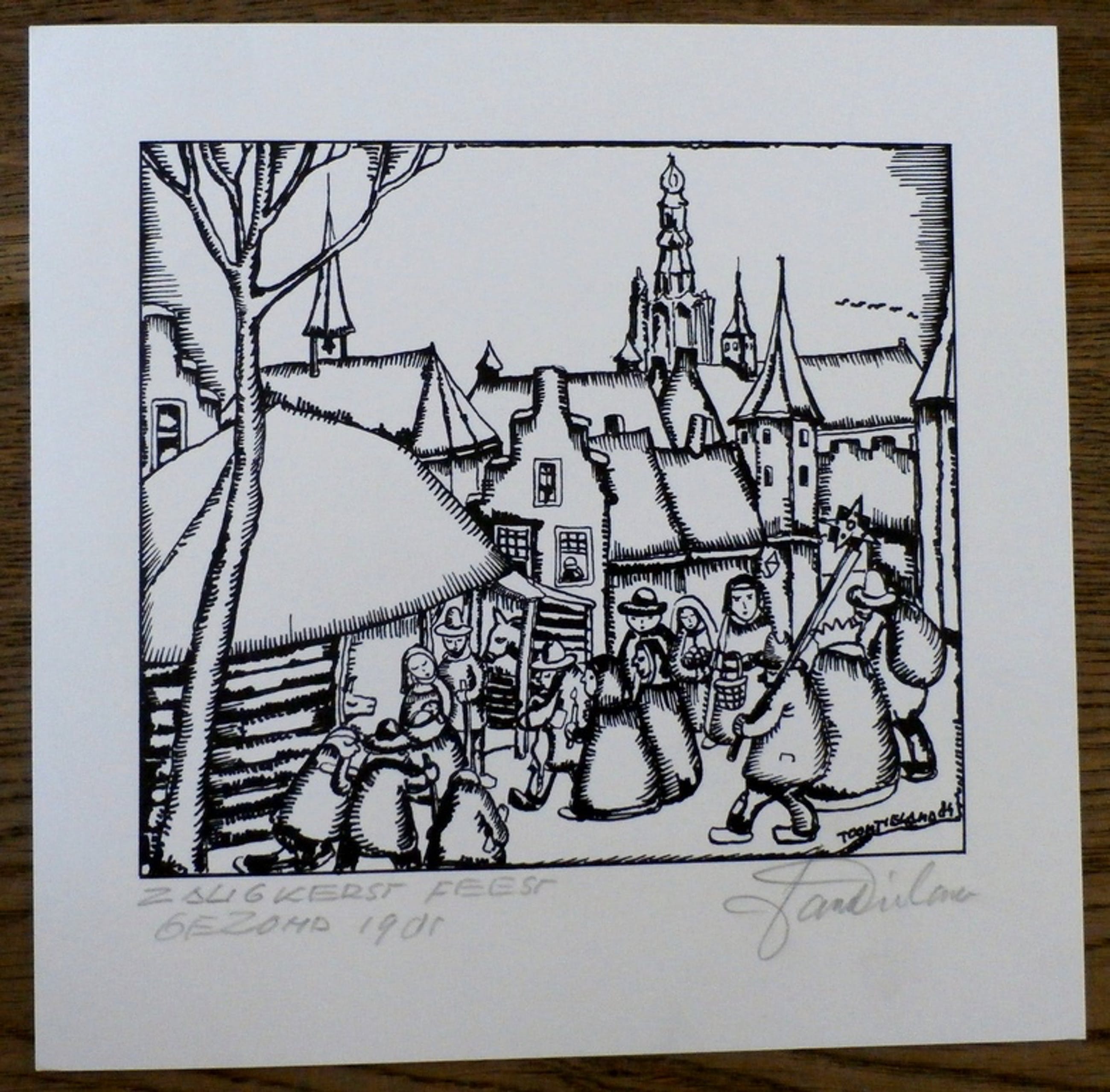Litho van Toon Tieland. Titel: Zalig kerstfeest, gezond 1985. Jaar: 1984. Het werk is rechtsonder gesigneerd met potlood en in de druk. Afmetingen blad: H18 x b18 cm. Afmetingen voorstelling: H11,5 x b14 cm. Conditie: in goede staat. De authenciteit van dit werk wordt volledig gegarandeerd. Een certificaat van echtheid kan, op aanvraag, worden meegeleverd.