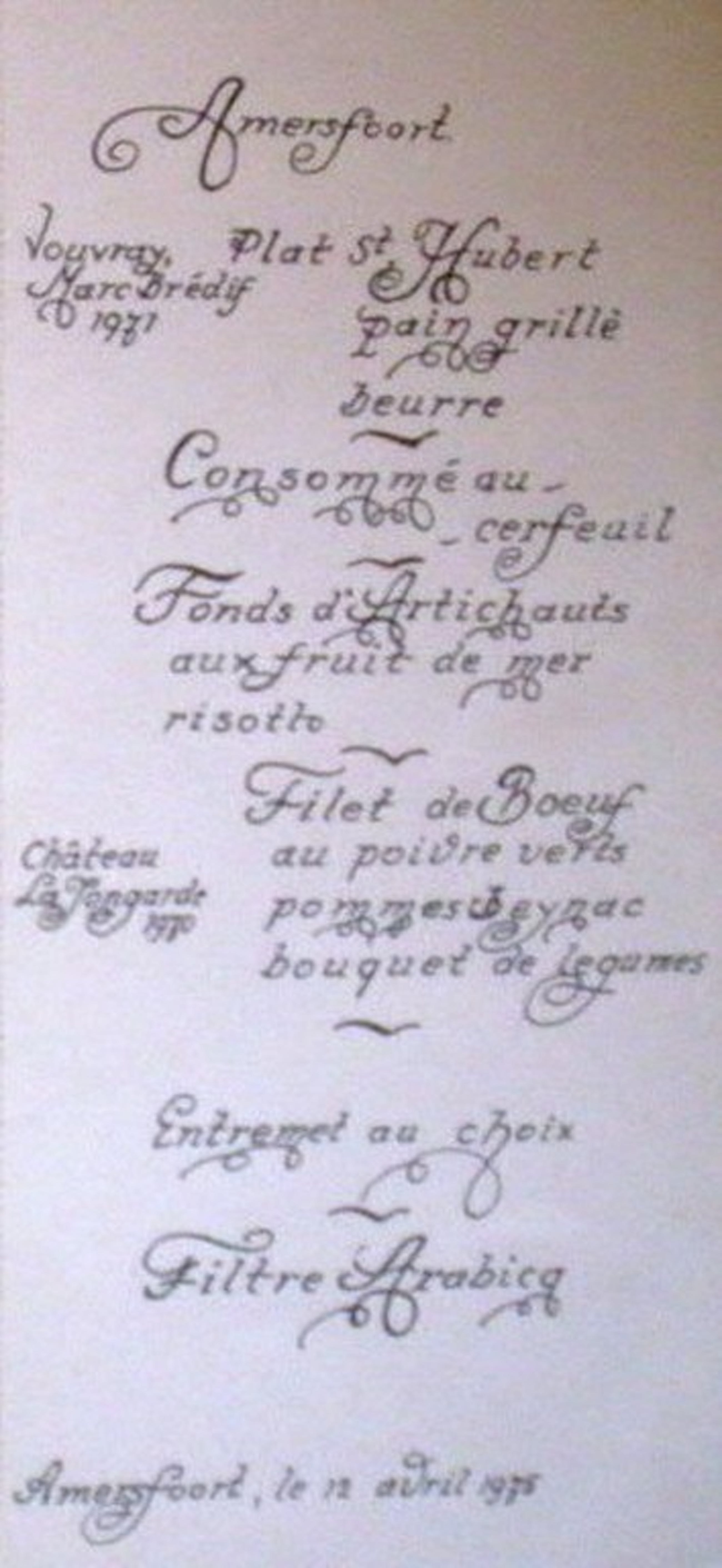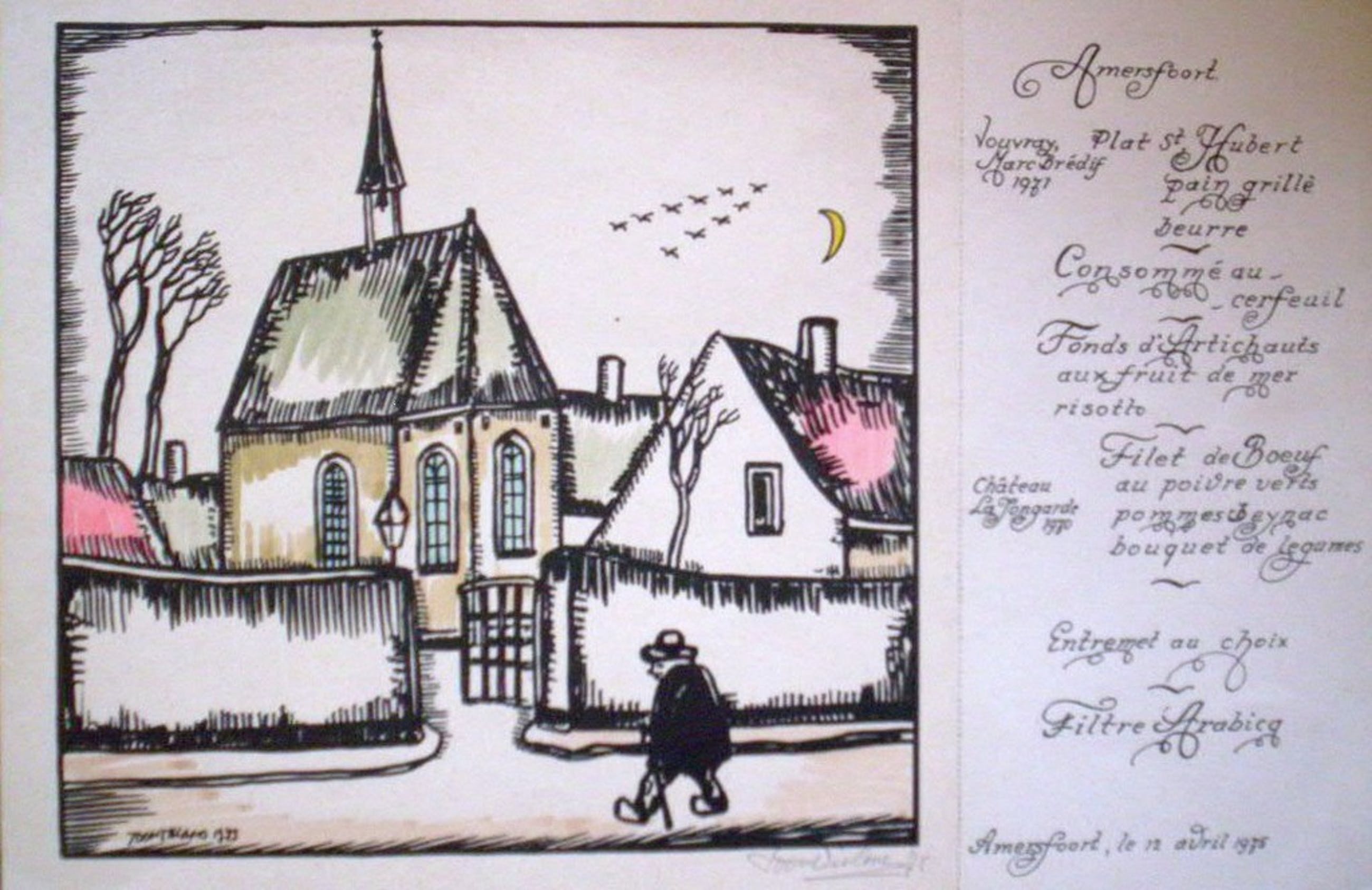 Unieke prachtig getekende en met potlood gesigneerde menukaart.Toon Tieland (1919-2006) heeft altijd gezegd dat hij door niets en niemand is beïnvloed, maar gewoon schildert wat hij ziet.Bepaalde stijlkenmerken van Tielands werk sluiten eveneens aan bij het werk van andere schilders. Zo brengt ook Gauguin contourlijnen aan rond zijn kleurvlakken. Hij brengt op die manier een scherpe afbakening tot stand. En het is juist dit aanbrengen van contouren wat de schilderkunst van Toon Tieland zijn specifieke karakter geeft. Ook het primitivisme dat Gauguin in de moderne kunst introduceerde kenmerkt Tielands schilderijen: een vereenvoudigde ruimtewerking, het opbouwen van de voorstelling in monochrome kleurvakken en het aanbrengen van contouren. Gauguins primitivisme combineert Tieland met het expressionisme van de Vlamingen. Naïef expressionisme is daarom wellicht een goede aanduiding voor de sfeervolle, karakteristieke schilderkunst van Toon Tieland.