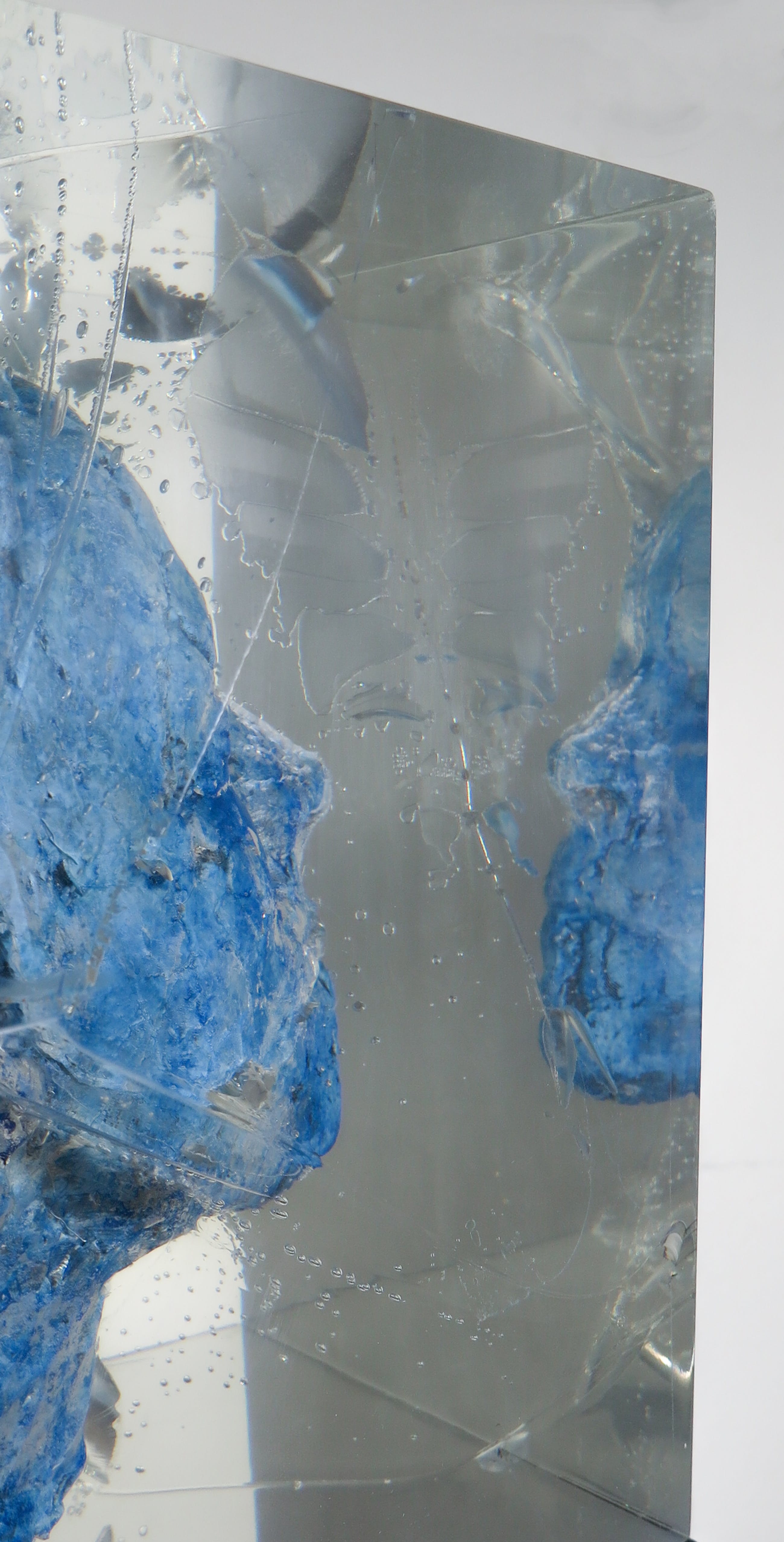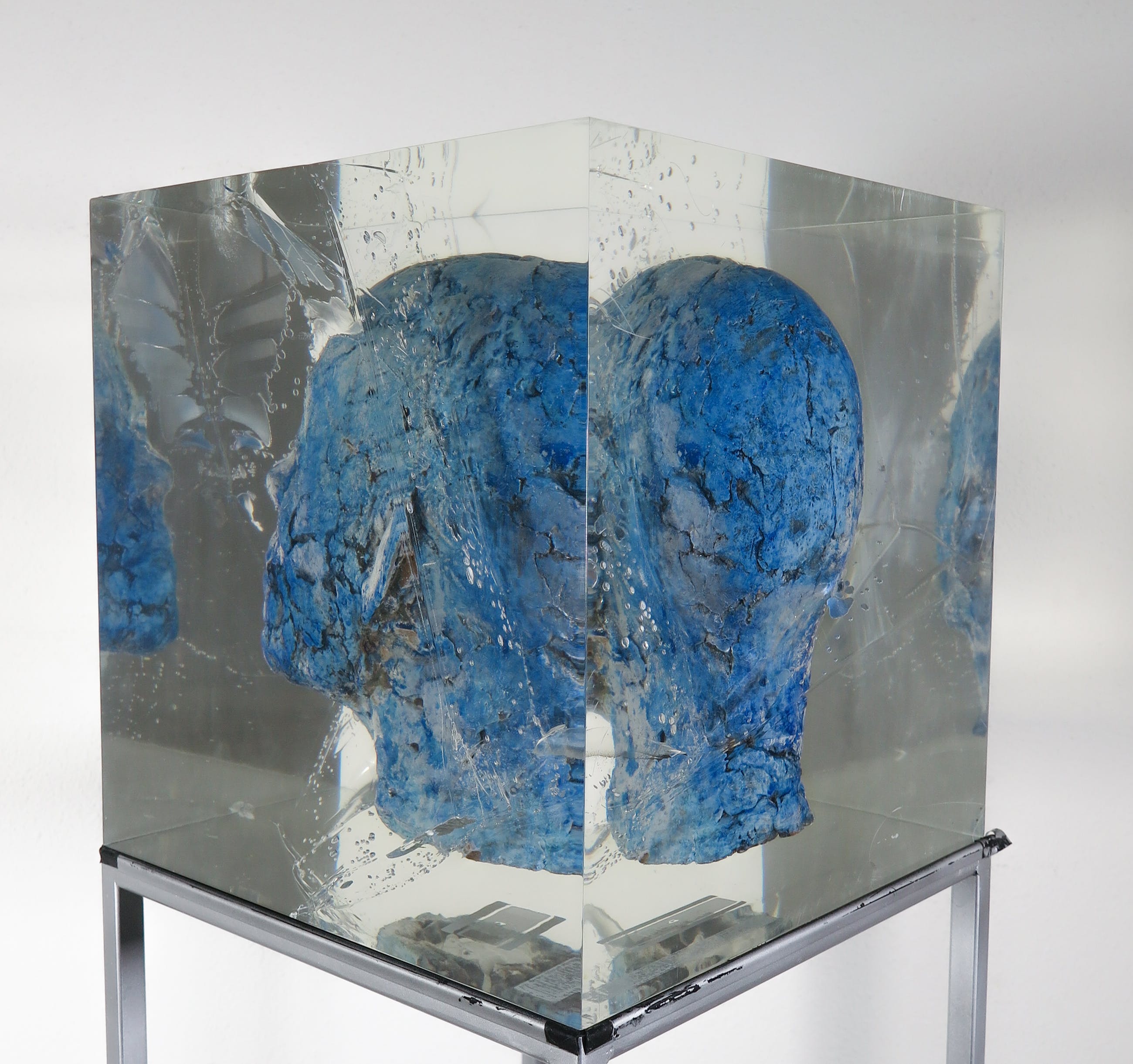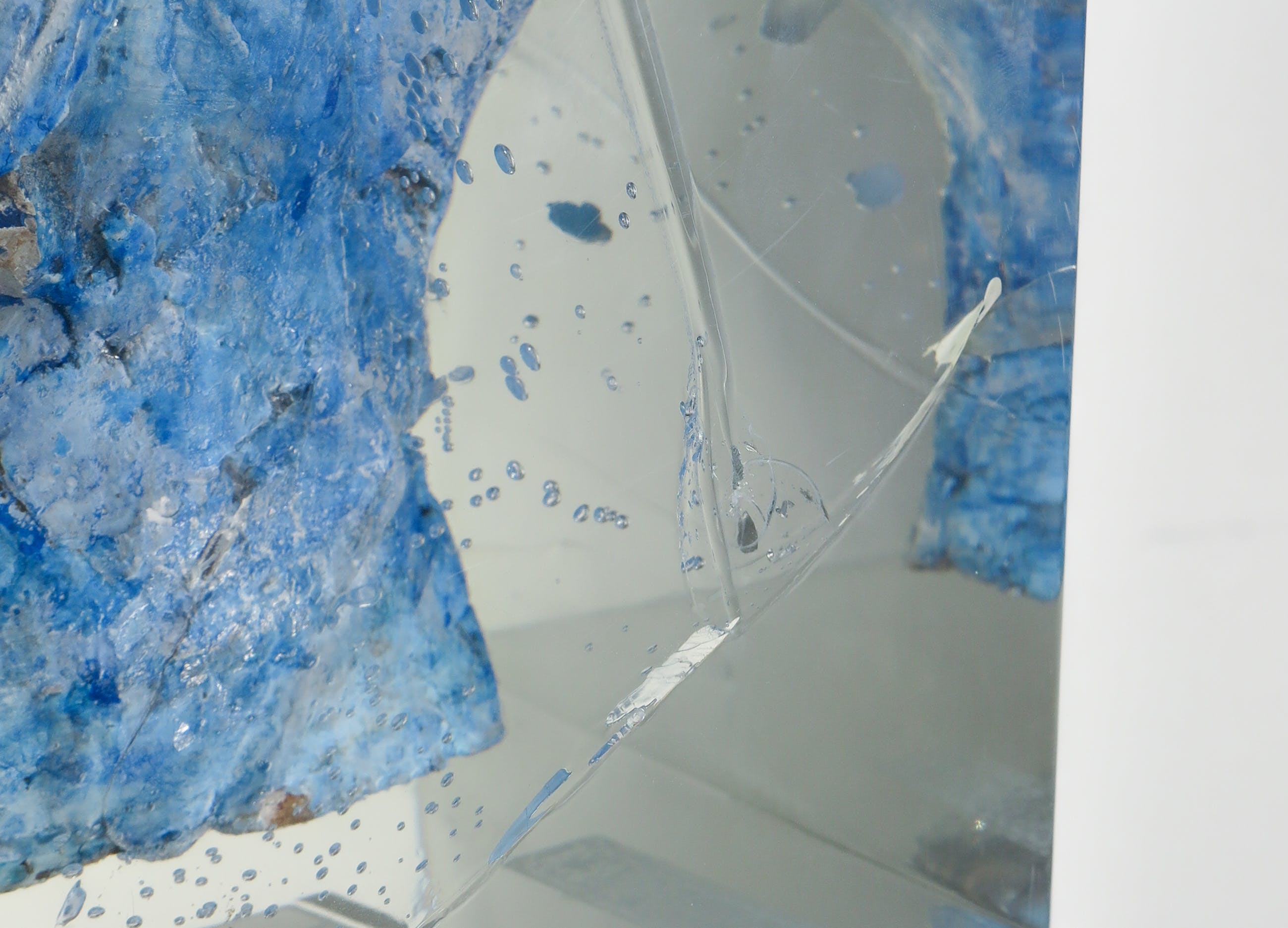 | Het hars lijkt een beetje vergeeld/verkleurd te zijn. Door het hars lopen meerdere naden/'barsten'. Dit zijn ons inziens geen beschadigingen, maar is dit ontstaan tijdens het gieten van de hars. De bovenzijde van het blok is beplakt met zilverkleurige spiegelende folie. Deze heeft enkele vlekjes/beschadigingen en laat een beetje los. | |