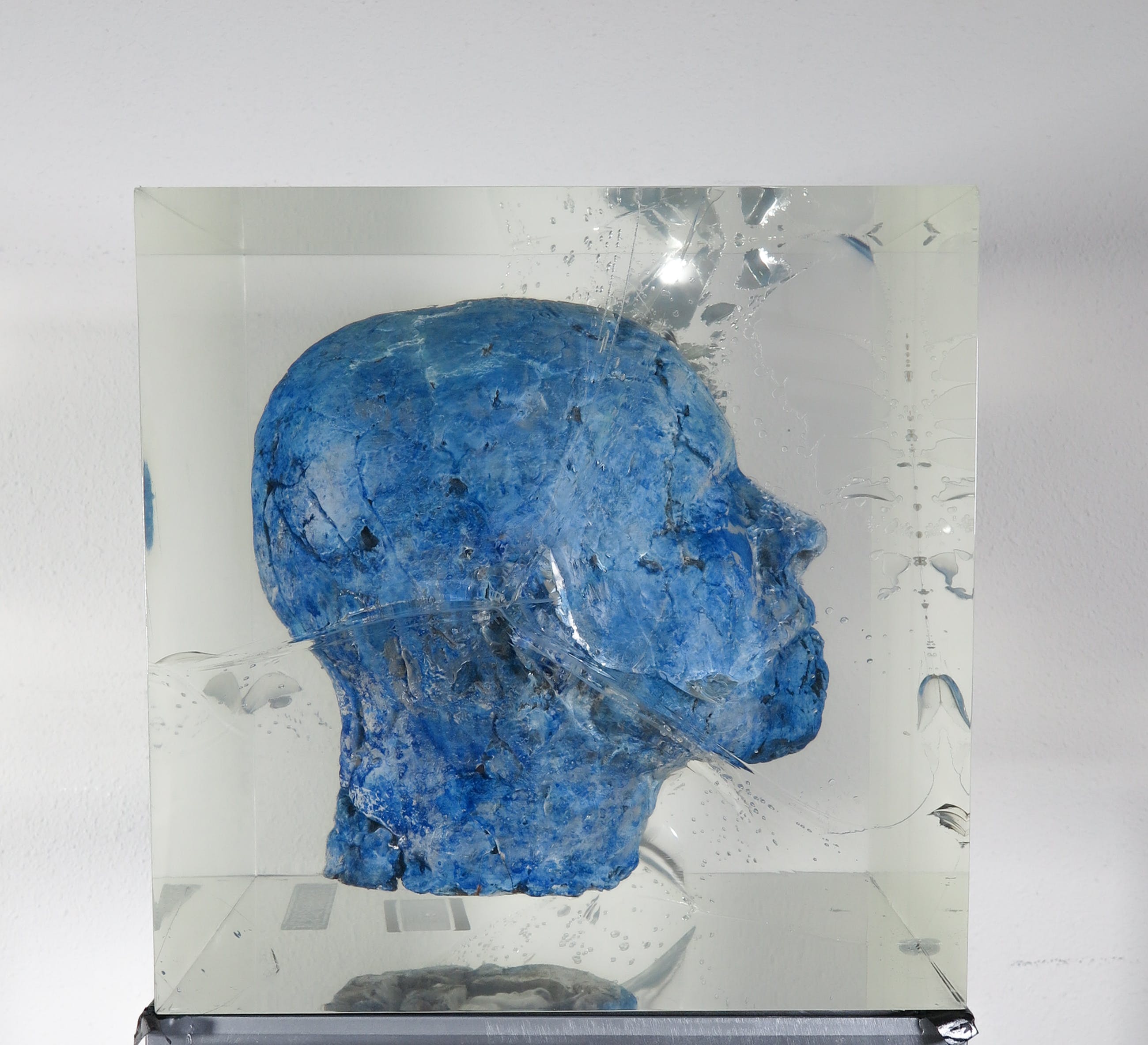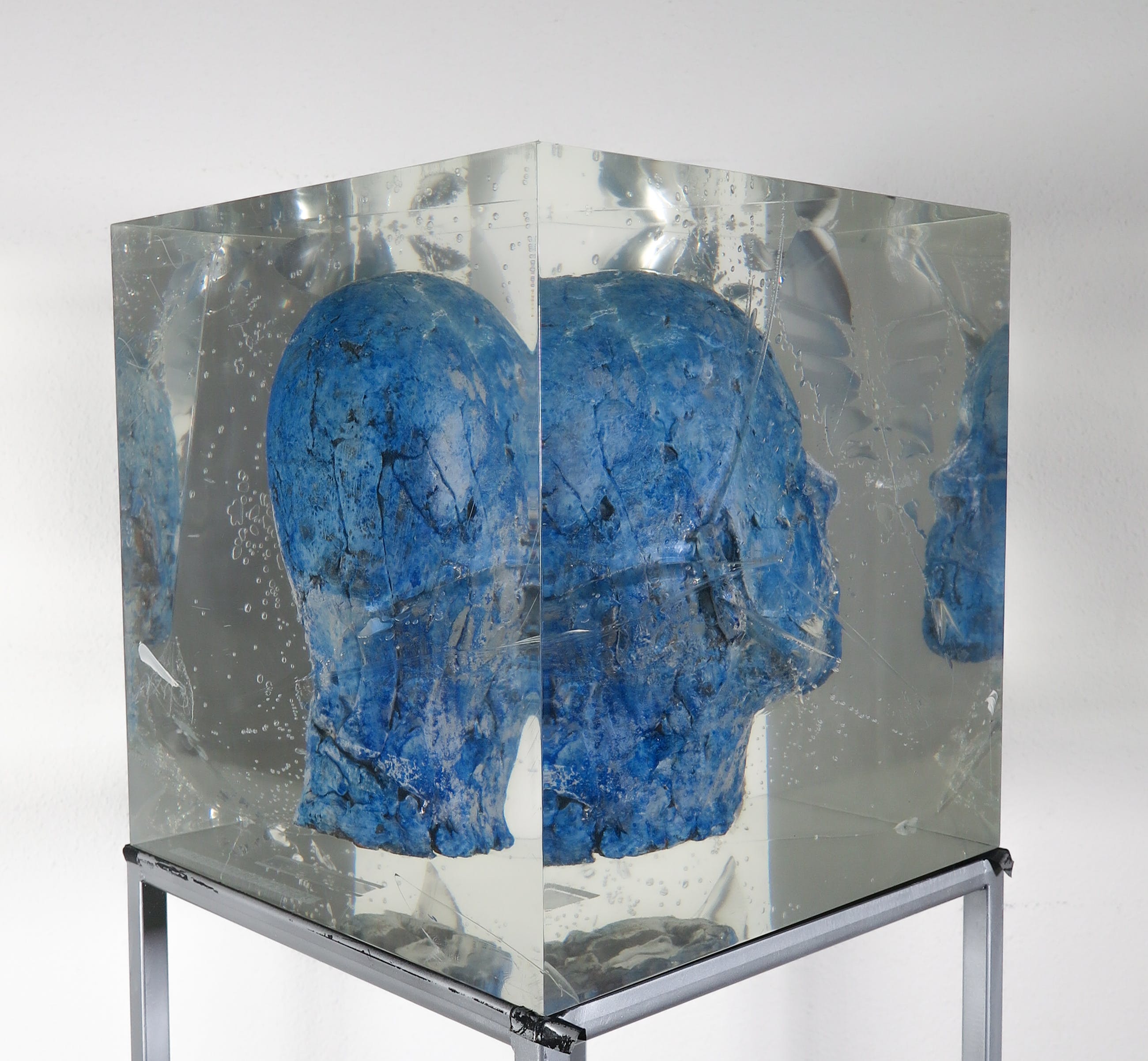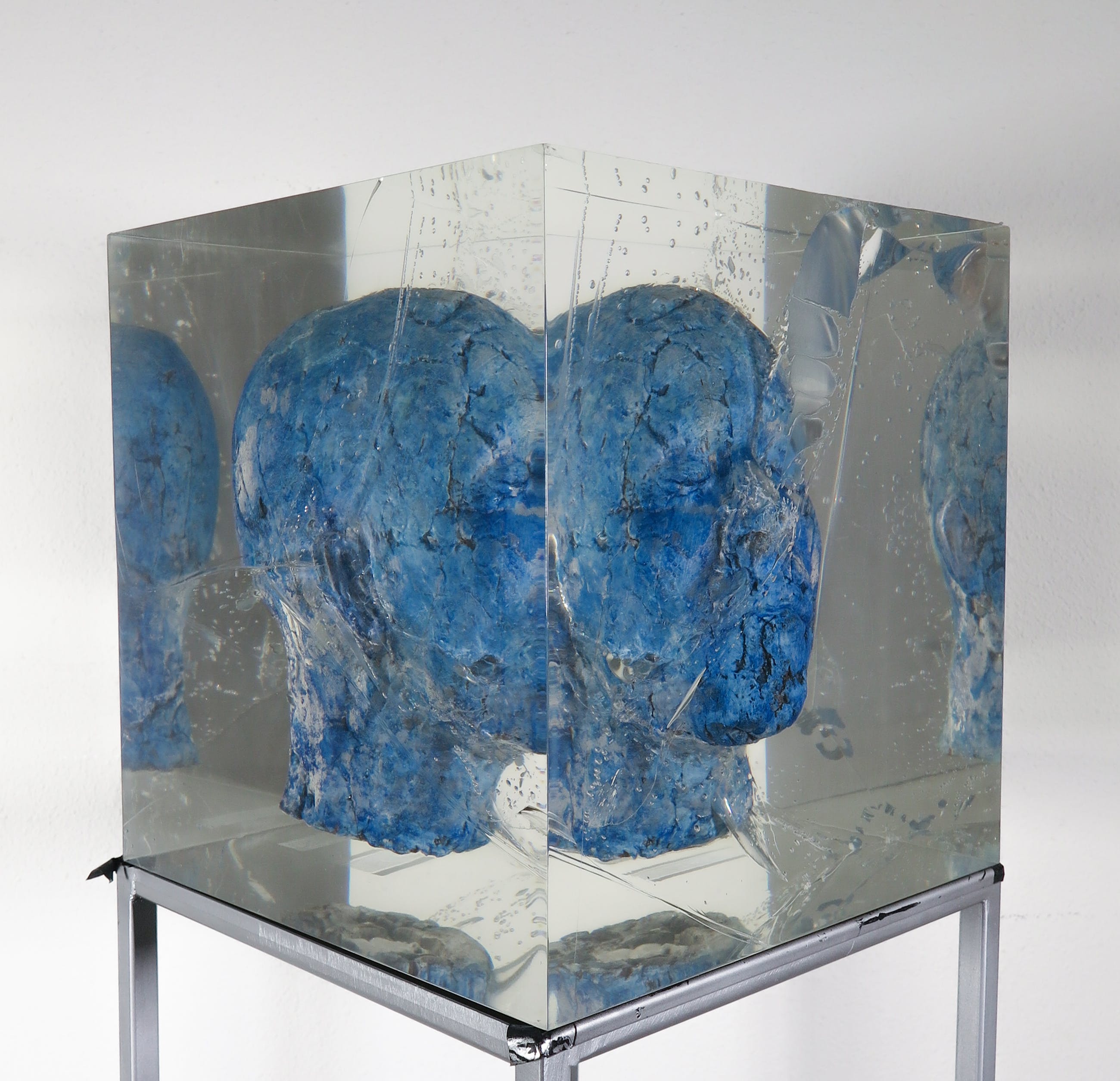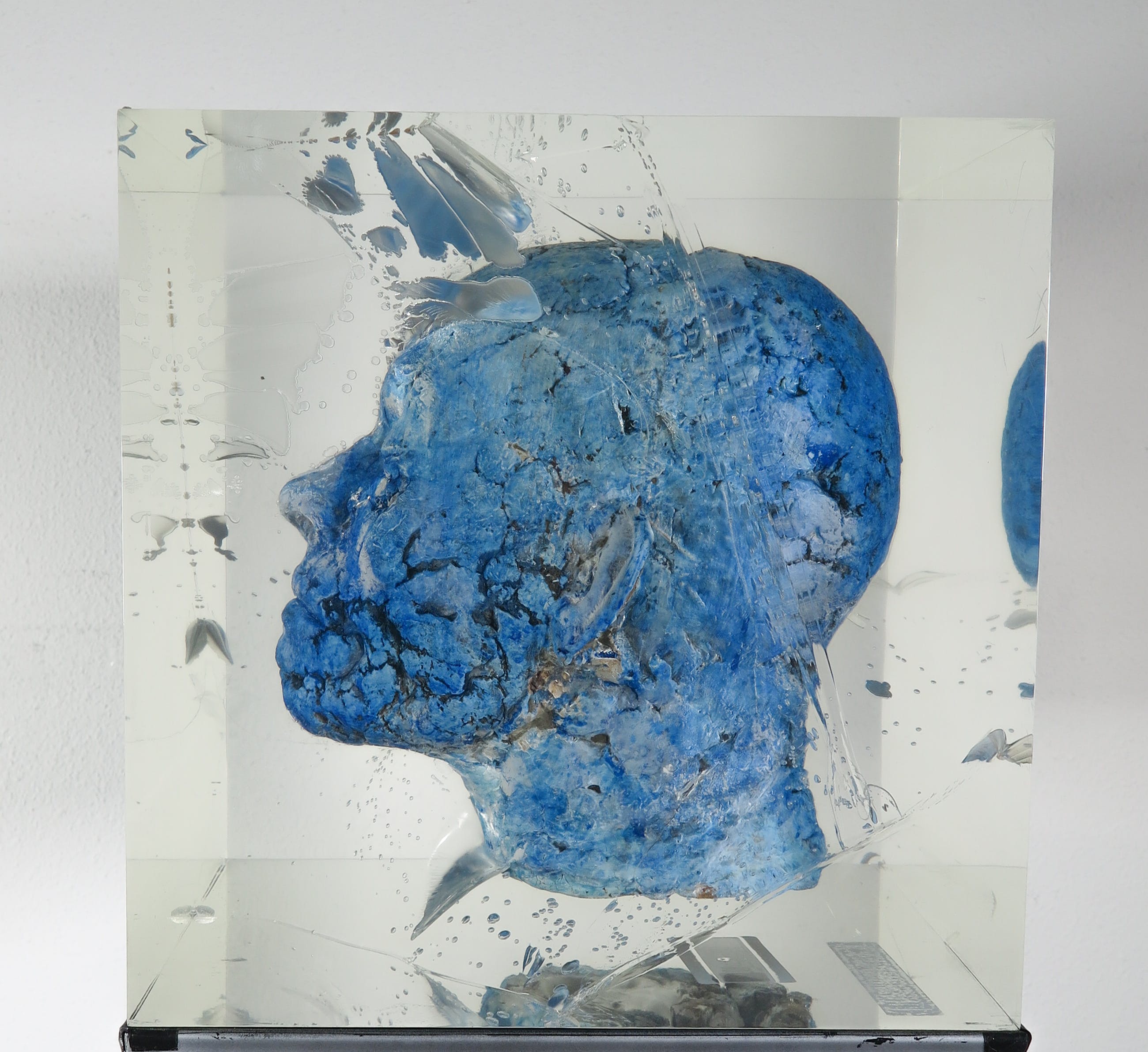 | Het hars lijkt een beetje vergeeld/verkleurd te zijn. Door het hars lopen meerdere naden/'barsten'. Dit zijn ons inziens geen beschadigingen, maar is dit ontstaan tijdens het gieten van de hars. De bovenzijde van het blok is beplakt met zilverkleurige spiegelende folie. Deze heeft enkele vlekjes/beschadigingen en laat een beetje los. | |