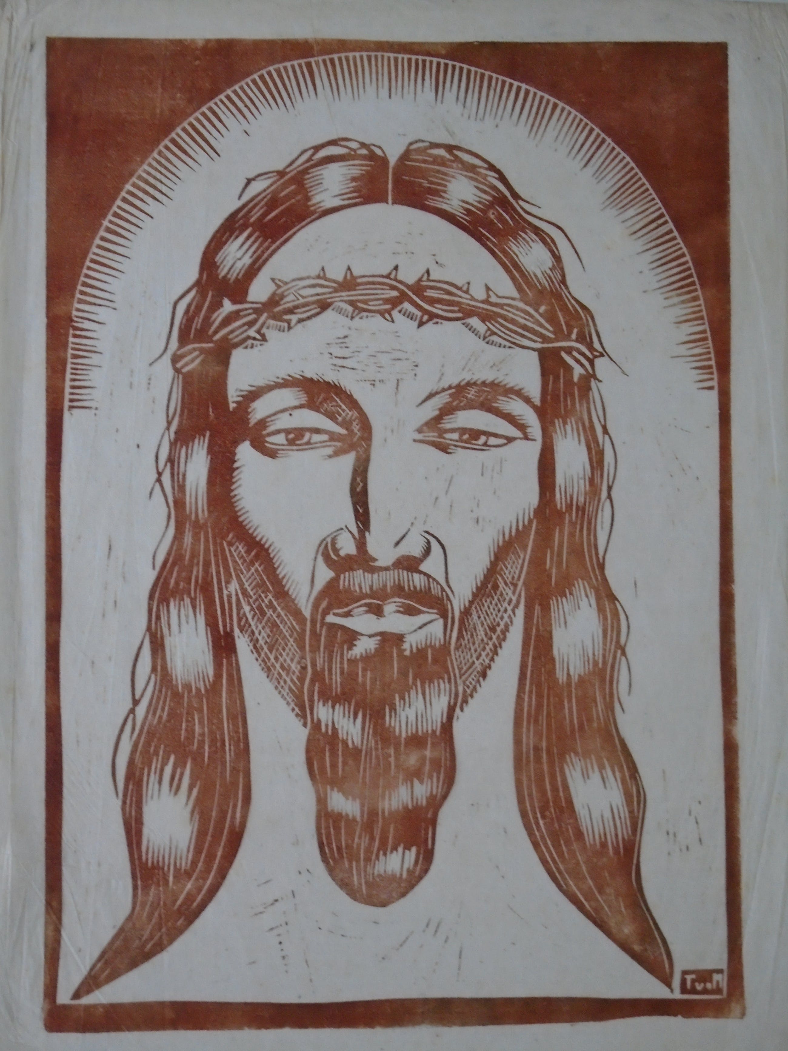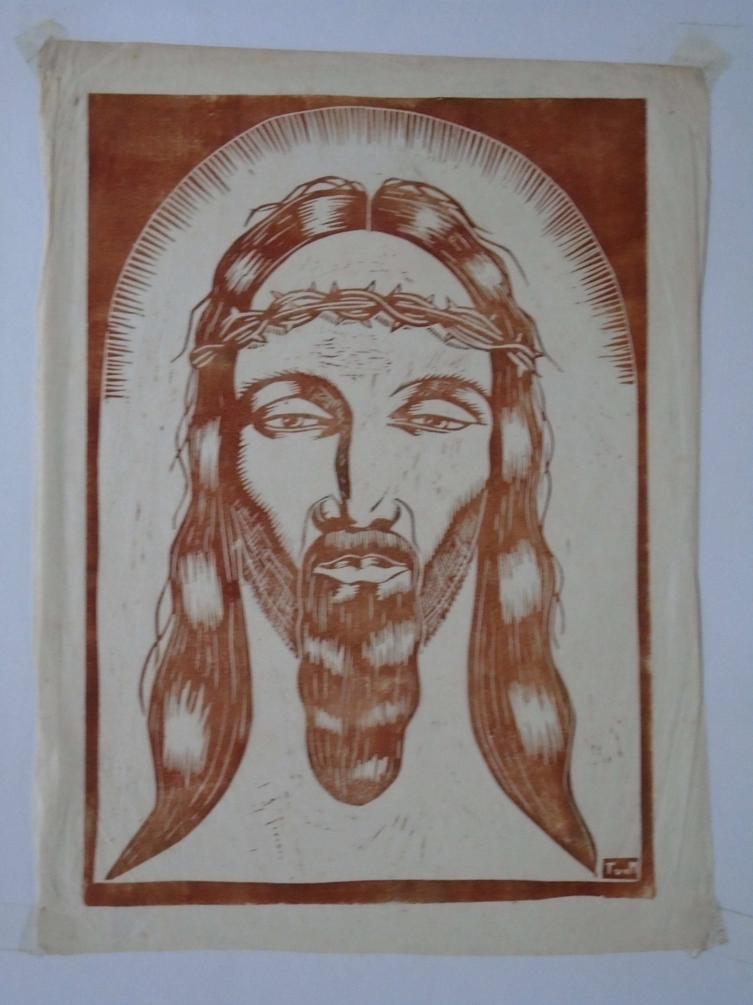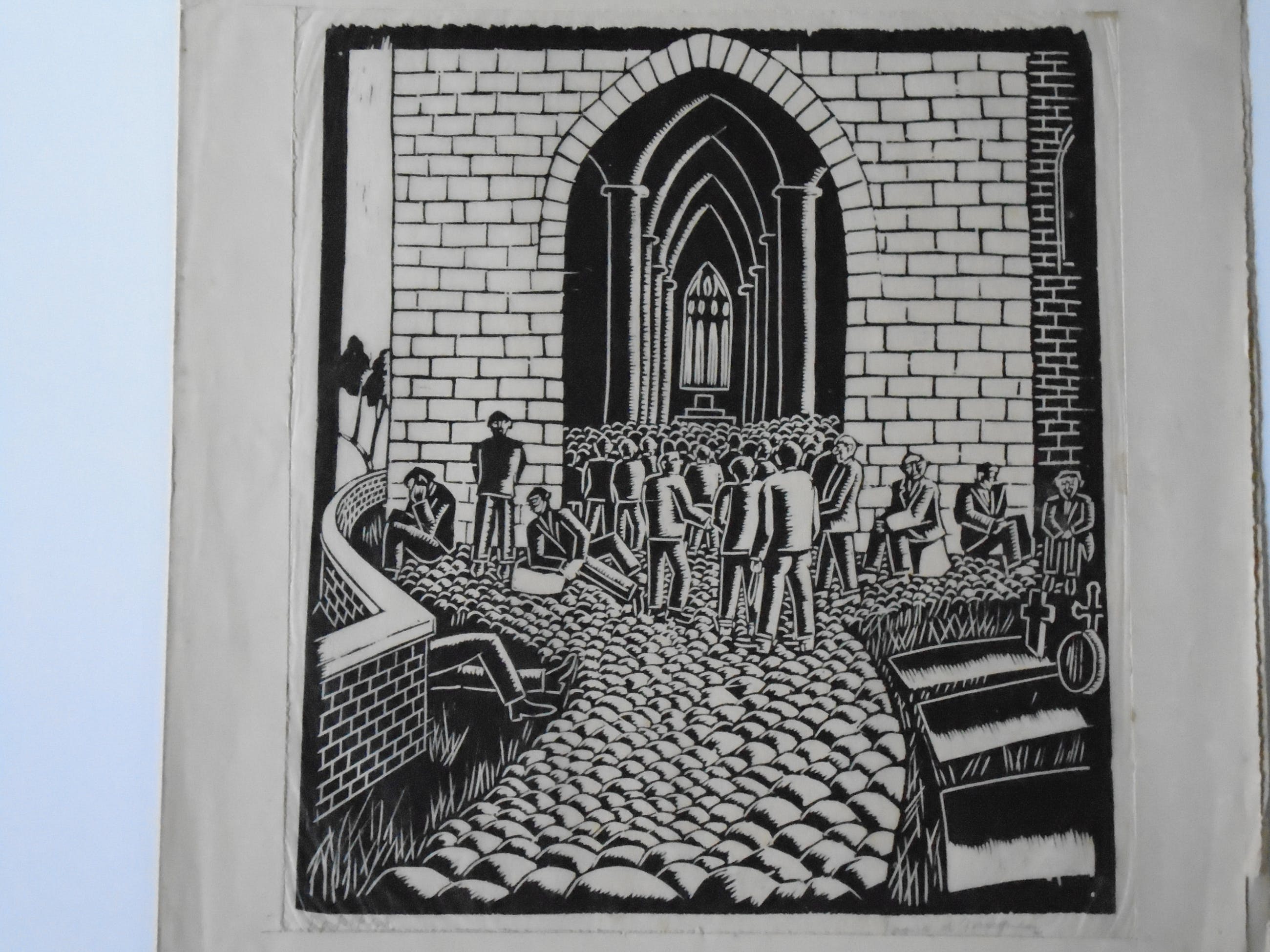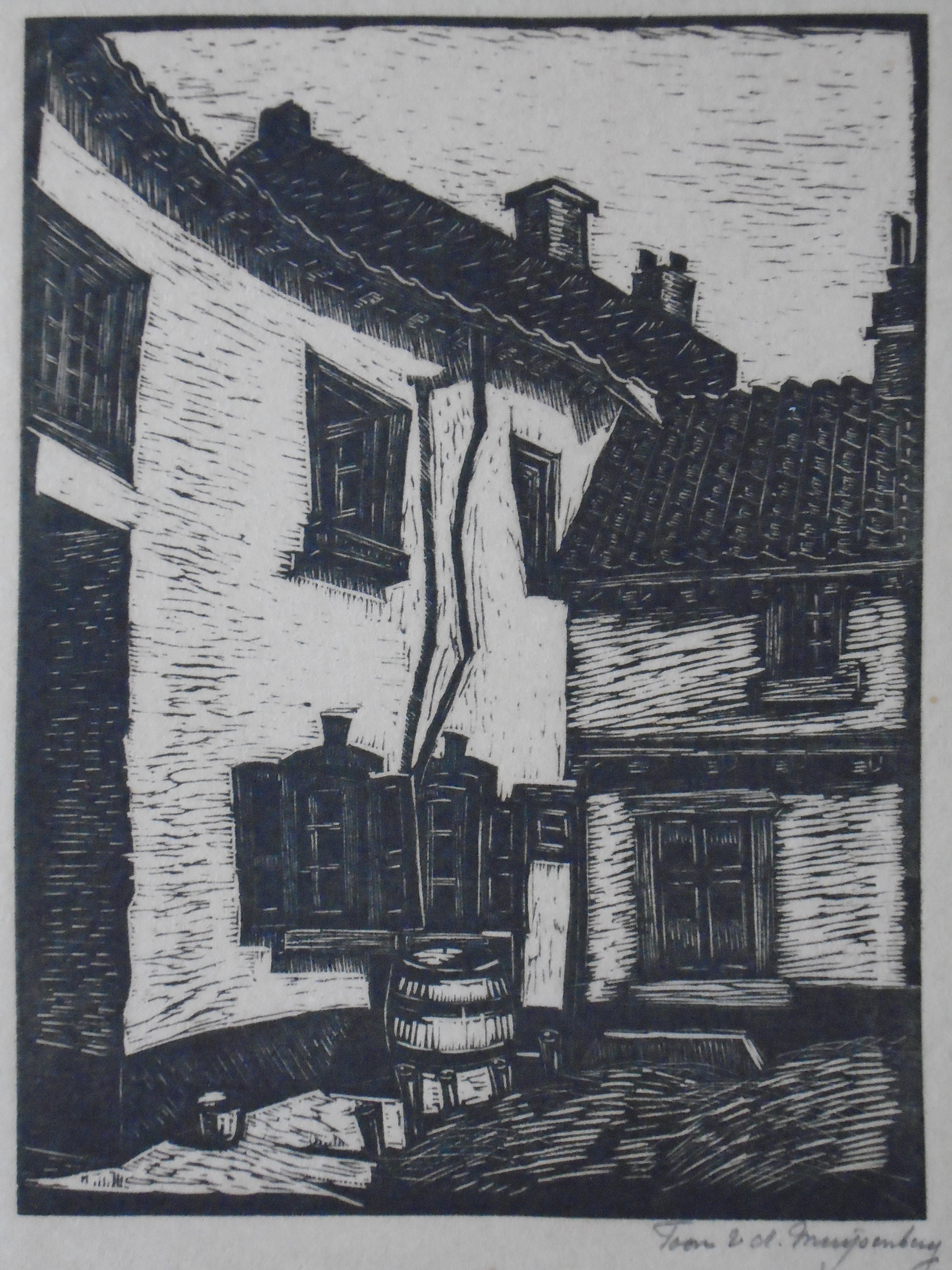 Drie houtsneden door Toon van de Muijsenberg.1. Dorpskerk, potlood gesigneerd rechtsonder. Getiteld linksonder. Beeldmaat 31 x 28 cm. Bladmaat 41 x 38 cm. Onder passe partout.2. Binnenplaats, potlood gesigneerd rechtsonder. Beeldmaat 20 x 15 cm. Bladmaat 27 x 22 cm. Onder passe partout.3. Christuskop, initialen in het blok rechtsonder. Beeldmaat 36 x 25 cm. Bladmaat 40 x 30 cm. Losbladig.