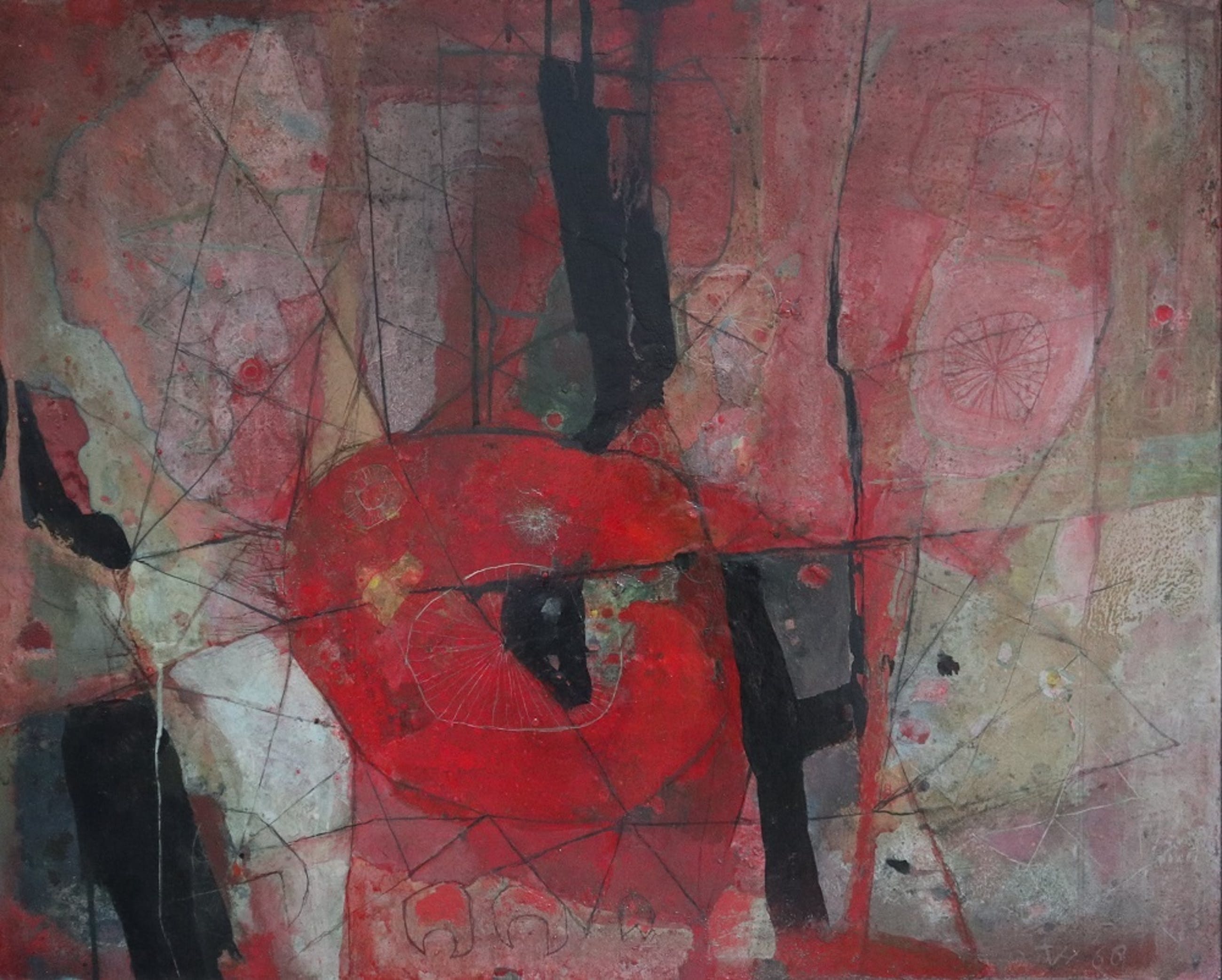 Een abstract schilderij van Toon van Ham die ook naam maakte als pottenbakker. Schilderde met veel gevoel voor kleur aanvankelijk figuratief later in zijn carrière abstract. Gesigneerd en beschreven aan de achterzijde. Direct van de kunstenaar door de vorige eigenaar aangekocht.