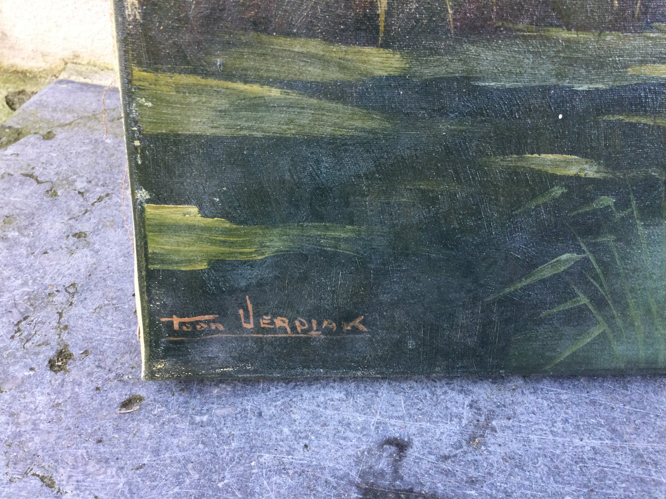 | Doek bevat oppervlaktevuil en verkleurde vernis door de tijd, craquelures, spieraamdoorslag bovenzijde, randschade met verfverlies door ontbreken lijst. | |