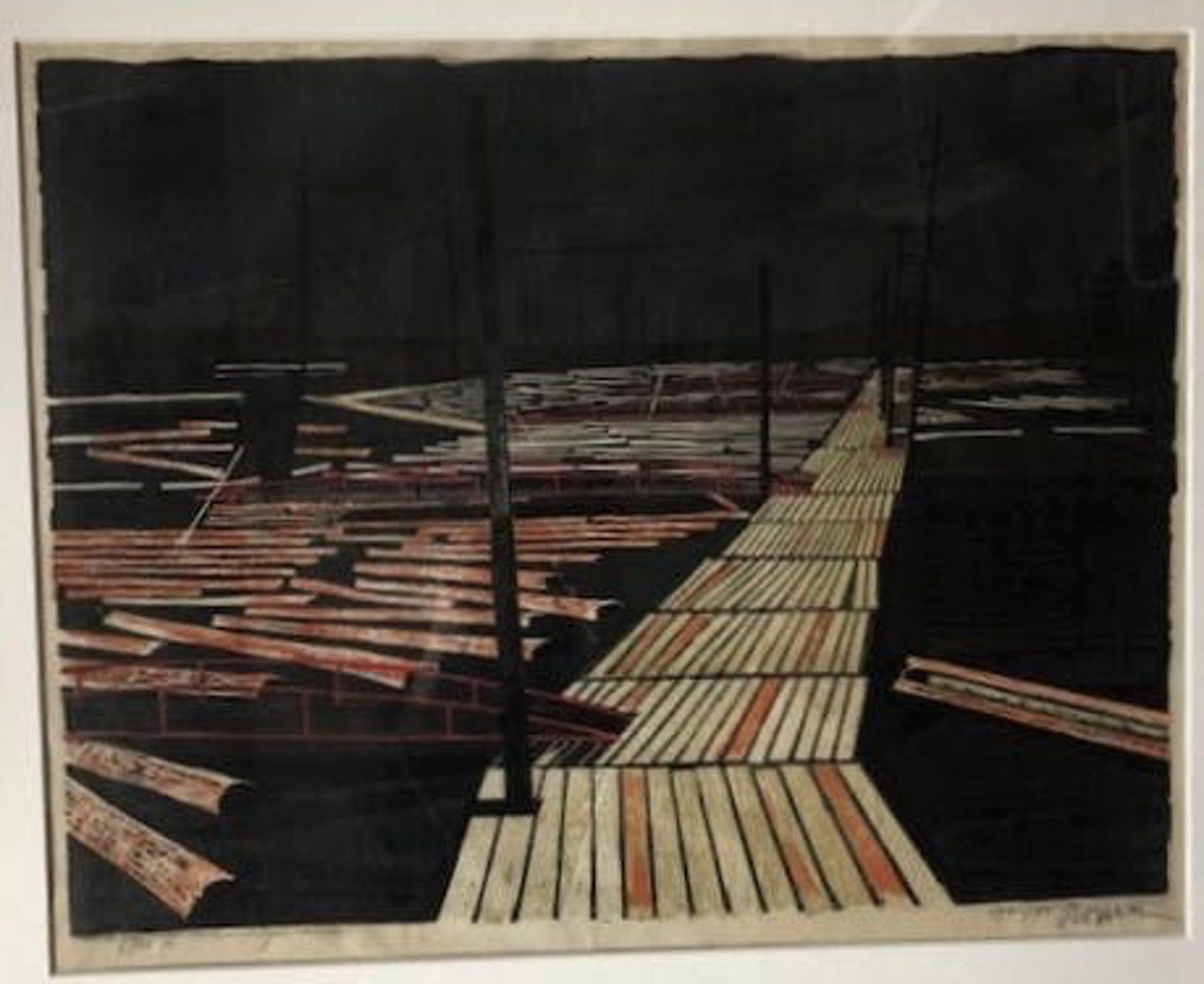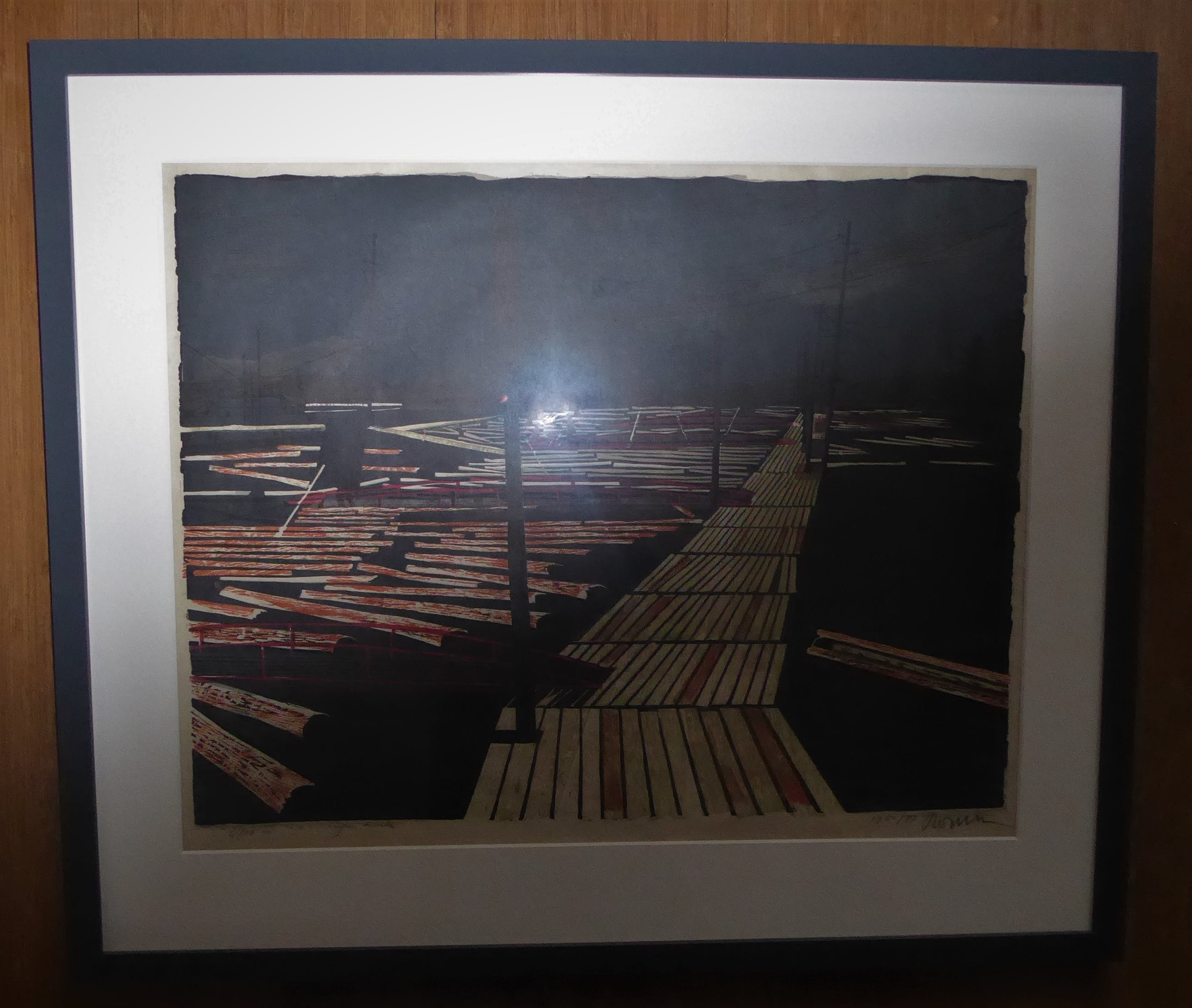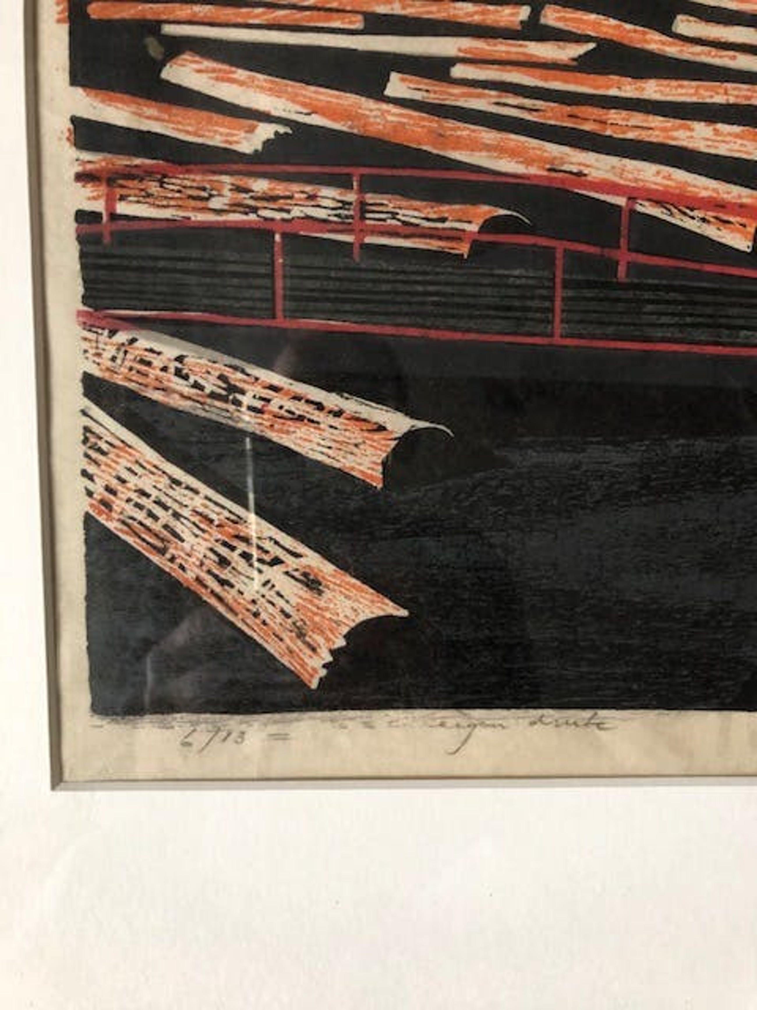 Bekendste hout-/linosnede van belangrijk graficus (afgebeeld in Openbaar kunstbezit 1963 en ook in standaardwerk over Rotterdamse kleurgrafiek 'Sterk van kleur' van Ida Jager, p. 225). Linksonder in potlood '6/13' en 'eigen druk'. Rechtsonder '1962/73' en signatuur. Modern fraai ingelijst in passe-partout en neutrale zwarte houten lijst. Foto met lijst heeft flitsvlek. Verlaagde prijs!