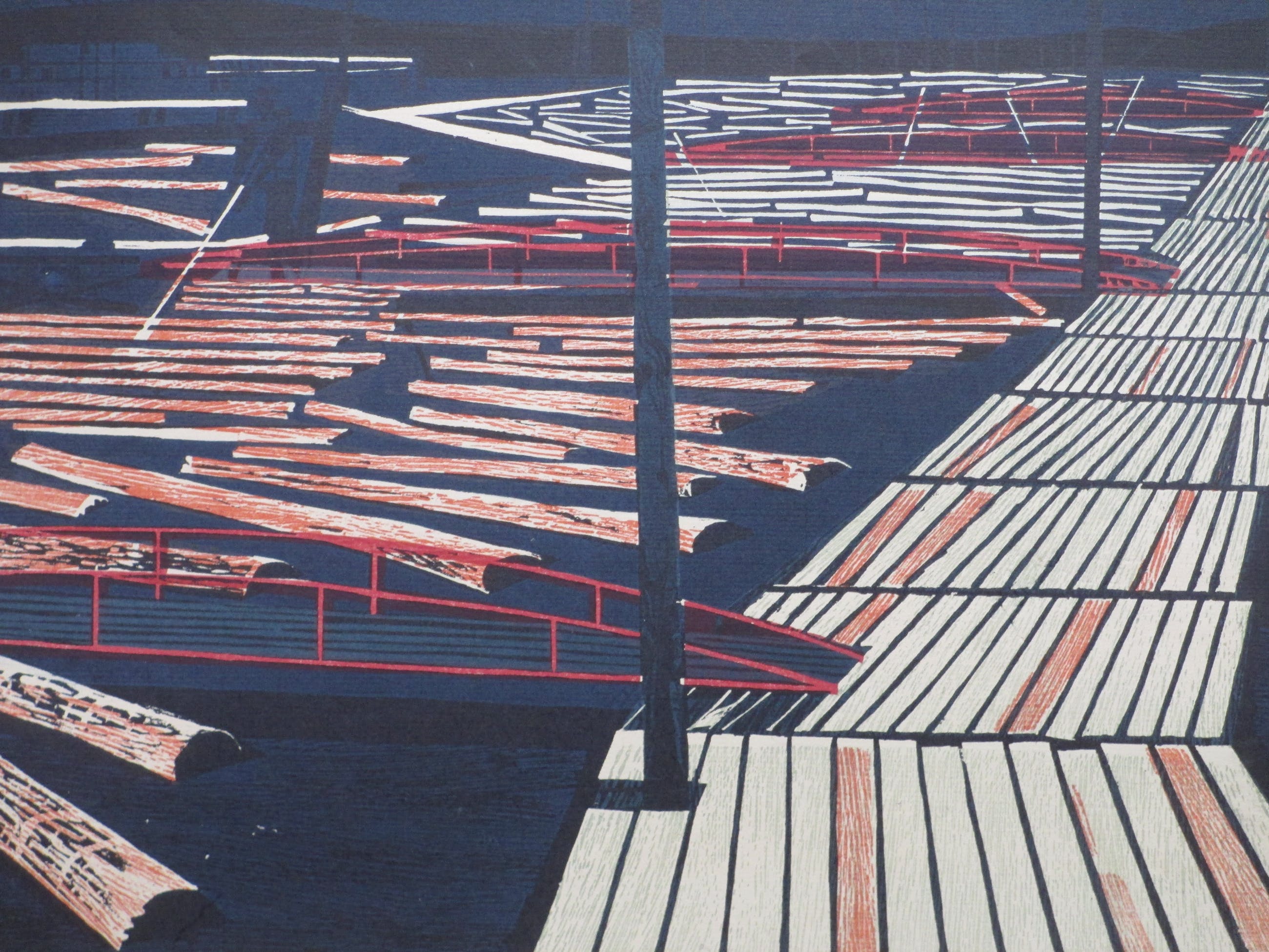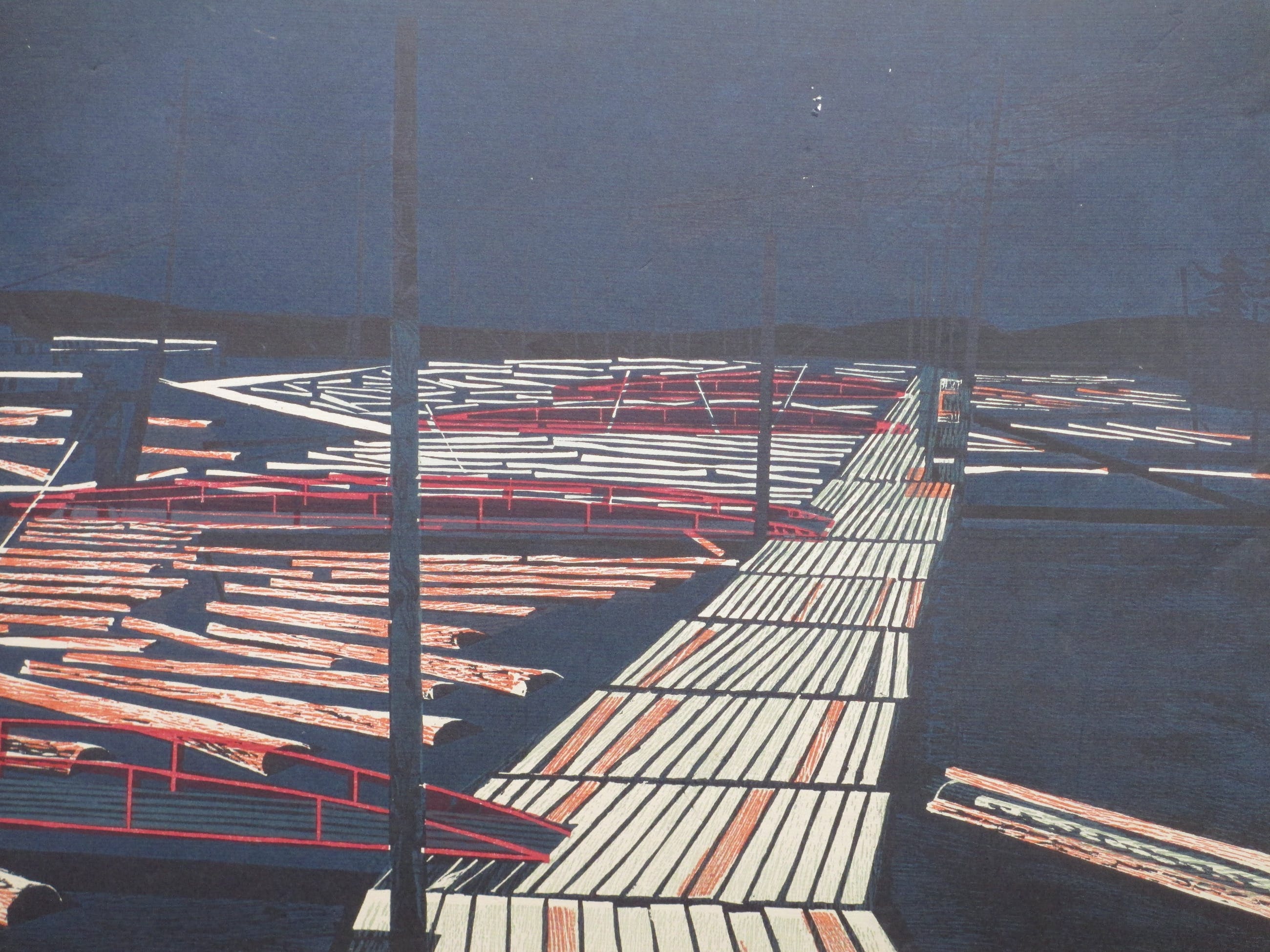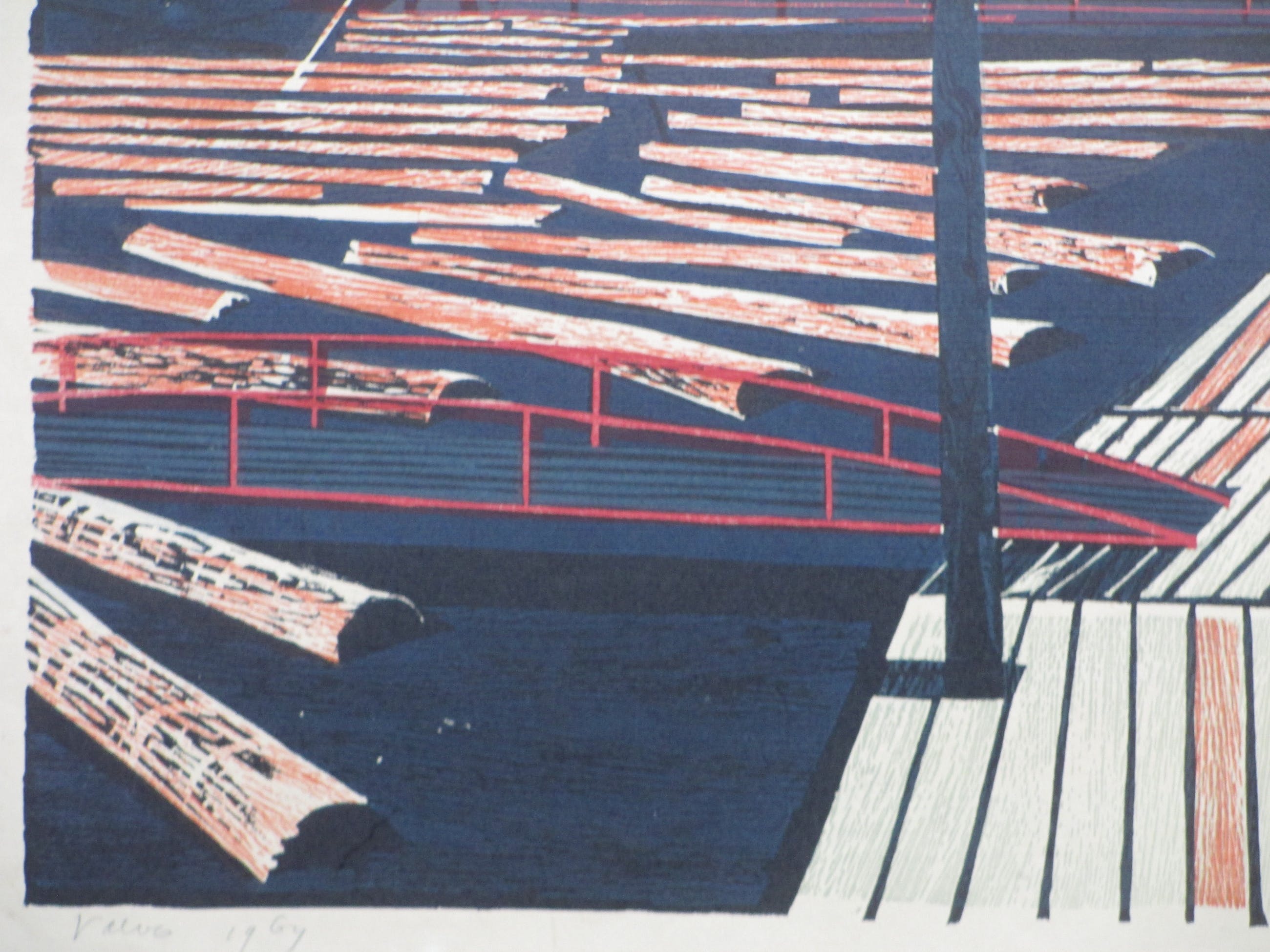 Kleurenhoutsnede door Toon WegnerVoorstelling van een houthaven in FinlandLosbladig, beeldmaat 42x54, bladmaat 54x65Gesigneerd in potlood r.o. ' T Wegner' Herkomst en datering l.o. : ' Vaevo' en ' 1964' Authenticiteit volledig gegarandeerd