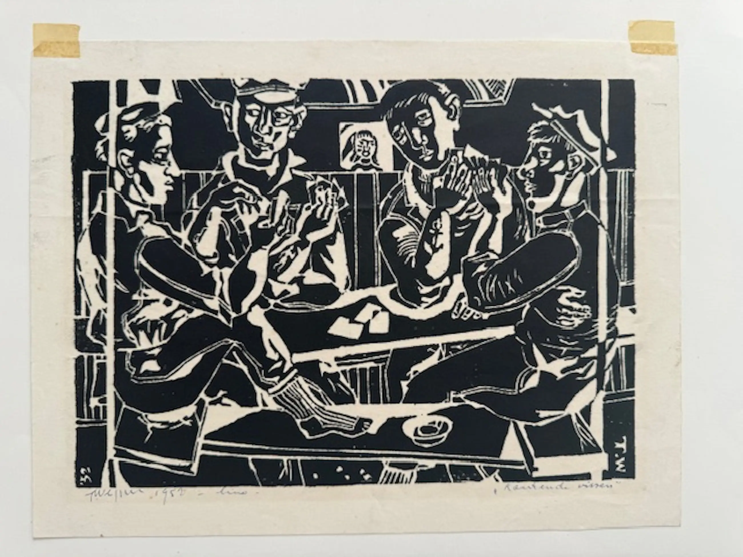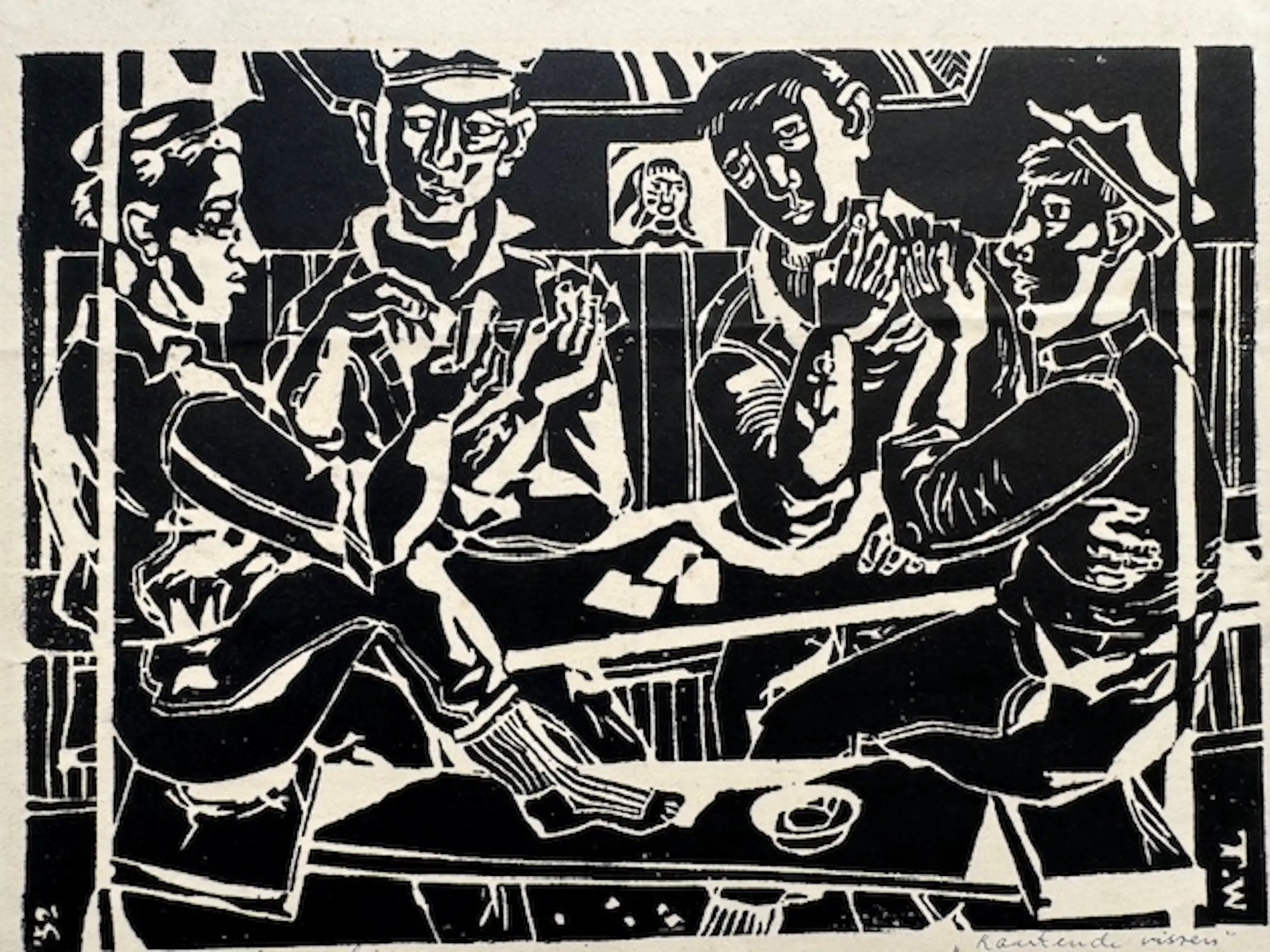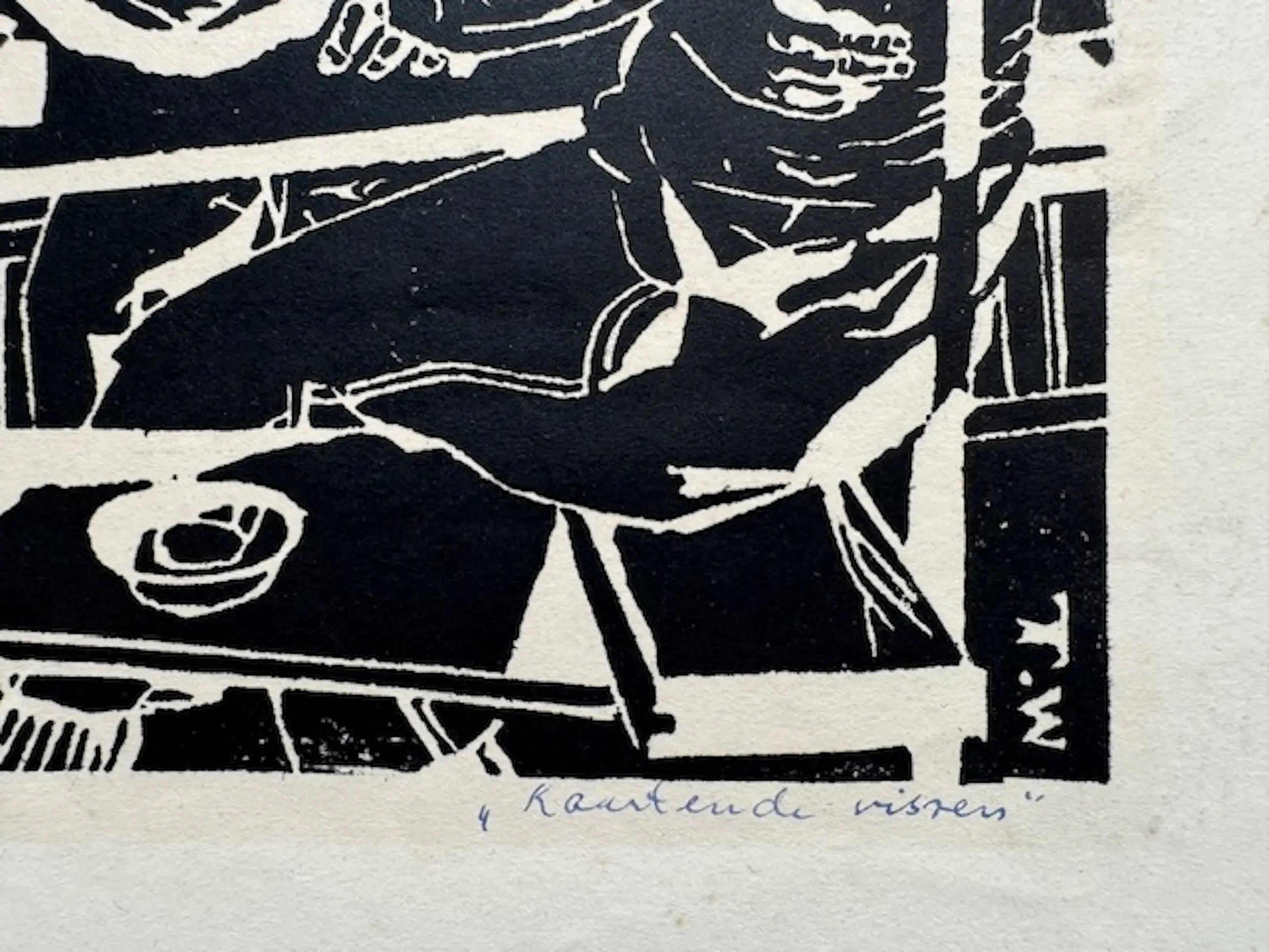Fraaie expressieve linosnede van rustende vissers in een bar zo lijkt kaartend en drinkend. Goed gevat in een wat zeldzamere voorstelling.