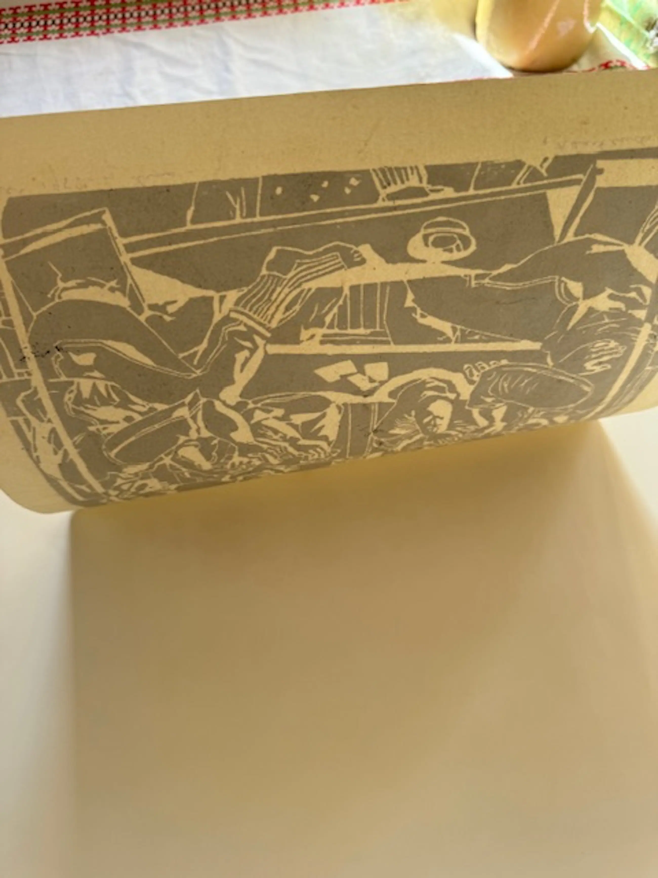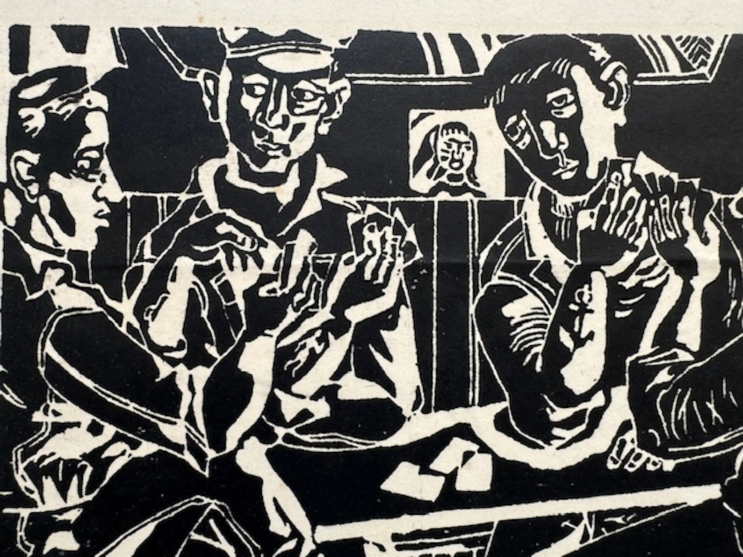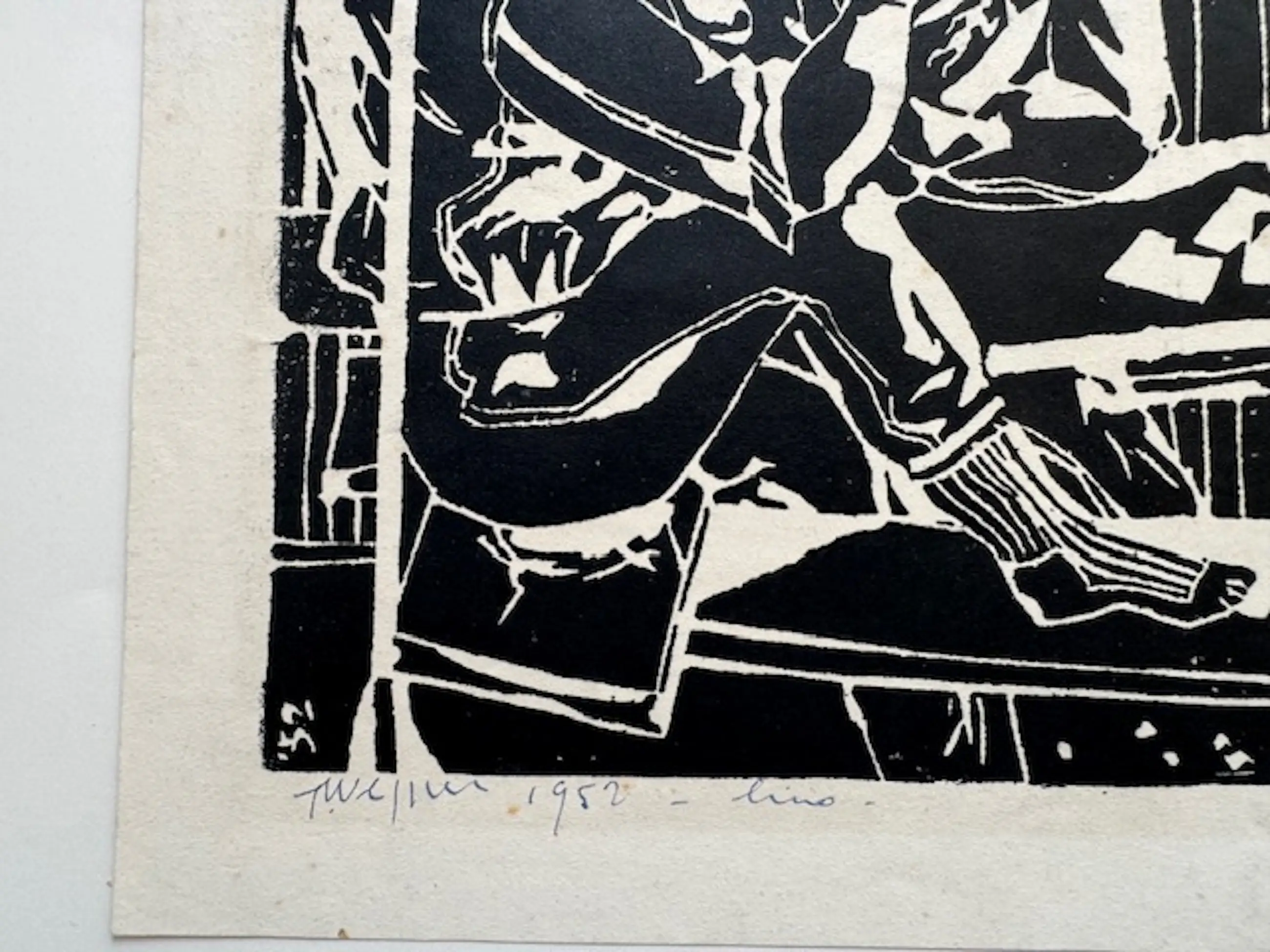 Fraaie expressieve linosnede van rustende vissers in een bar zo lijkt kaartend en drinkend. Goed gevat in een wat zeldzamere voorstelling.