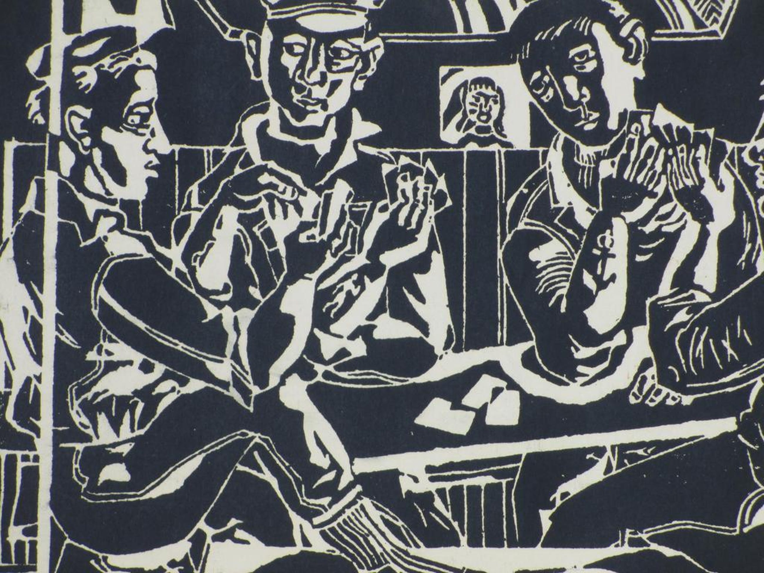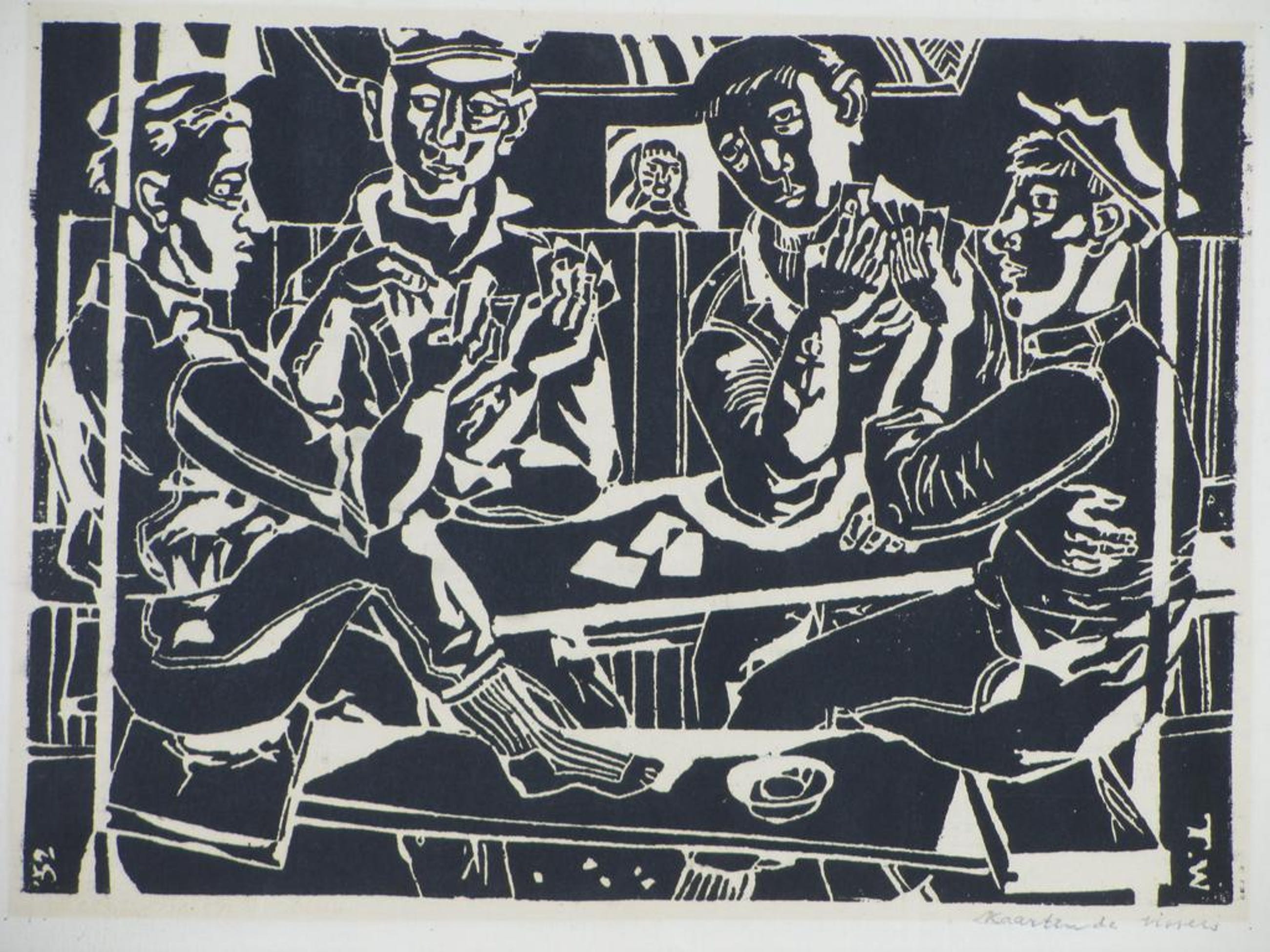 Gemonogrammeerd r.o. in de plaat 'T.W.' en getiteld in potlood 'Kaartende vissers'