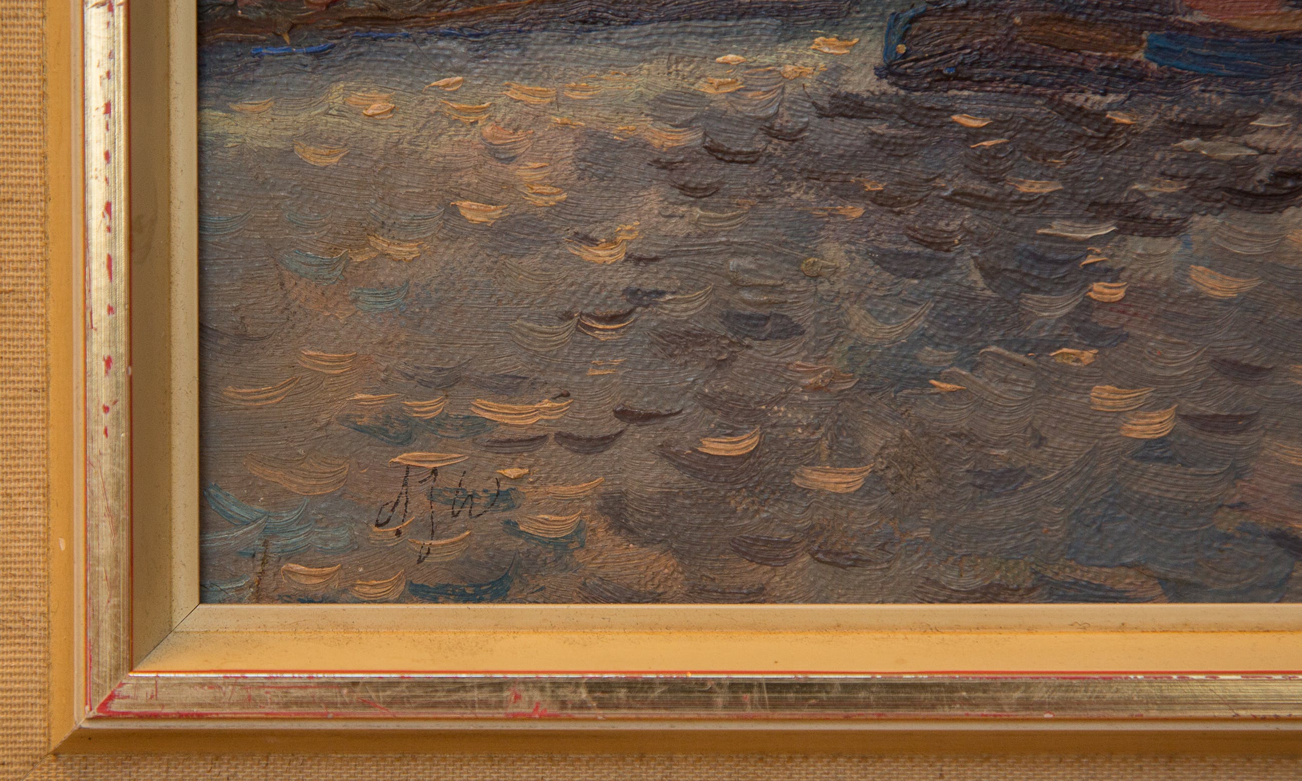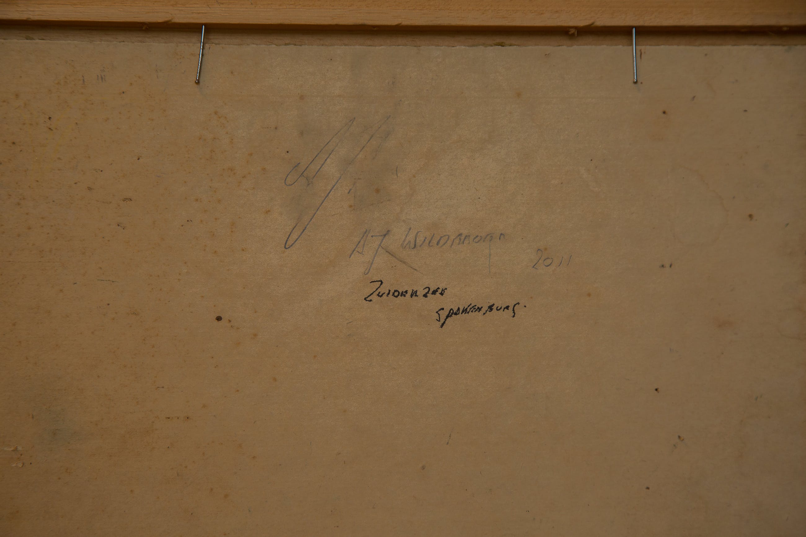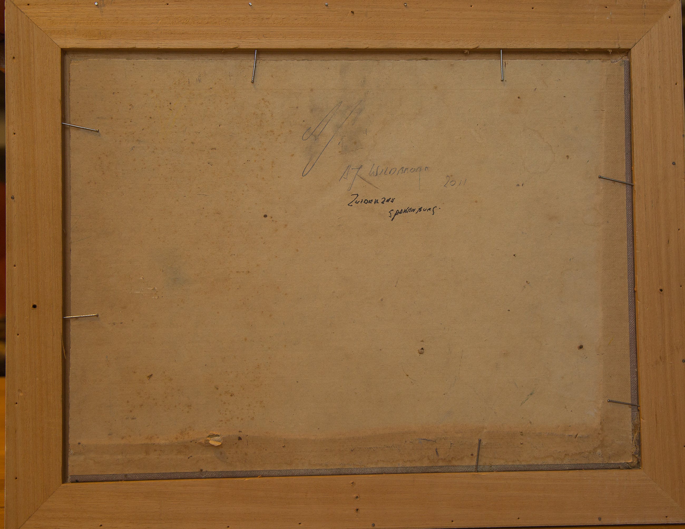 Het schilderij is in goede conditie, de lijst is beschadigd.