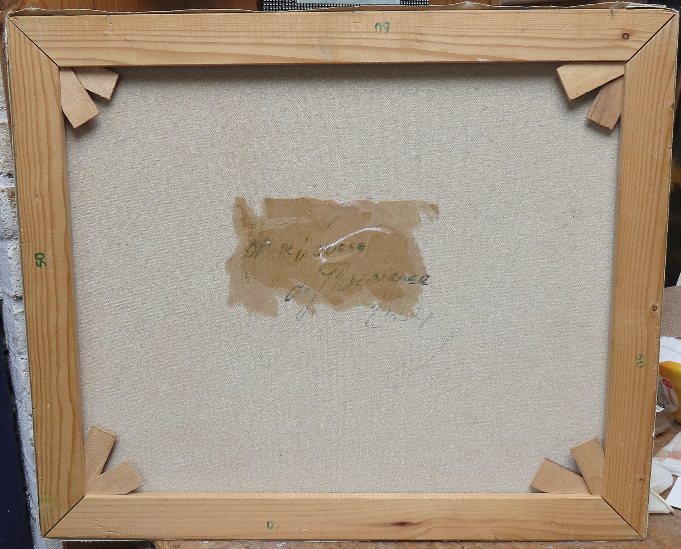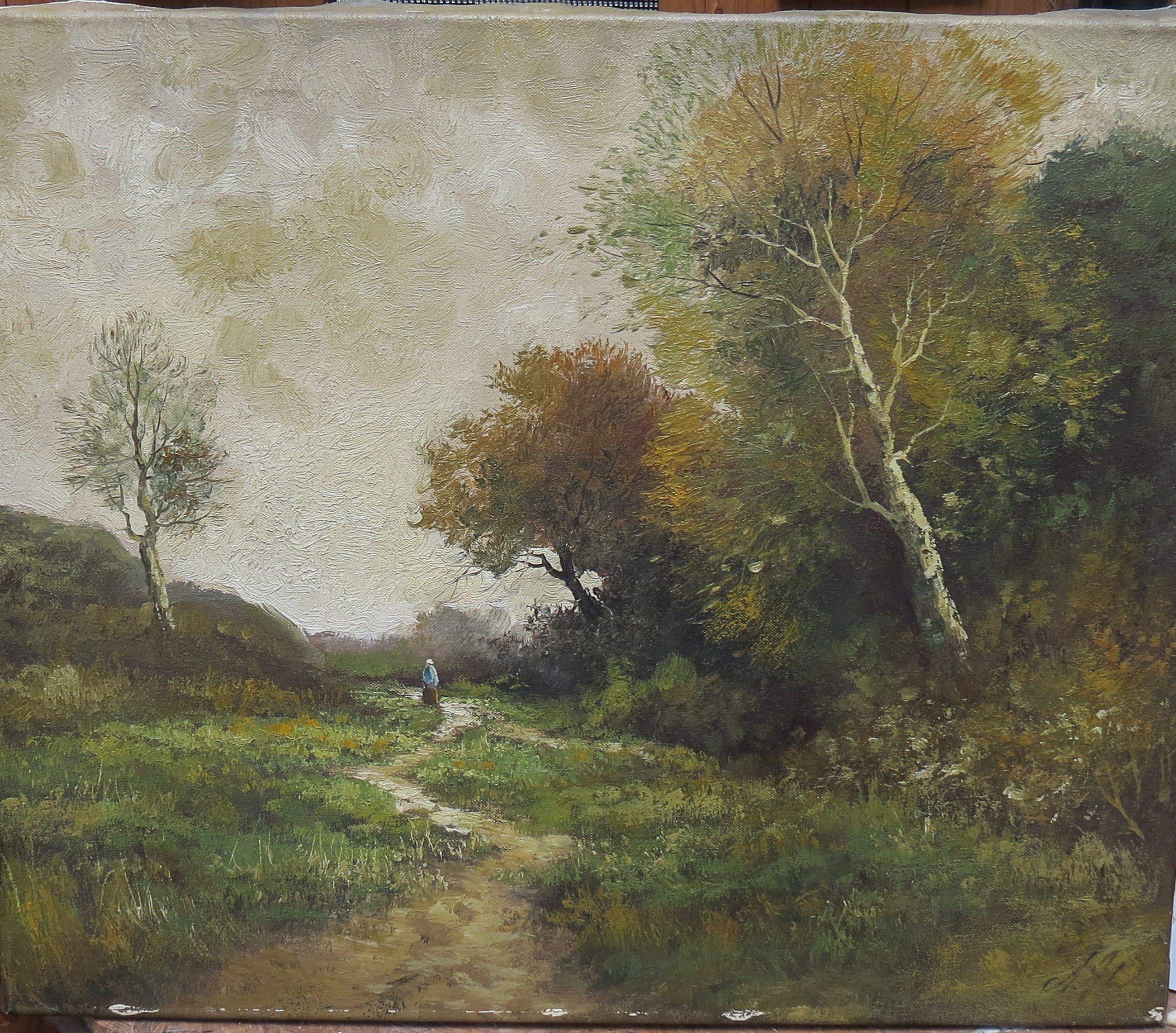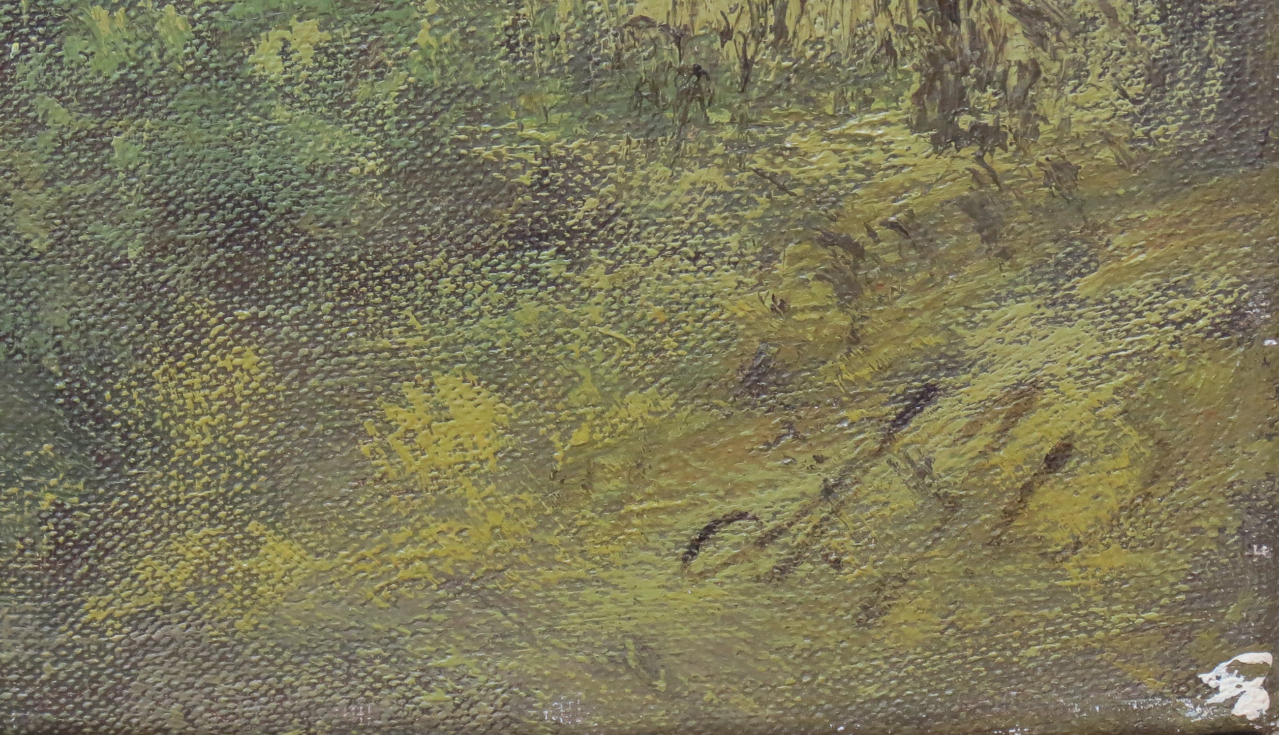 Het schilderij heeft een goede conditie, enkele beschadigingen veroorzaakt door afname van de lijst.